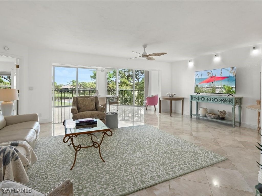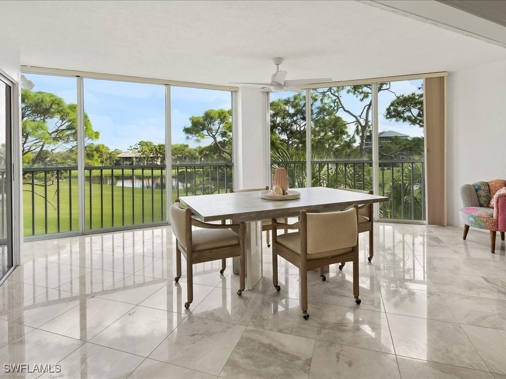 Within the prestigious enclave of Wedgewood at Bonita Bay, residence number four zero three at Two Six Nine One Zero Wedgewood Drive offers a refined interpretation of resort-style condominium living, framed by sweeping lake and golf course views. This beautifully remodeled three-bedroom, two-bath residence is thoughtfully designed to capture light, scenery, and an effortless indoor-outdoor lifestyle. Luxury Vinyl and polished marble flooring flow throughout the sunlit living spaces, creating a sophisticated yet inviting atmosphere. The updated kitchen is both elegant and functional, featuring granite countertops, an under-mount sink, refined cabinetry, and stainless-steel appliances, all positioned to enjoy tranquil water and fairway vistas. Adjacent dining and living areas open seamlessly to the lanai, which has been thoughtfully converted into extended interior living space with sliding glass doors along the screened enclosure, ideal for entertaining or quiet relaxation. The primary suite is a serene retreat, highlighted by a grand picture window that perfectly frames lush greens and reflective ponds. Two additional guest bedrooms provide comfort and flexibility for visitors or a home office. Modern conveniences include a well-maintained air-conditioning system installed in two thousand sixteen and a water heater replaced in two thousand twenty-one, ensuring peace of mind. A rare private two-car enclosed garage adds exceptional value and convenience. Residents of Wedgewood enjoy a resort-style pool, tennis courts, screened pavilion, and gas grilling area set within a park-like landscape. Beyond, Bonita Bay offers waterfront parks, a private beach, marina access to the Gulf, and optional membership to the Bonita Bay Club with championship golf, dining, fitness, and spa amenities. Ideally located near dining, shopping, and regional travel access, this residence presents a compelling opportunity to embrace the elevated Bonita Bay lifestyle.