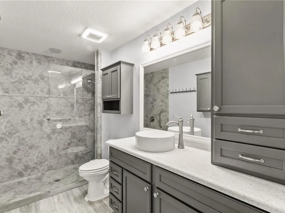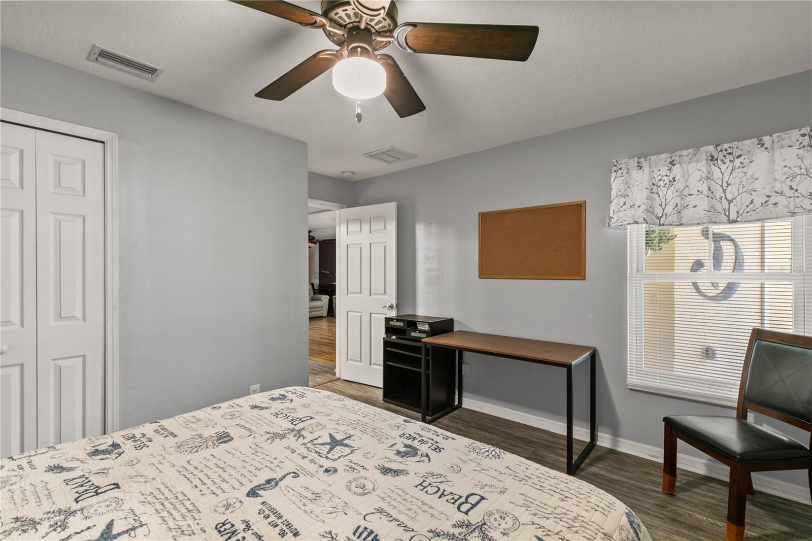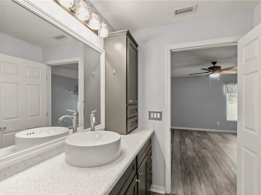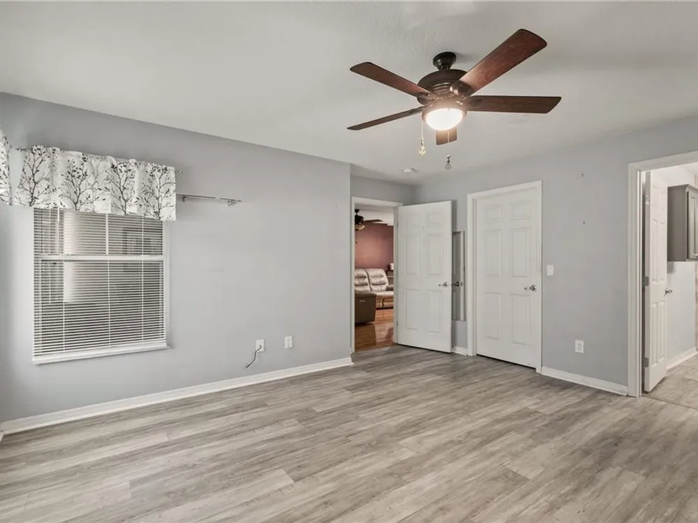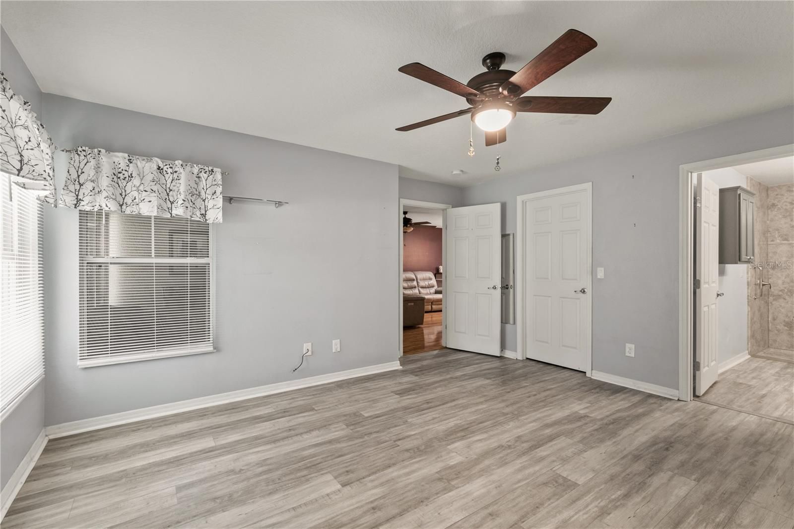 - Ceiling Fan(s), Kitchen/Family Room Combo, Open Floorplan, Main Level Primary, Solid Surface Counters, Solid-Wood Cabinets, Split Bedrooms, Stone Counters, Vaulted Ceiling(s), Walk-In Closet(s), Window Treatments