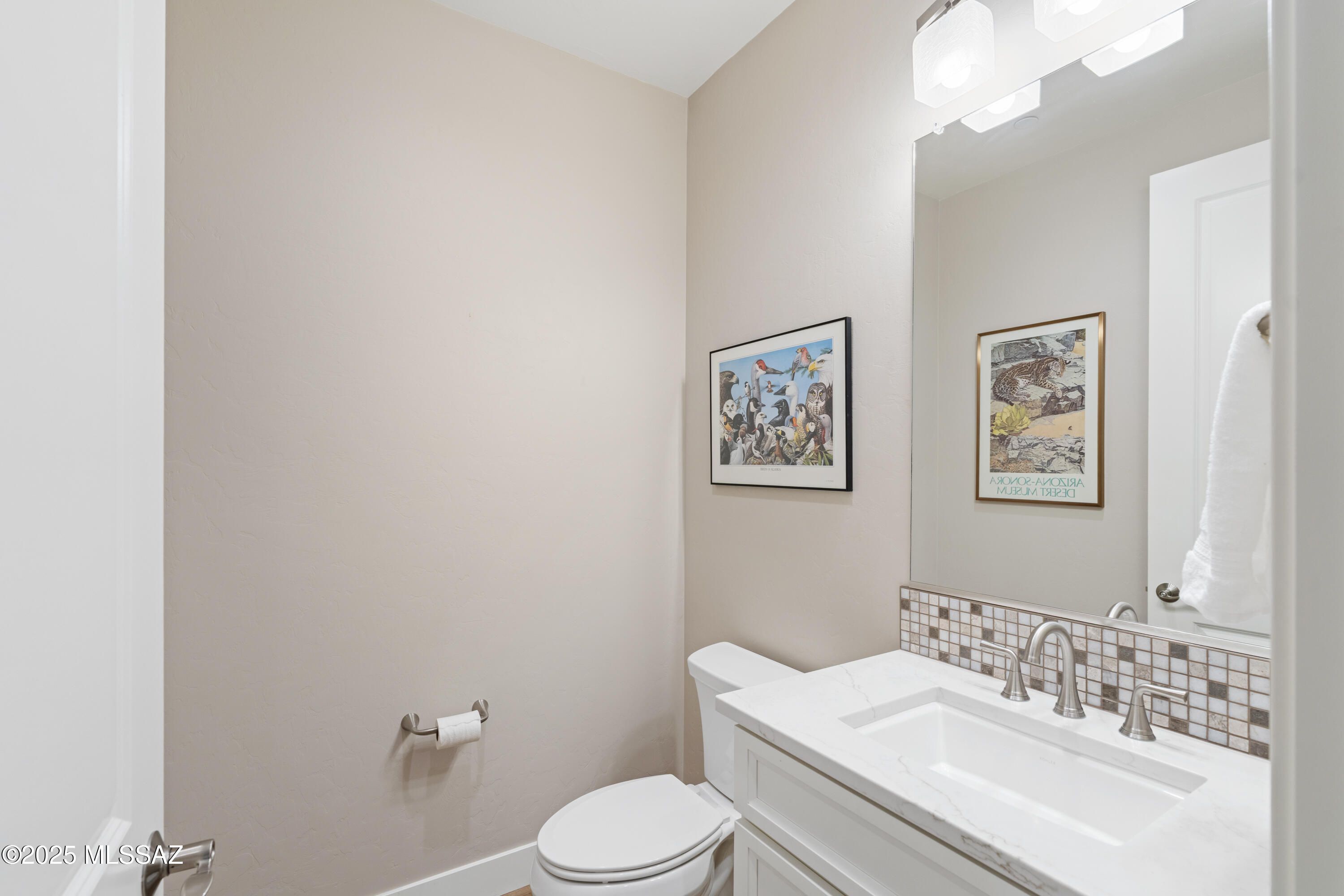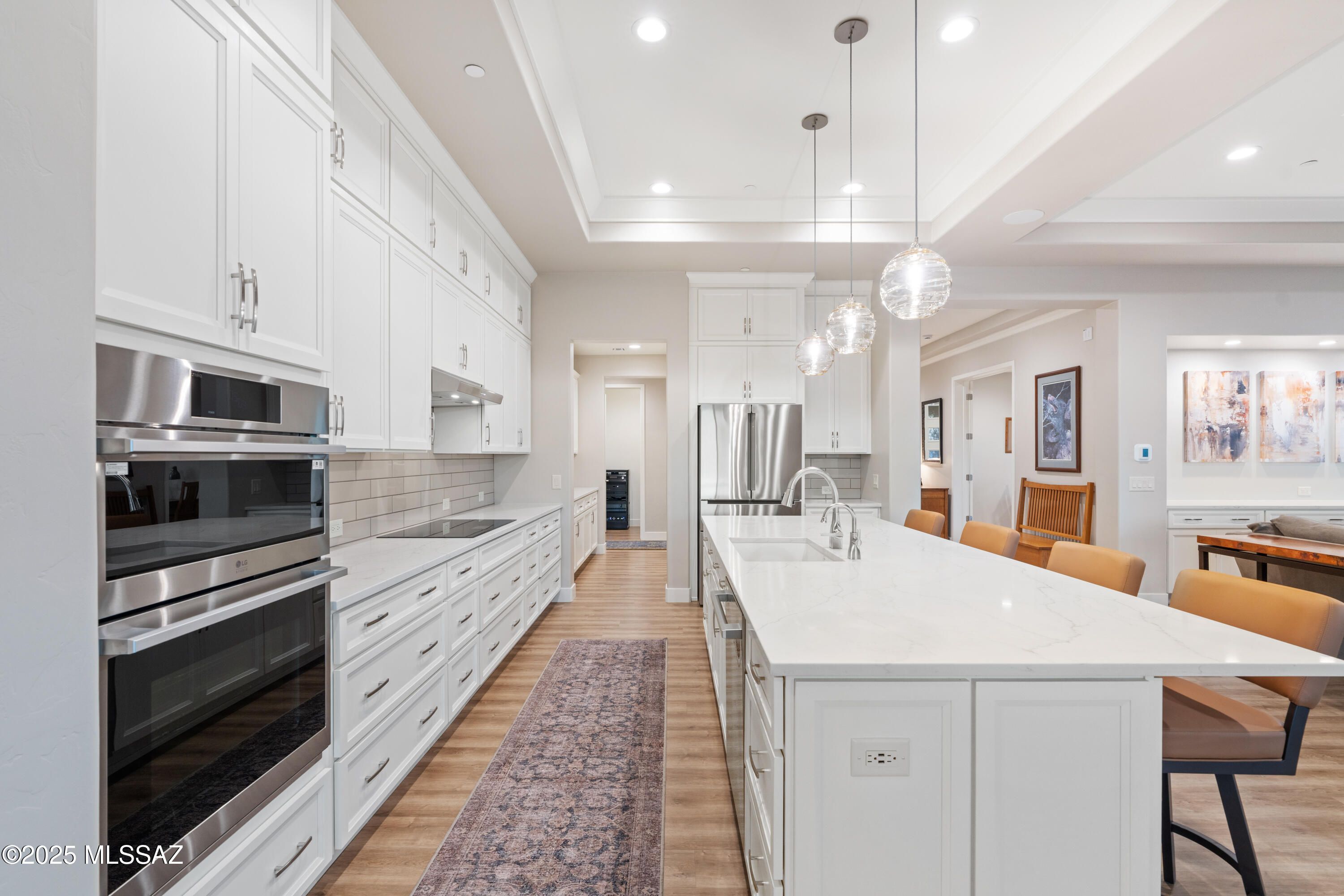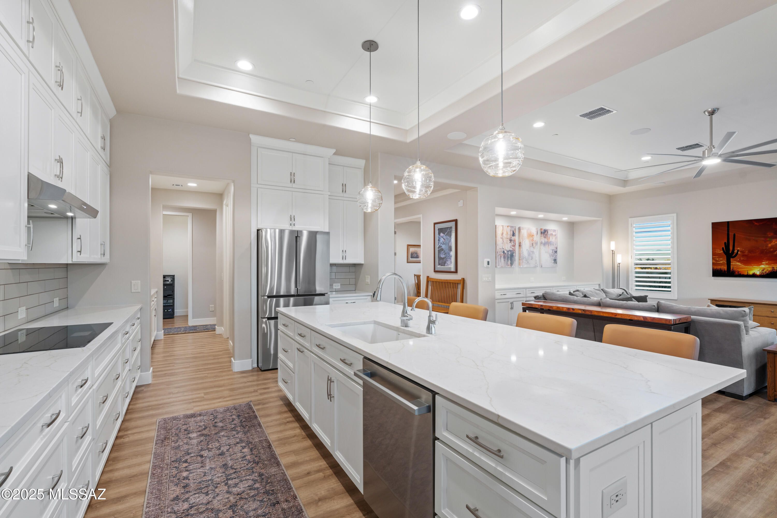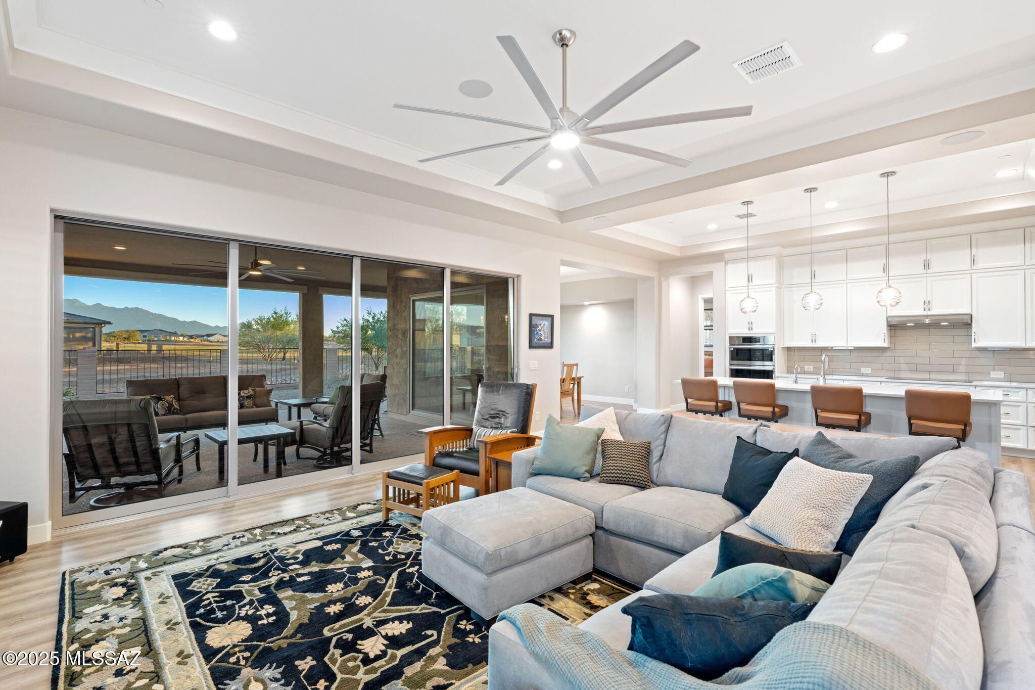 This exceptional 2024 residence presents 2 bedrooms, 2.5 baths, and 2,968square feet of impeccably curated living within Quail Creek, one of SouthernArizona's most sought-after active adult communities. A refined neutral palette,elevated finishes, and thoughtful design define the home, which offers twoprivate en-suite bedrooms, an expansive den, and a separate executive-styleoffice.The striking arrival experience features a stacked-stone facade and a dramaticmulti-panel chord-glass entry door. Inside, the open great room is both elegantand inviting, enhanced by recessed ceilings and expansive walls of glass createdby a stackable glass door that bathes the interior in natural light. Wide-plankluxury vinyl flooring flows seamlessly