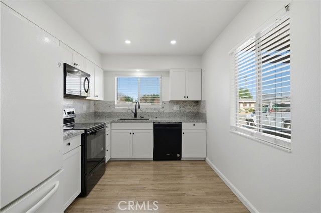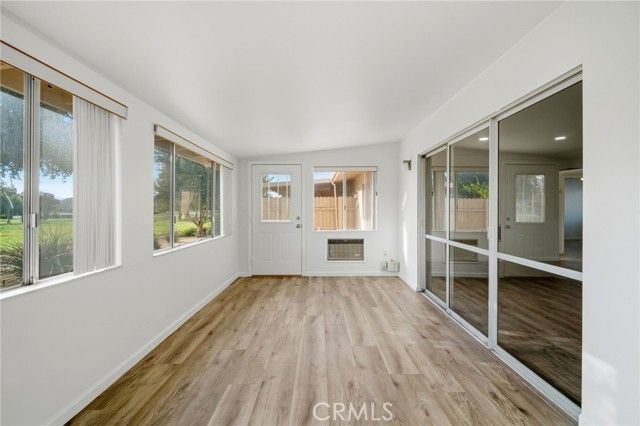 Remodeled and conveniently located 55+ senior home! The kitchen was completely redone in 2019 with brand new cabinets, granite counters, backsplash, and LED recessed lighting. There's also LVP flooring throughout the entire home. The living room is large and has about a 200 sq ft enclosed lanai to add additional living space to the home and has a connected laundry room with storage cabinets. There are two spacious bedrooms and the primary bedroom has a newer vanity. Situated conveniently in Menifee, just a couple streets away from shopping and restaurants and the backyard has a nice view of the golf course. The second HOA takes care of your water, trash, landscaping, exterior maintenance and the main HOA gives you all the wonderful amenities of the Sun City Civic Association!