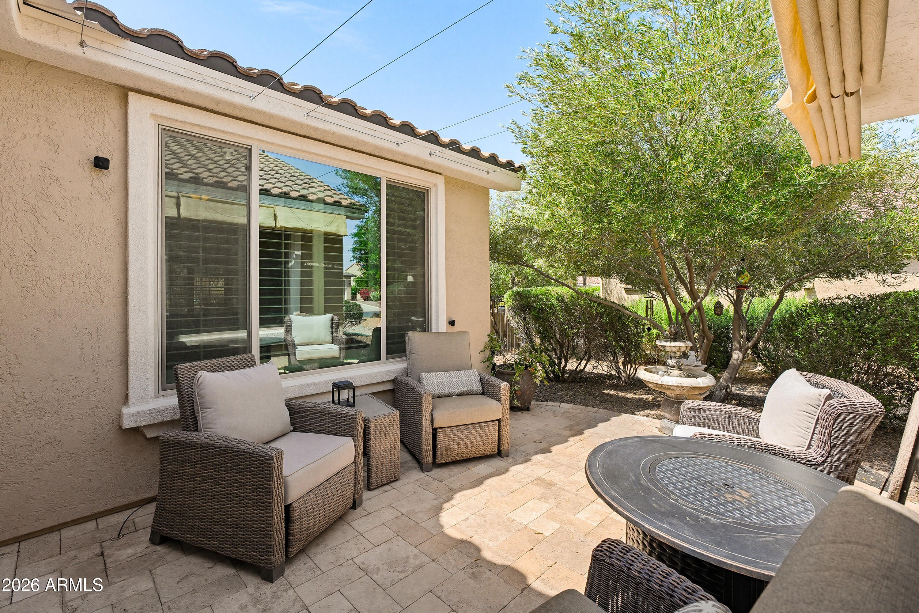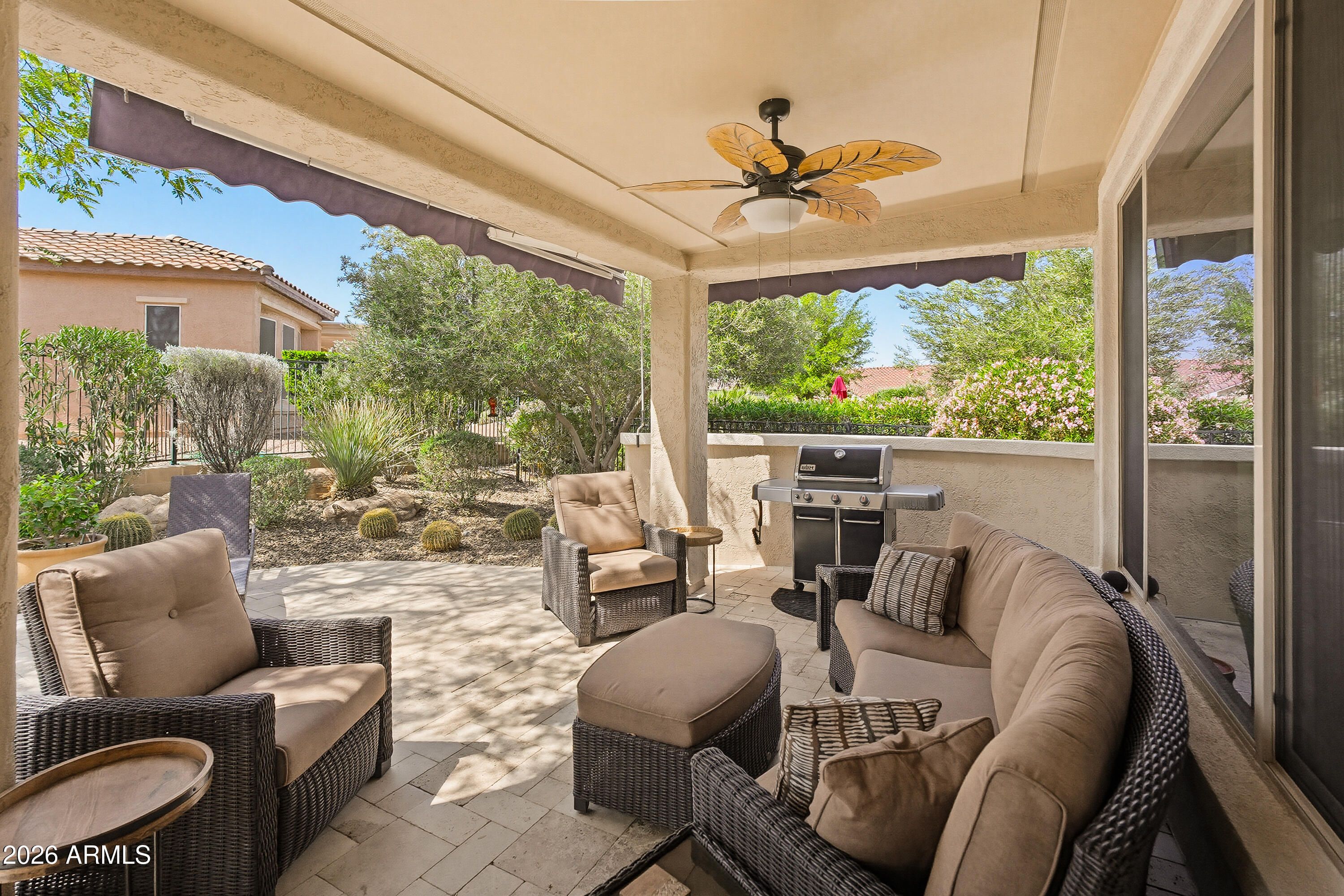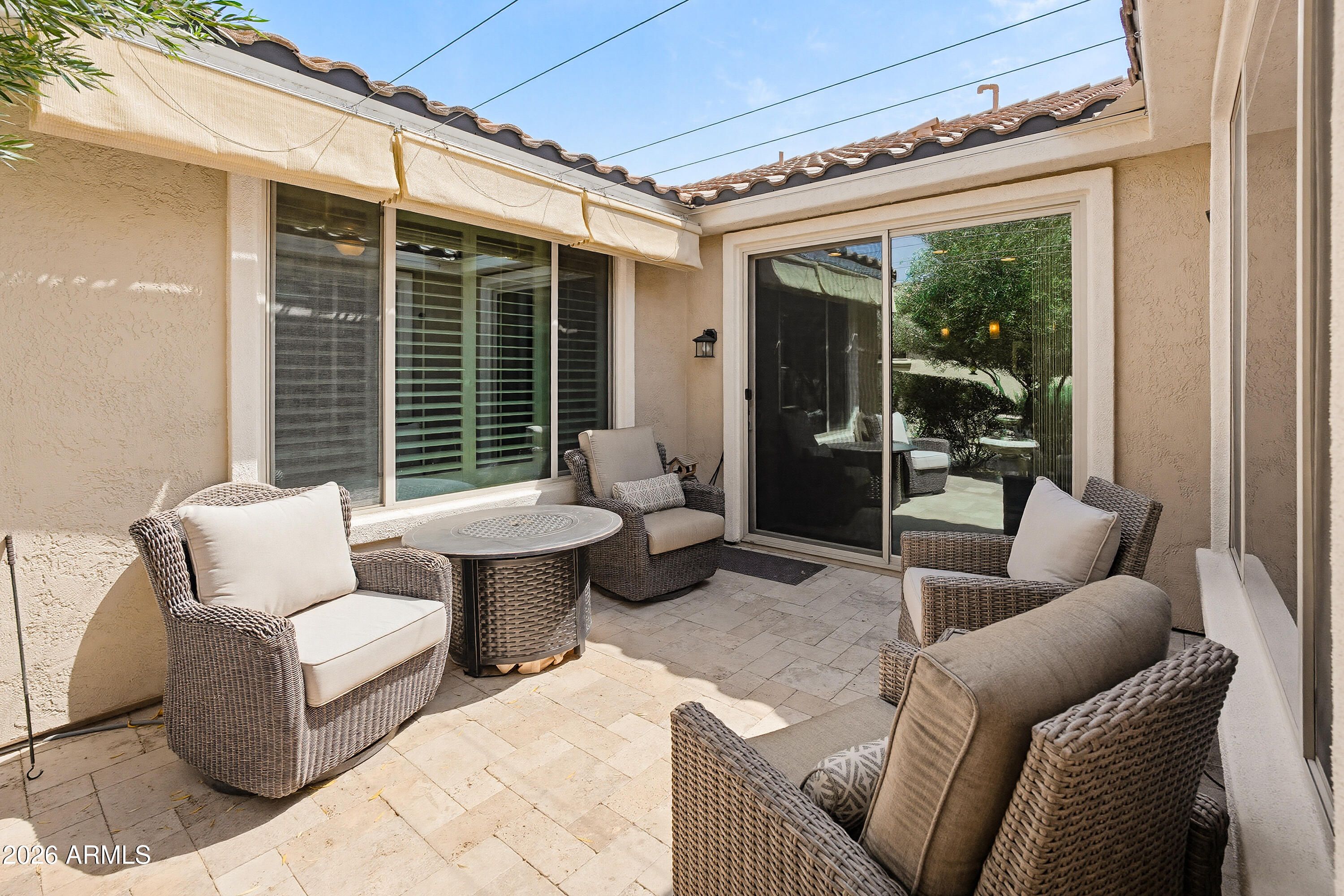 Fabulous Haven floor plan offering 2 bedrooms, 2 bathrooms & a versatile flex room with glass French doors--perfect for a home office, hobby space or guest overflow. This well-appointed home features Plantation Shutters, Smart Home wiring, granite kitchen countertops & upgraded cabinetry in a bright, open kitchen designed for everyday living and easy entertaining. Step outside to enjoy a private front courtyard and an extended travertine back patio complete with adjustable shade awnings & misters for comfortable outdoor living. The large lot and private backyard create a peaceful setting, while the 2-car tandem garage adds extra flexibility and storage. Ideally located near the Sage Center in Sun City Festival with access to resort-style amenities, golf, pool, fitness & social activities.