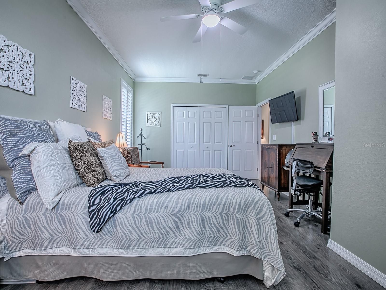 - Ceiling Fan(s), Crown Molding, Eat-in Kitchen, High Ceilings, Living/Dining Room, Open Floorplan, Solid Surface Counters, Split Bedrooms, Walk-In Closet(s), Window Treatments
