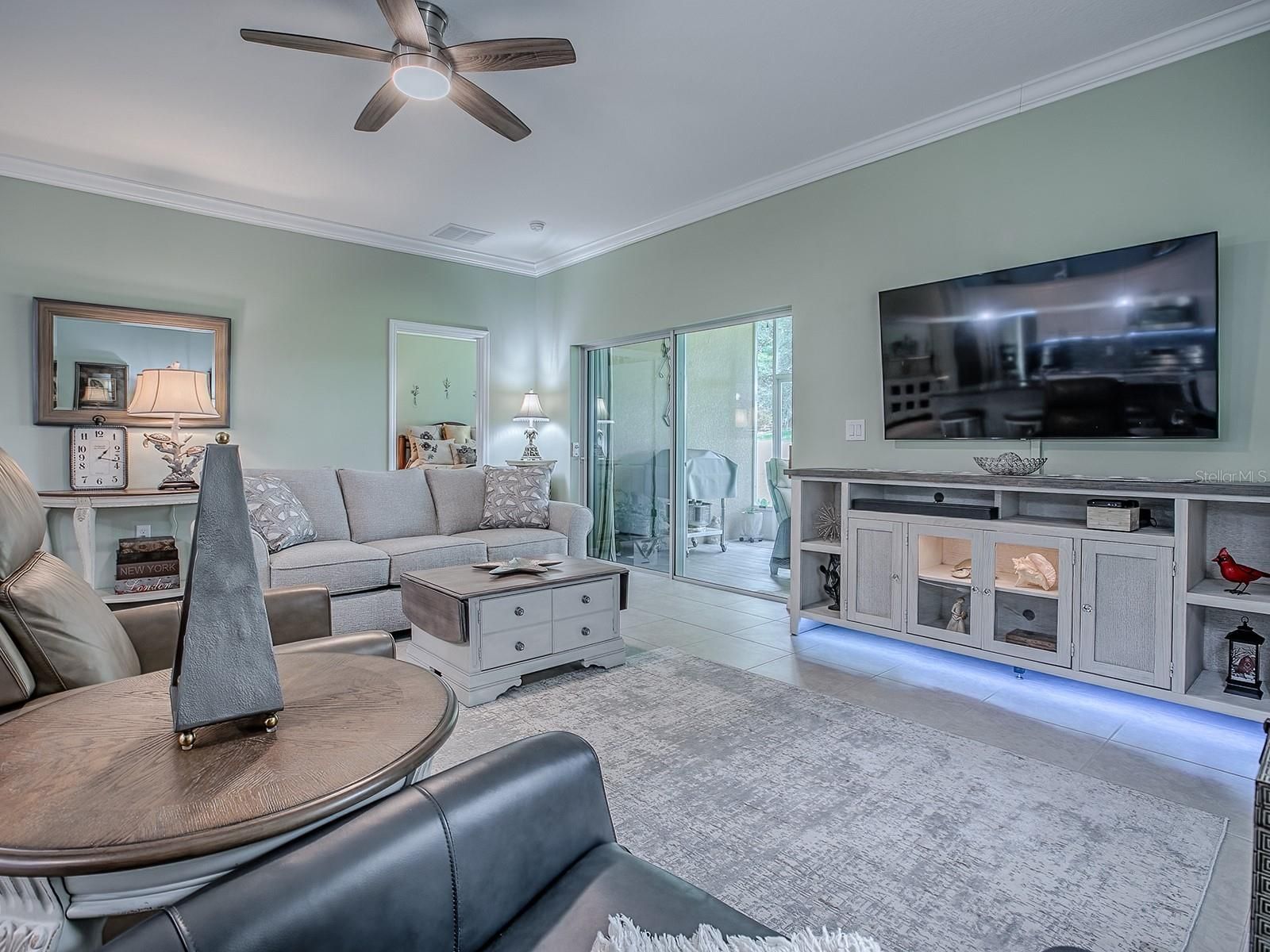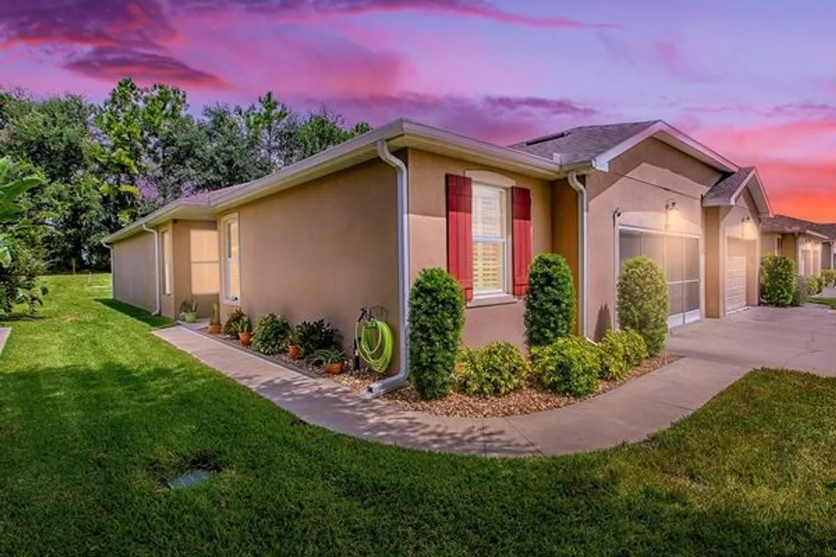 Enjoy maintenance-free living in this spacious 2-bedroom, 2-bath villa located in the highly desirable Arlington Ridge Golf Community! Built in 2019, this home features tile flooring in main areas, laminate in bedrooms, PLANTATION SHUTTERS, CROWN MOLDING, and upgraded lighting. The gourmet kitchen offers white cabinetry with crown molding, GRANITE countertops, STAINLESS STEEL appliances, tile backsplash with under/over cabinet lighting, and a center ISLAND with pendant lights. The Primary Suite includes his & hers walk-in closets and a luxurious bath with dual granite vanities and a WALK-IN SHOWER. The oversized guest bedroom provides space for a sitting area or home office, with a large closet and guest bath with tub/shower nearby. Additional features include a screened lanai with wood-look tile and no rear neighbors, a 2-CAR GARAGE with screened door and MyQ app access, keypad entry, and a washable air filter. Arlington Ridge offers resort-style amenities: Gary Koch–designed golf course, tennis, pickleball, 2 pools, fitness center, billiards, Village Tavern, movie theater, library, and more! HOA fees include lawn care, roof replacement, exterior painting, cable TV, and high-speed internet. Convenient location near FL Turnpike, shopping, dining, The Villages, Harris Lake boat ramp (10 min), and just 45 min to Orlando attractions and airport. Schedule your showing now and sit back, relax, and focus on enjoying everything this wonderful community has to offer!