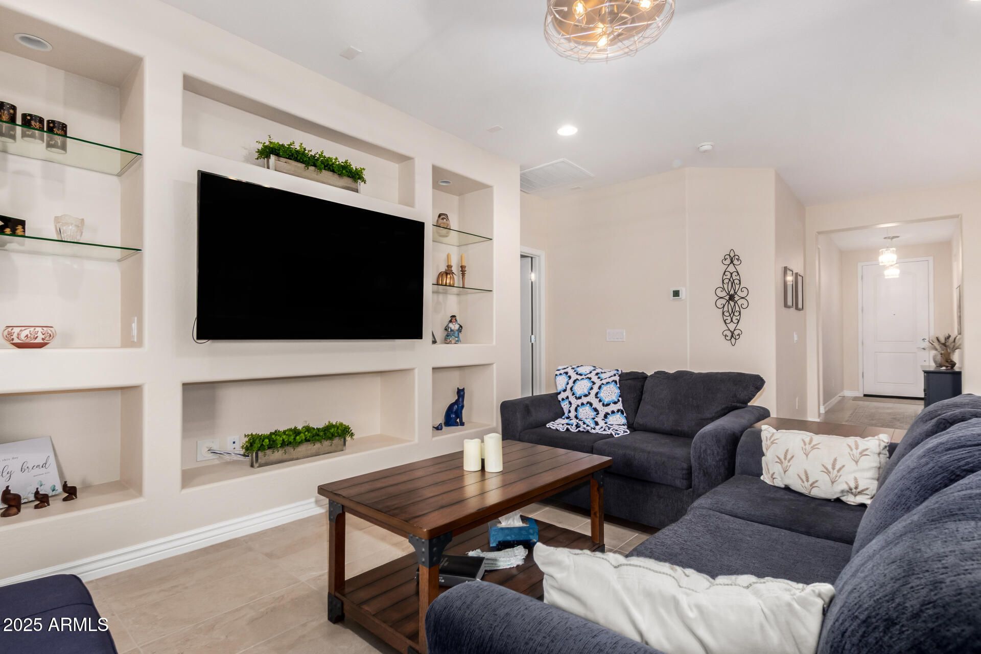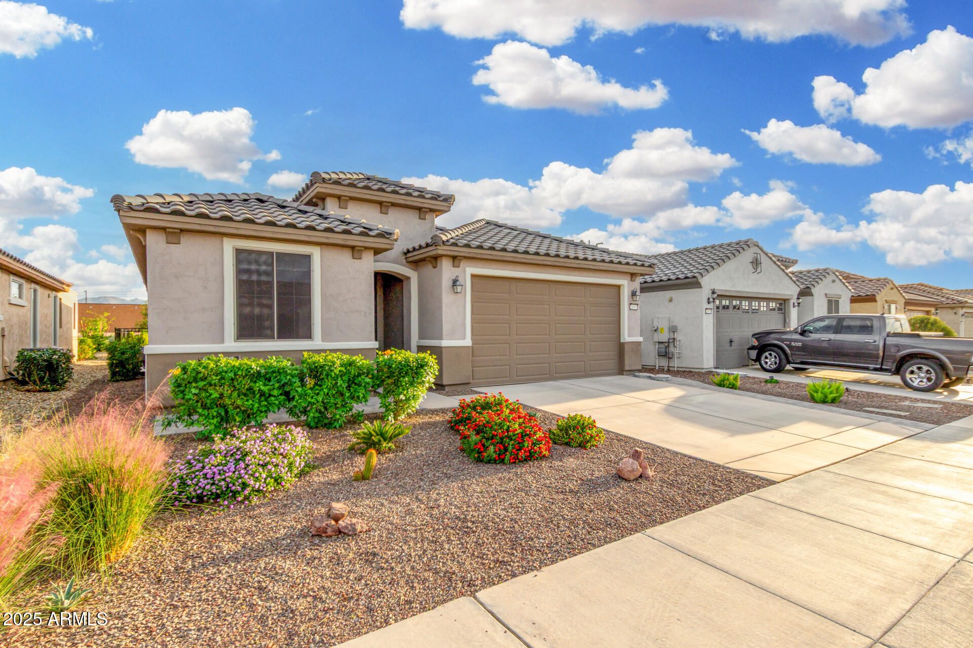 The perfect 55+ active adult retreat—single level, move-in ready, and located in Sun City Festival. Built in 2023—no waiting for construction. All furniture conveys except the outdoor fire pit furniture. This upgraded home features an open floor plan, neutral tile flooring, warm espresso cabinets, soft cream interior tones, and light speckled granite counters. The kitchen includes granite sink, tile backsplash, pendants, Whirlpool stainless, and both air fry + convection modes. The living room includes a built-in entertainment center and TV. 2ft extension across back of home + in primary suite for added space. The primary bath includes dual sinks, granite, walk-in closet, and upgraded tile shower. Samsung Smart Washer + Multi-Steam Dryer included. The backyard offers an extended patio, Aluma wood privacy panel, turf, fire pit, sunscreens, pavers, and full fencing w/ two gates. Garage includes an upgraded hobby package (extra lighting + additional outlets). Furnished option, single-level 55+, low-maintenance yard, granite kitchen, private backyard, Sun City Festival, Buckeye AZ.