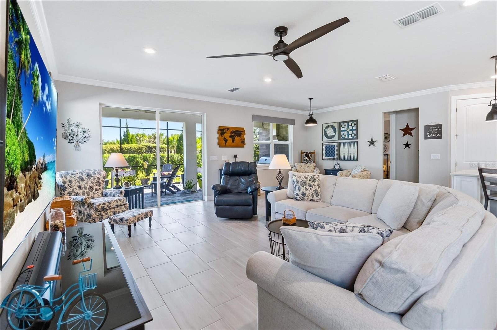 This upgraded 2-bedroom home with a den offers custom electronic window treatments, crown molding in the main living areas, seamless tile flooring throughout (no carpet), upgraded 8-foot doors, and premium lighting and ceiling fans throughout. The chef’s kitchen features a 2024 refrigerator and dishwasher, under-cabinet lighting, upgraded cabinetry, a granite sink, and a Nest thermostat. The extended gathering room includes an LED downlight package, an electrical floor outlet, and a TV mount, while the guest bedroom includes a 50-inch wall-mounted smart TV. Additional enhancements include double Cat6 in the flex room, extra shelving in the master closet, Ring doorbell, and a POE wireless access point in the primary suite. The lanai boasts a custom outdoor kitchen (2022), a 400 sq. ft. custom screen enclosure, a Ring security camera, and exterior floodlights. The tandem 3-car garage features epoxy flooring, extra GFI outlets, shop lights, keyless entry, and is prepped for a Tesla charger. Cabinets and workbench are excluded. Laundry room features custom shelving and a wall cabinet (washer and dryer not included). This meticulously maintained home is filled with thoughtful upgrades throughout.This 55+ active adult community offers a vibrant social scene and resort-style amenities. Spend your days lounging by the zero-entry pool with lap lanes, resistance pool, poolside hammocks, and heated spa. If you enjoy staying active, there are tennis courts, a movement studio, and scenic walking trails throughout the community. Socialize and expand your circle of friends at one of the many resident clubs, enjoy live music at the outdoor amphitheater, grab a bite to eat at the on-site tavern & grille or gather around the fire pits and grille pavilion for a casual evening. The large clubhouse, complete with a full-time Lifestyle Director, offers endless social events and activities, ensuring there’s always something to look forward to. Situated near Lake Nona, this home offers easy access to a variety of shopping, dining, and medical facilities.