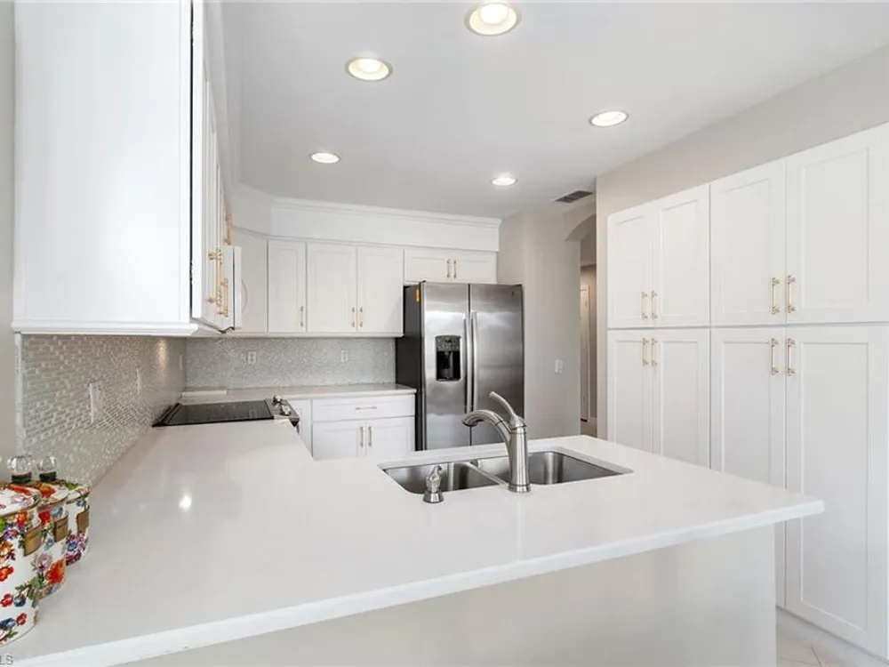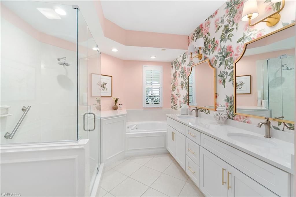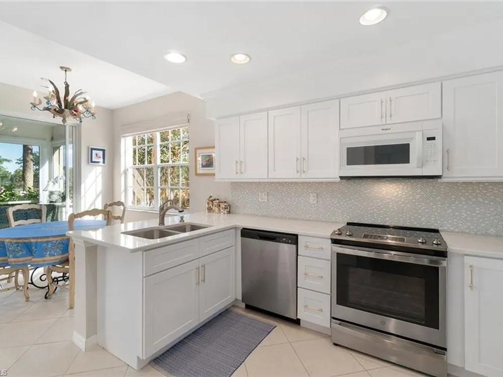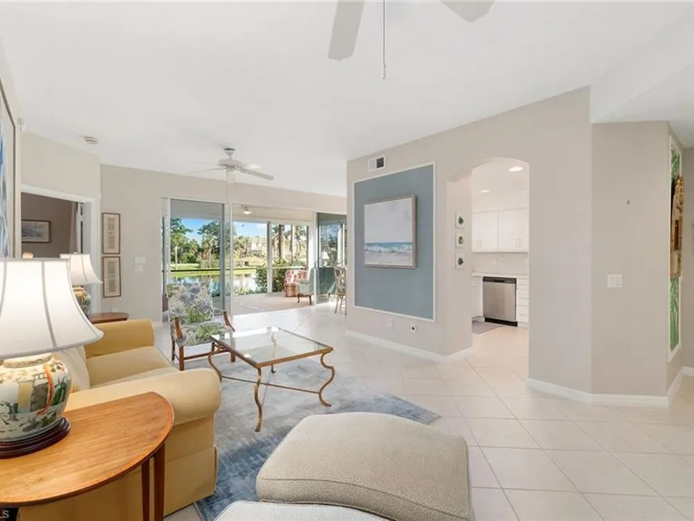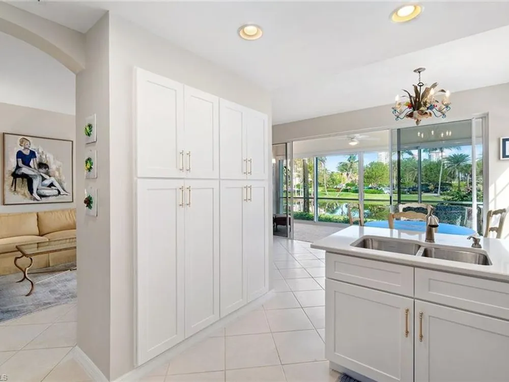Experience effortless elegance in this beautifully upgraded first-floor residence in the coveted Bay Pointe at Bonita Bay. This spacious condominium lives like a single-family home—without the maintenance—offering the ideal blend of comfort, luxury, and location. Step into the expansive enclosed lanai, where tranquil views of a sparkling pond and lush, manicured landscaping create a serene backdrop for morning coffee or evening relaxation. Watch native wildlife and soak in the peaceful natural surroundings day and night. At the heart of the home is a show-stopping kitchen featuring upgraded quartz countertops, sleek white cabinetry, newer stainless-steel appliances, and stylish gold accents. A stunning glass tile backsplash adds an extra layer of sophistication, while the oversized pantry with built-in shelving ensures ample storage for all your culinary needs. Both bathrooms have been thoughtfully renovated with premium quartz countertops, white cabinetry, and designer wallpaper, adding a vibrant touch to the elegant finishes. The expansive primary suite offers the ultimate retreat, complete with a large walk-in closet, private lanai access, dual vanities, a soaking tub, and a separate walk-in shower.Additional highlights include beautiful tile flooring throughout the main living areas and matching luxury vinyl in the bedrooms and den. The den is accented with built-in cabinetry and shelving, making it a perfect office or flexible living space. A generous two-car garage rounds out this well-appointed home.Enjoy all that Bonita Bay has to offer, including a private beach park on the Gulf of Mexico, over 12 miles of scenic walking and biking trails, three community parks, and a full-service marina. Optional membership to the Bonita Bay Club grants access to world-class golf, tennis, dining, spa services, and more—some of the finest amenities in Southwest Florida.