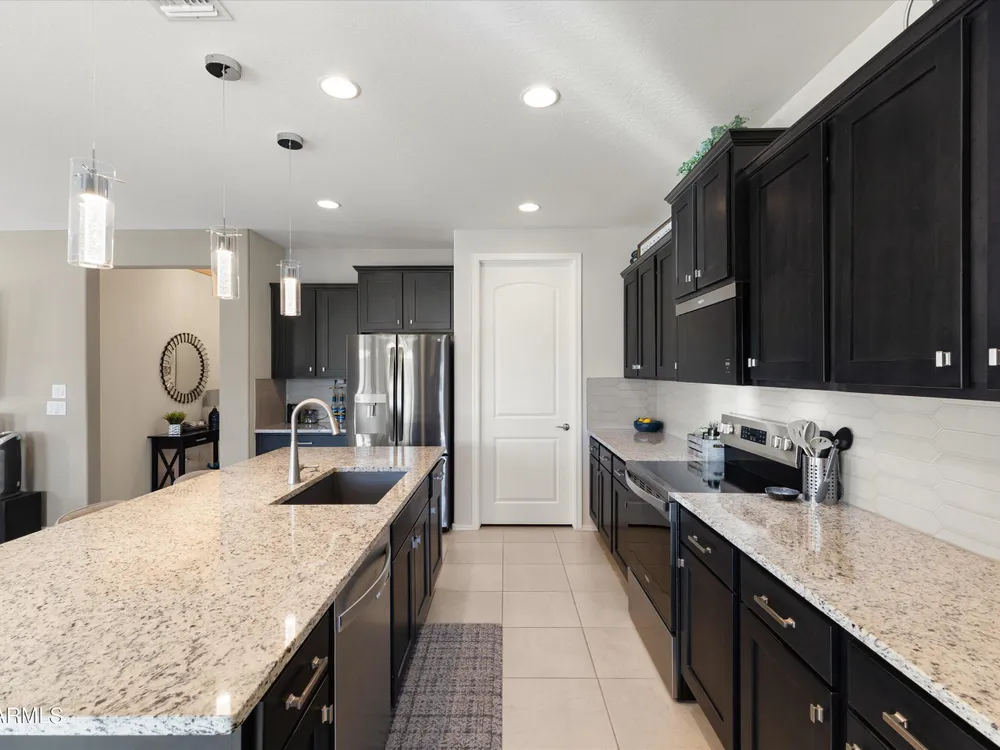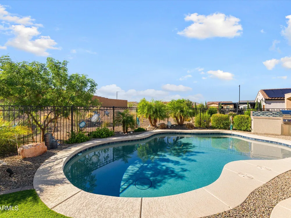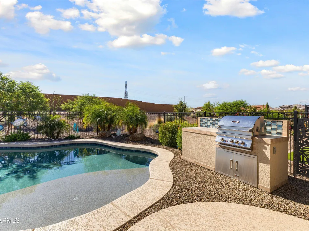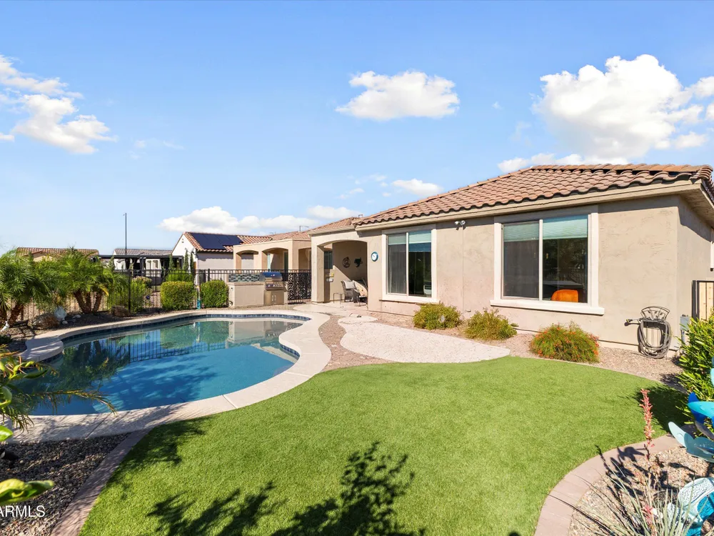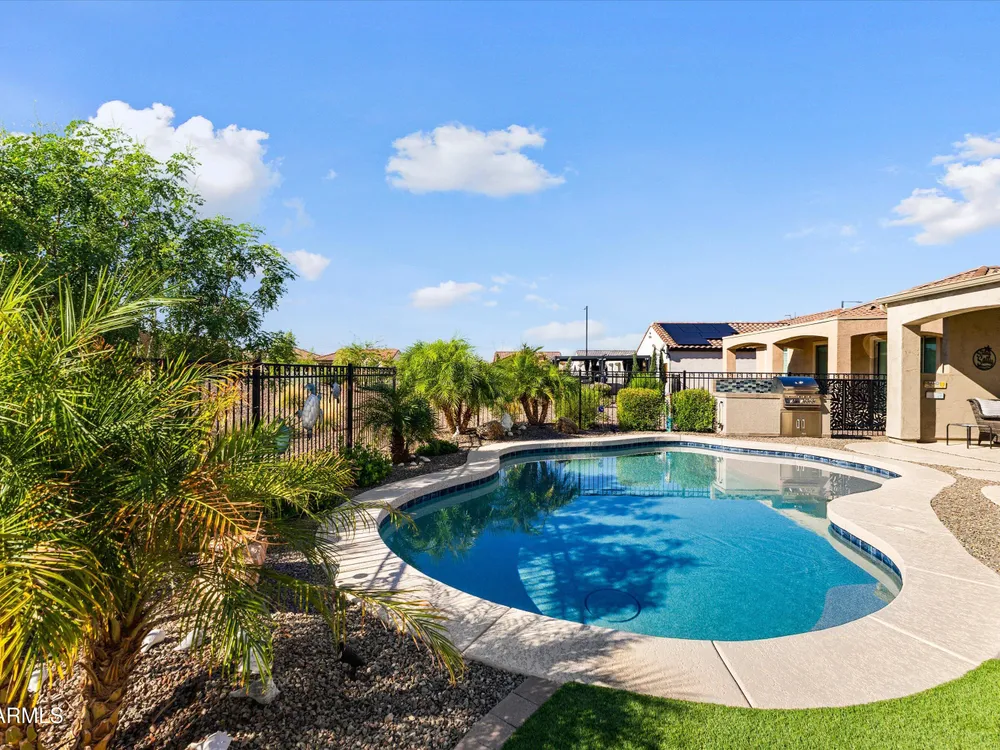 LOOK NO FURTHER! AN EXCEPTIONAL ODYSSEY MODEL WITH GORGEOUS POOL, 4 FT EXTENDED GARAGE, AND LOADS OF CUSTOM UPGRADES. Enter this thoughtfully designed floorplan w/ neutral tones, contemporary flooring, designer lighting features, window treatments & custom appointments throughout. The inviting gathering & dining area is flooded with natural light. The chef's kitchen impresses w/ spacious island, miles of counterspace, upgraded cabinets & sleek backsplash. The owner's suite features a spa-like bath with tile surround shower/bench, dual sinks, granite counters custom tile mirror wall & huge walk-in closet. Guest room has adjacent bath w/ custom tile accent walls. Enjoy outdoor living to the fullest in this beautiful backyard that offers a covered patio, built in barbecue & Sparkling Pool!