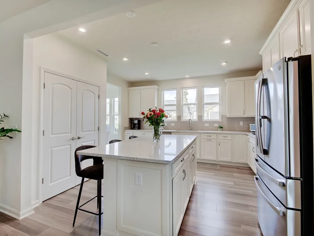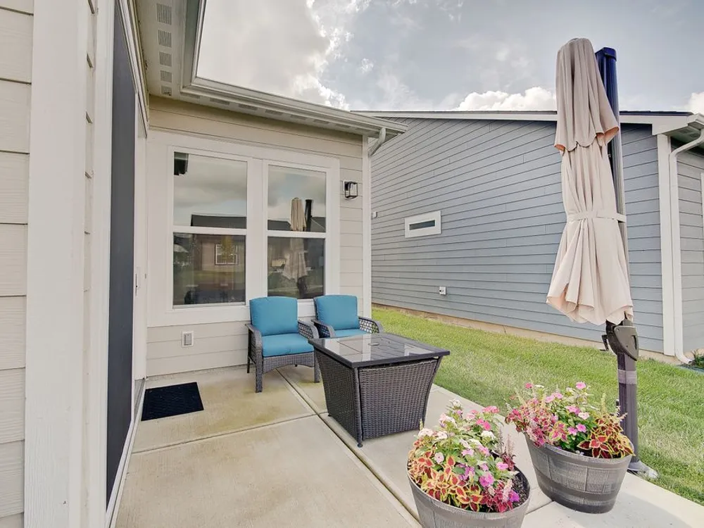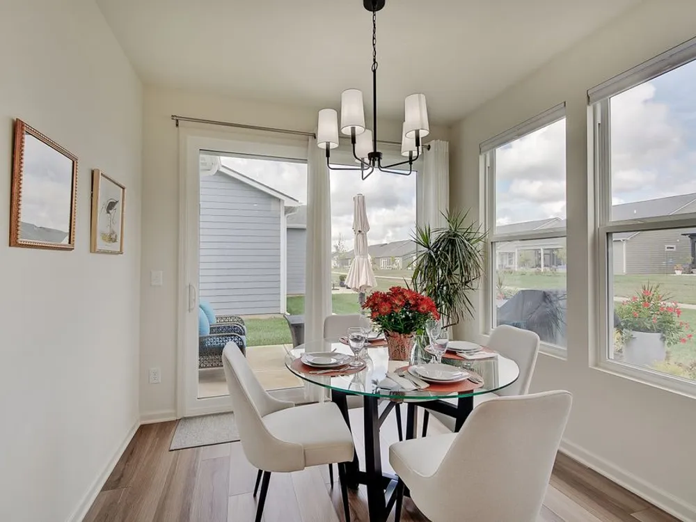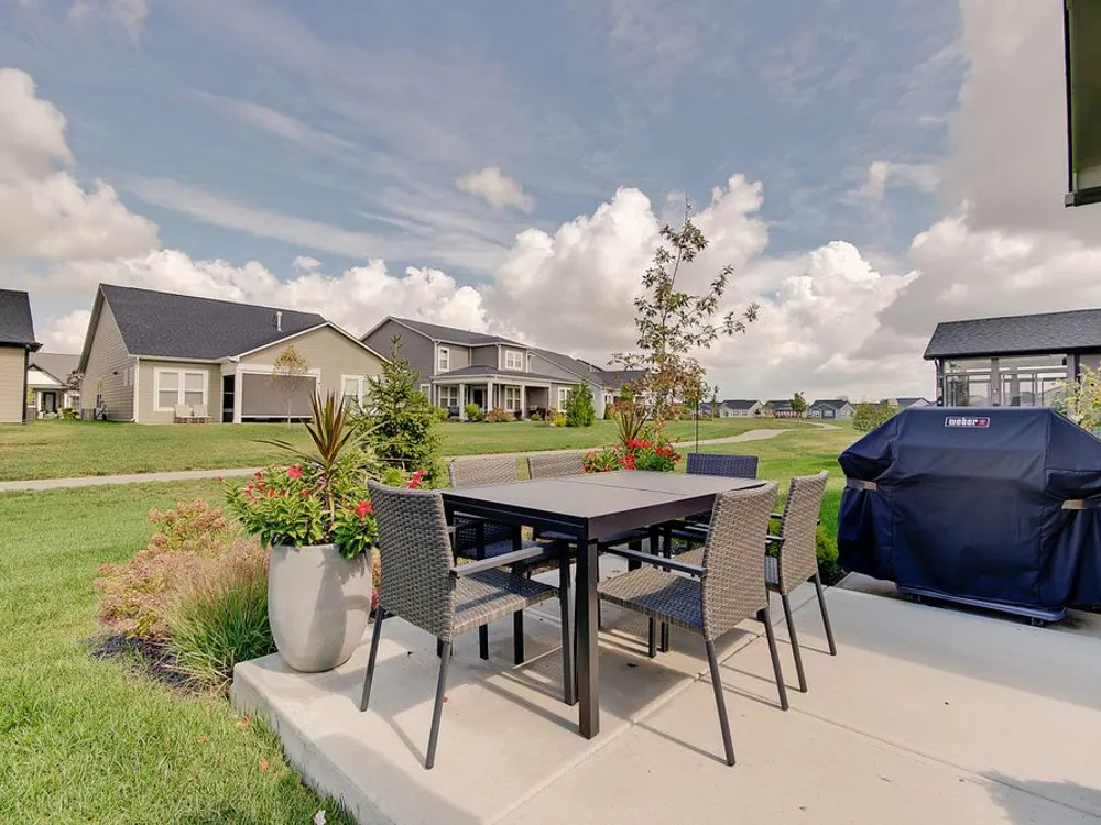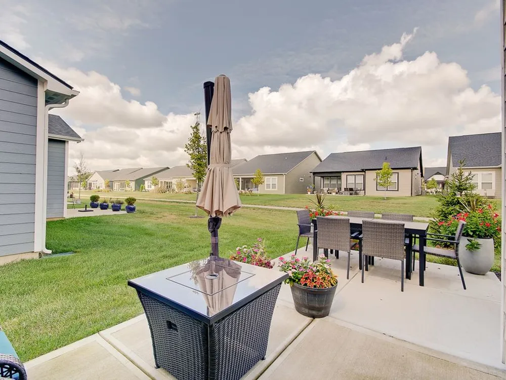 Experience the pinnacle of maintenance-free living in this exquisite Meadow floorplan home. This residence offers a harmonious blend of modern design and comfort. The open floor plan, enhanced by high ceilings, allows natural light to pour in, creating a bright and inviting atmosphere. Ample storage options, including a finished garage with an expansive bump-out for your golf cart, ensure functionality meets style. Unwind in the charming sunroom, perfectly positioned off the kitchen, to enjoy serene sunrises. Enjoy evenings on your oversized patio! The community amplifies the allure of this home with resort-style amenities such as a 13,000-square-foot clubhouse, indoor and outdoor pools, a fitness center, and a golf simulator. Additionally, multiple athletic courts and picturesque walking paths provide recreational opportunities for all. Indulge in the upscale lifestyle this vibrant community offers.