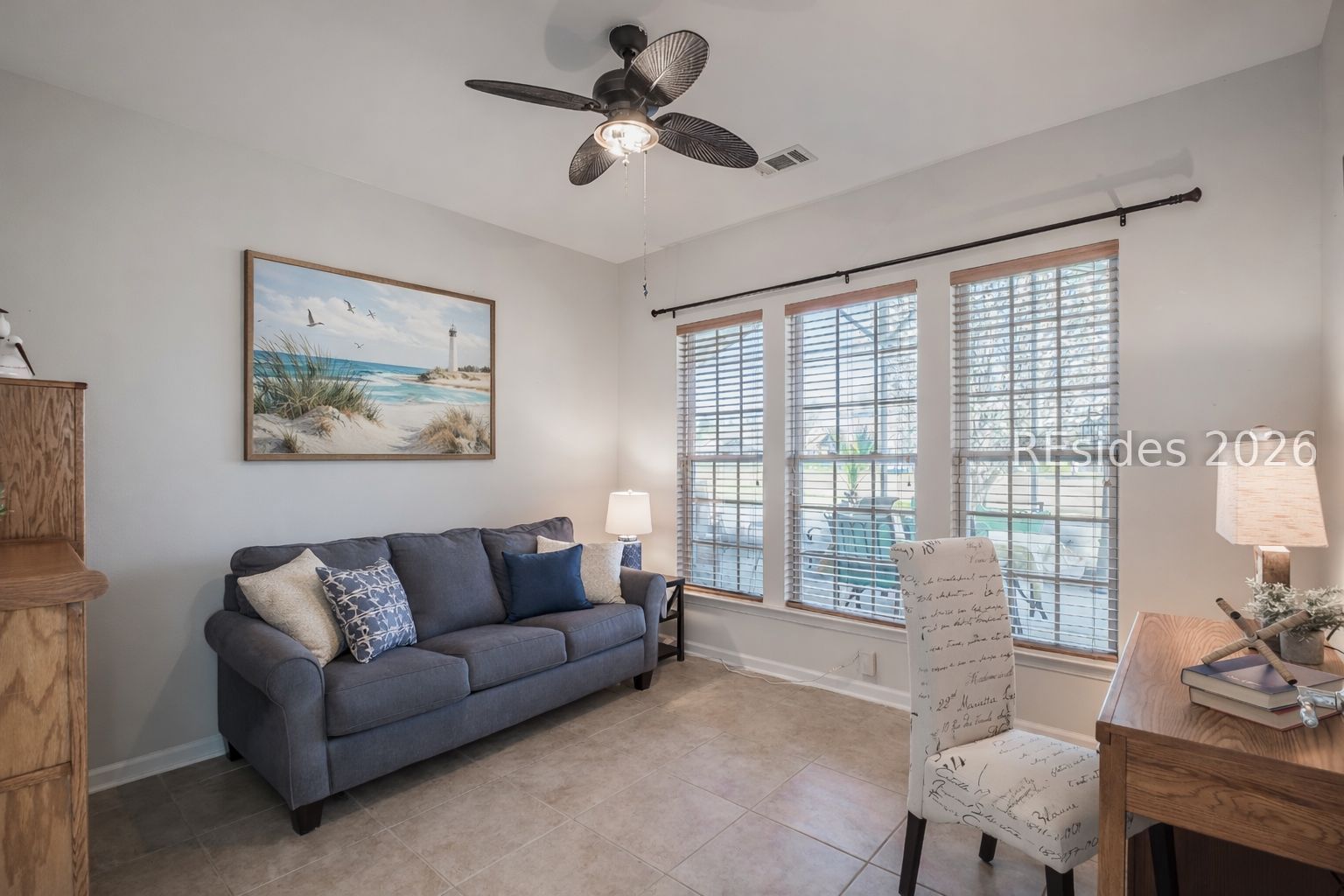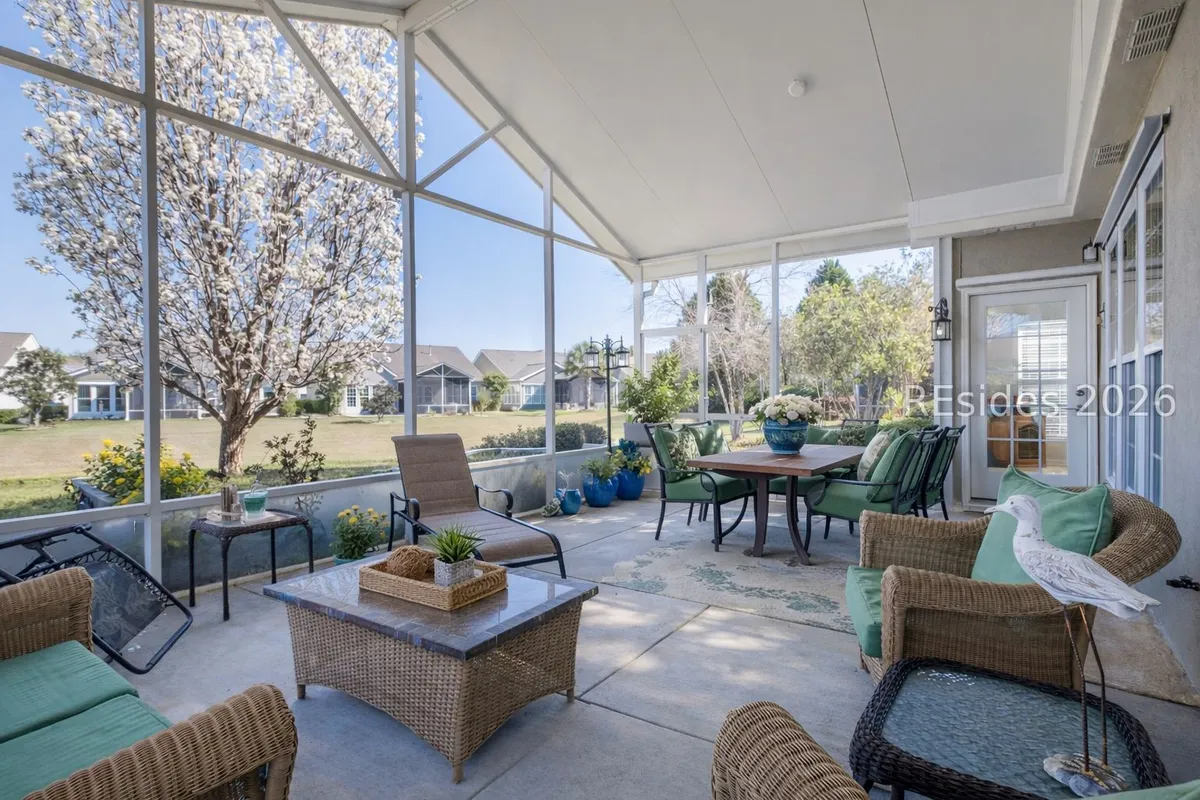 Enjoy resort-style active adult living in Sun City with this versatile Surrey Crest model offering over 1,800 square feet of well-designed living space. Perfectly positioned on a lagoon, this home captures the Lowcountry lifestyle that makes this vibrant community one of the most sought-after 55+ developments in the Southeast. Featuring a light & bright glass-enclosed Carolina room and a vaulted, hard-roof screened lanai overlooking peaceful water views-ideal for entertaining or enjoying quiet mornings surrounded by nature. The open eat-in kitchen is equipped with granite countertops, stainless appliances, tile backsplash, and ample cabinetry, seamlessly connecting to the main living area. A flexible den provides endless options for a home office or crafting space. Residents of Sun City Hilton Head enjoy unmatched amenities including championship golf courses, indoor and outdoor pools, fitness centers, pickleball and tennis courts, walking trails, and an active social calendar.