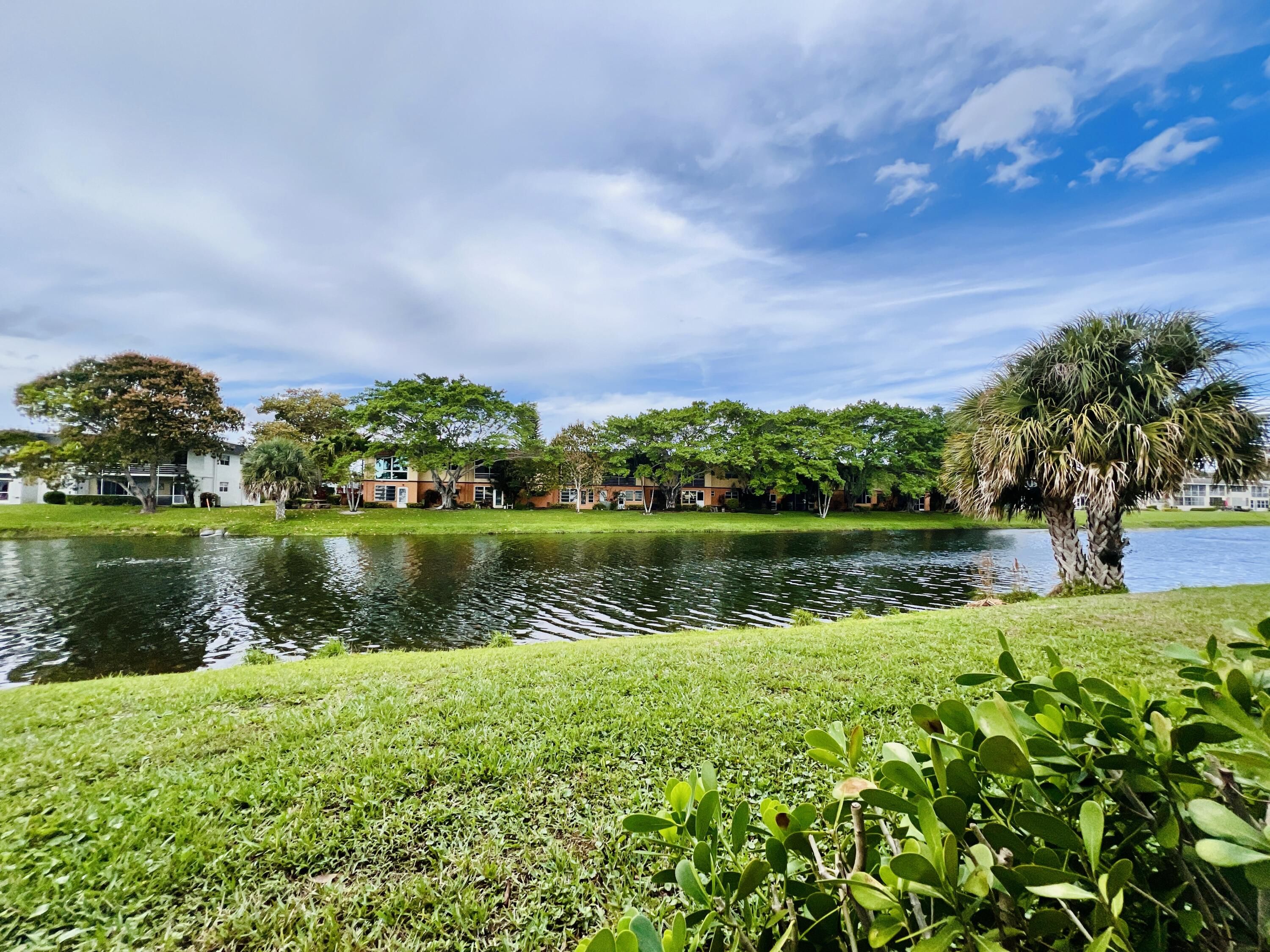 Delightful With Water Views in 55+ Century Village! Light & Bright FIRST FLOOR 2/1.5 With Updates. Pretty Kitchen Featuring Crisp White Cabinets, Modern Subway Tile Backsplash, and Granite Look Counters. Updates to Baths. Neutral Tile Flooring. The Long Lanai Is the Perfect Spot to Enjoy The Peaceful Water Views! Sold Furnished As Shown. Fantastic Location Close to Hastings Fitness Center and the Main Clubhouse. Sheffield B Is A Nicely Maintained Building With Waterside Resident Patio, New Roof (2023), Reserves, and No Special Assessments! Century Village is a Vibrant 55+ Community Centrally Located in Highly Desirable Palm Beach County, Florida! Enjoy An Active 55+ Lifestyle With Resort Style Amenities... Century Village is a 55+ Resort Style community with so much to offer - Much To Offer - shows, movies, clubs, pools, security, and transportation service. The Clubhouse features a theater, indoor pool, card room, community/party room, billiard room, shuffleboard, tennis, pickleball, bocce, and two outdoor pools, Numerous heated outdoor pools throughout the community. Separate fitness center with gym and outdoor heated pool & resistance pool. Two guarded gates and 24-hour roving security patrol.