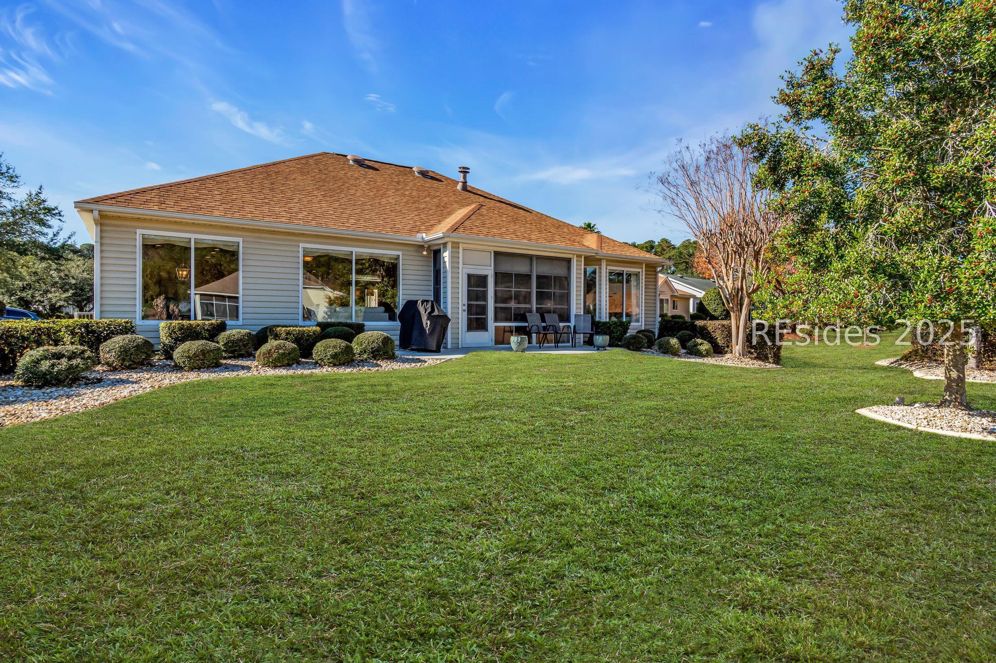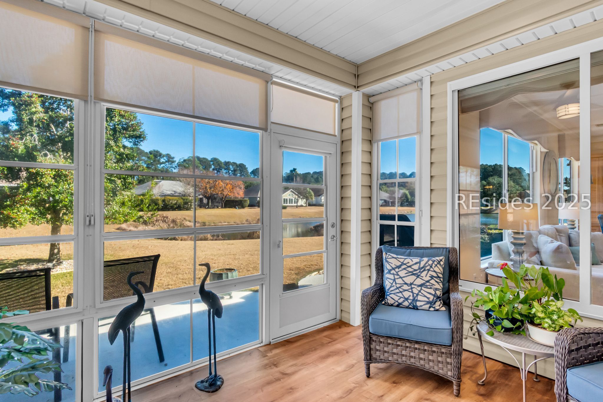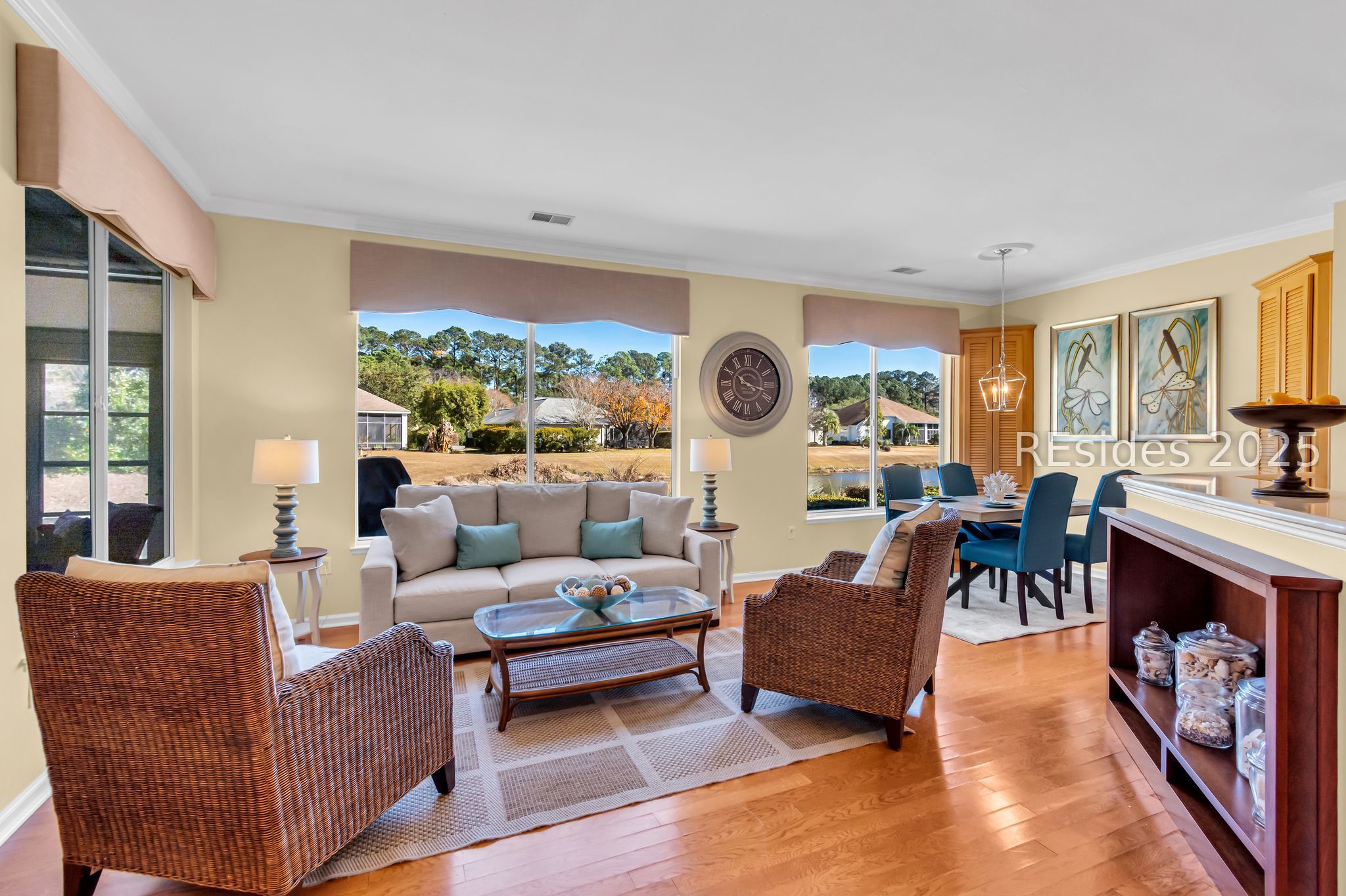 Welcome to this fabulous light, bright Bluffton-Eastman (1,703) This open flowing floor plan features hardwood floors in main living areas and a gas fireplace with marble surround. The large windows over look the lagoon with our low-country birds coming everyday. This private backyard is your perfect retreat. The updated chef's kitchen features a gas range, corian counters & tile back splash. New Accent-trimmed cabinet doors, plus wide drawers & pullout storage. Plenty of workspace, and 2 large pantries. This kitchen's open gathering design truly makes entertaining a breeze! Flowing from the great room, the 3-Season lanai overlooks the lagoon and patio. Both Master bath and Guest bath have high cabinets with New Accent-trimmed doors & drawers. The large master bedroom continues the lagoon view & private backyard. The guest room offers comfort and privacy. Throughout the home all windows have Hunter-Douglas Silhouette Window Shadings that are remote controlled for effortless programing. Newer washer & dryer. Garage has Epoxy floors, large sink, side door and pull-down w/ floored storage. Roof 2021. Trane HVAC 2018. New garage door and opener 2023. Quiet Cul-de-sac Central location. Minutes to Town Square and 3 gates. Move in ready for you.