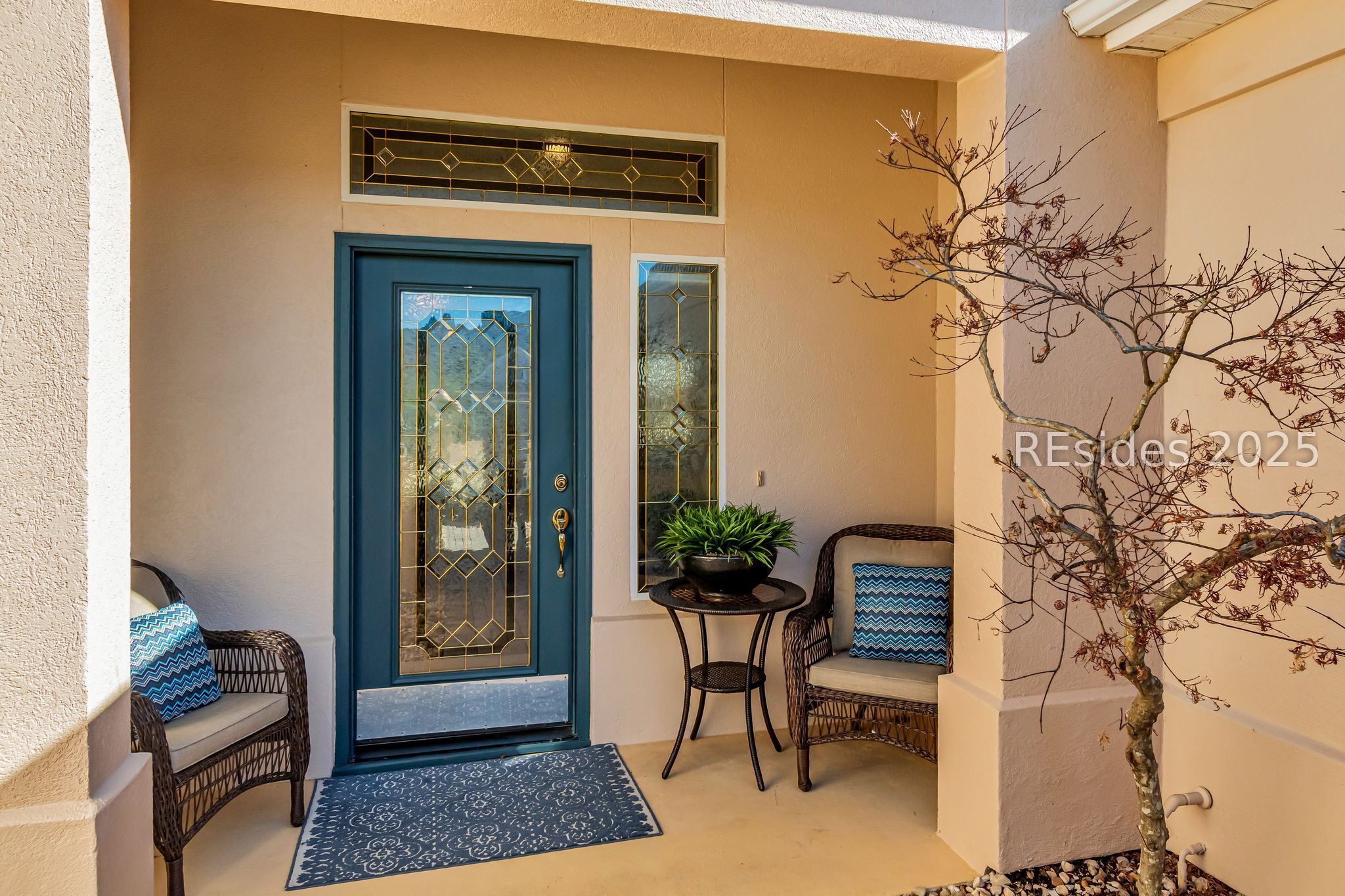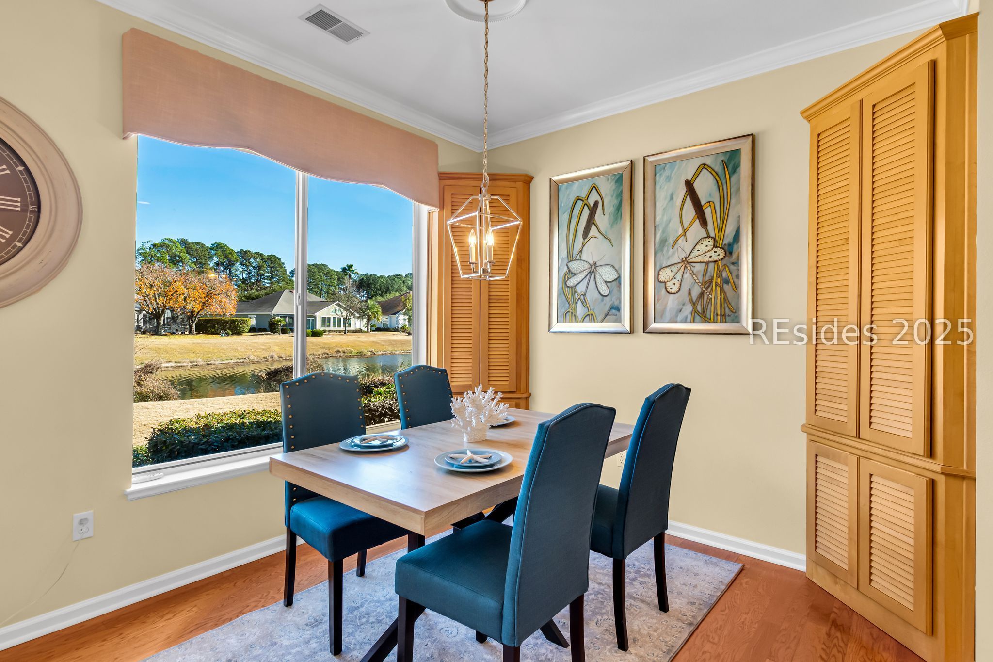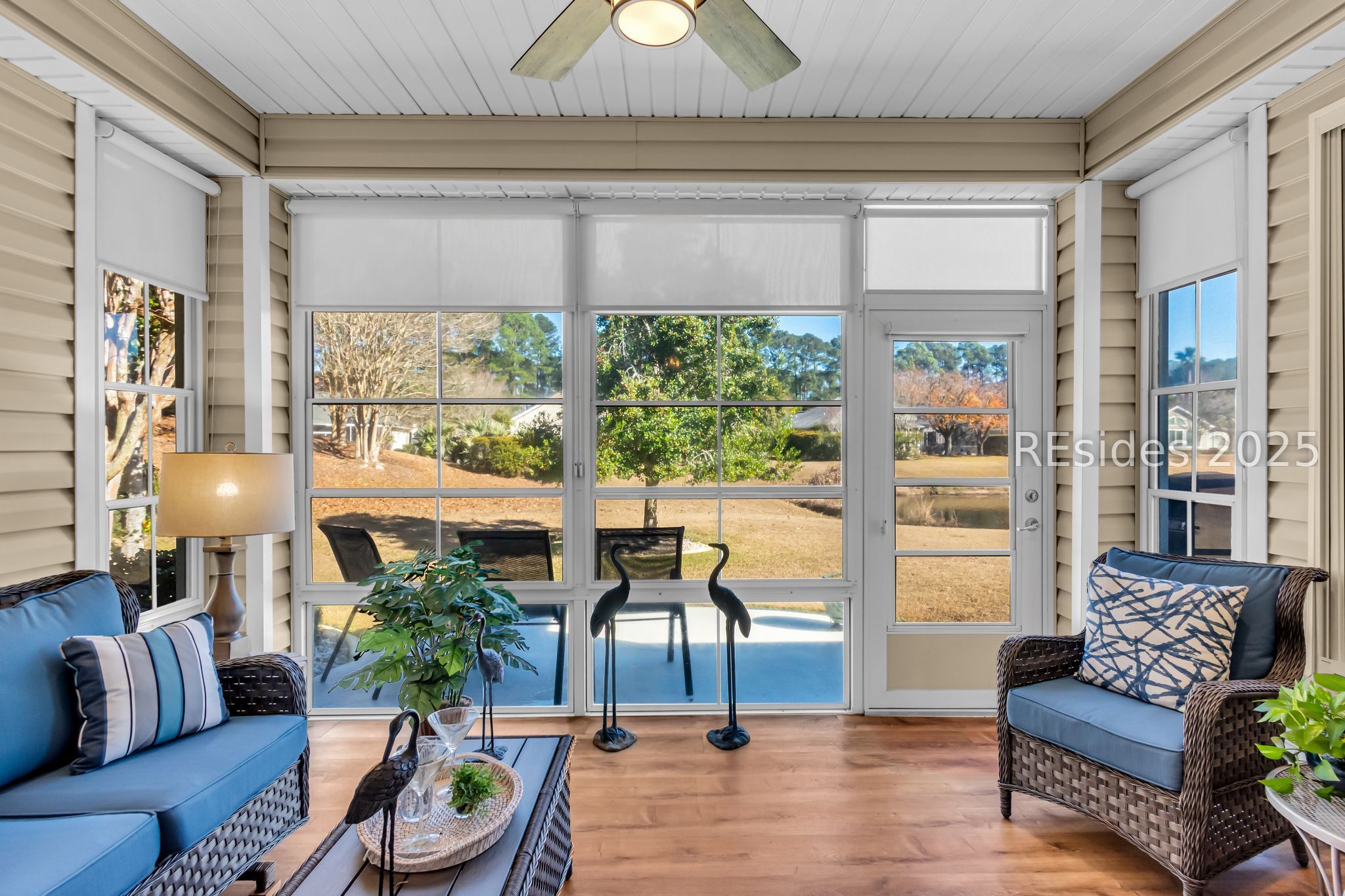 Welcome to this fabulous light, bright Bluffton-Eastman (1,703) This open flowing floor plan features hardwood floors in main living areas and a gas fireplace with marble surround. The large windows over look the lagoon with our low-country birds coming everyday. This private backyard is your perfect retreat. The updated chef's kitchen features a gas range, corian counters & tile back splash. New Accent-trimmed cabinet doors, plus wide drawers & pullout storage. Plenty of workspace, and 2 large pantries. This kitchen's open gathering design truly makes entertaining a breeze! Flowing from the great room, the 3-Season lanai overlooks the lagoon and patio. Both Master bath and Guest bath have high cabinets with New Accent-trimmed doors & drawers. The large master bedroom continues the lagoon view & private backyard. The guest room offers comfort and privacy. Throughout the home all windows have Hunter-Douglas Silhouette Window Shadings that are remote controlled for effortless programing. Newer washer & dryer. Garage has Epoxy floors, large sink, side door and pull-down w/ floored storage. Roof 2021. Trane HVAC 2018. New garage door and opener 2023. Quiet Cul-de-sac Central location. Minutes to Town Square and 3 gates. Move in ready for you.
