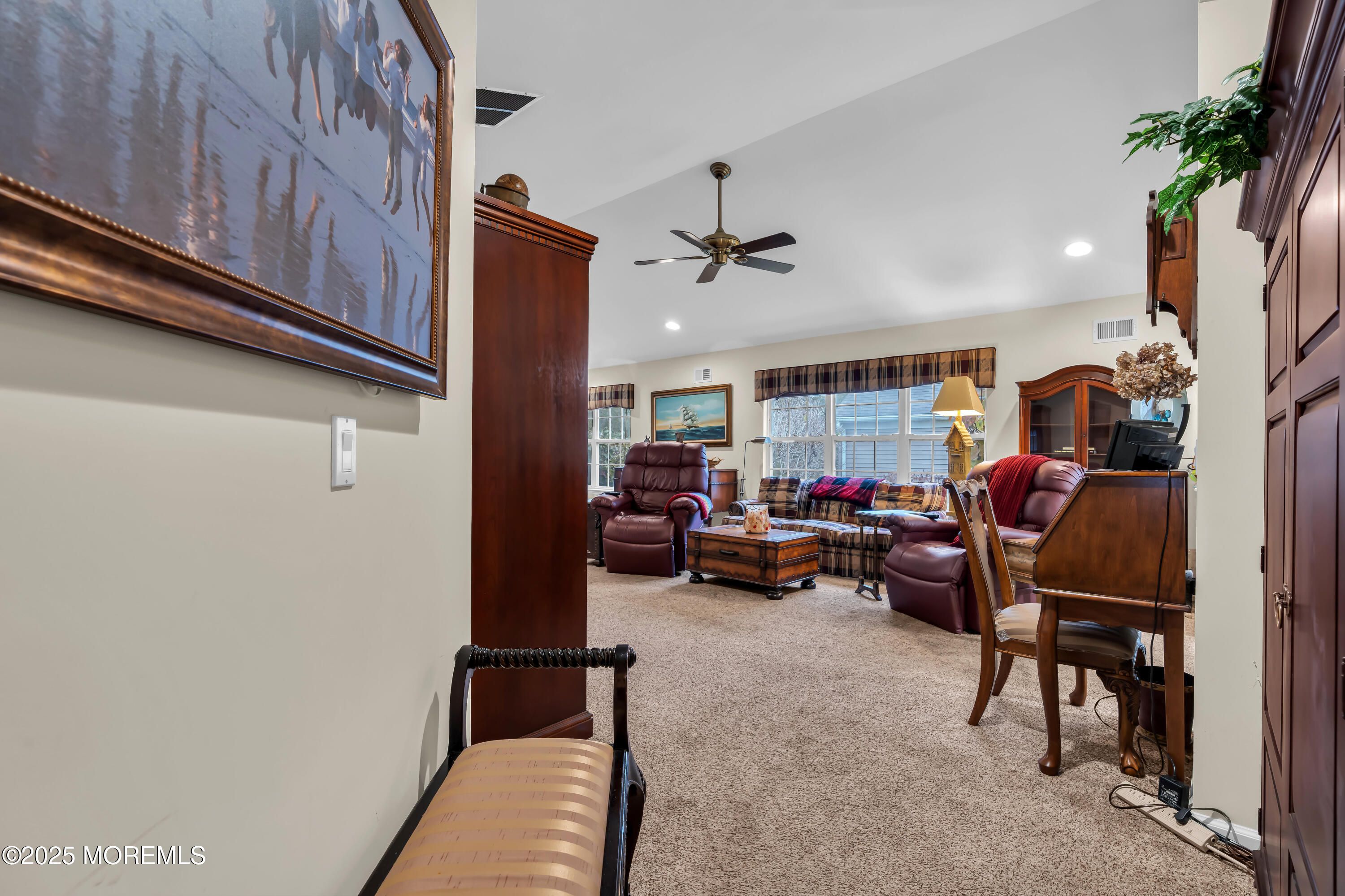 Welcome to 27 Strawberry Ln, a stunning residence in the highly sought-after gated 55+ community of The Fairways at Lakewood. This standout Fairways II model - the largest floor-plan offered - delivers nearly 3,000 sq ft of elegant, thoughtfully designed living space. Positioned on a highly coveted lot that has preserved woods in both the front and rear of the house, you'll enjoy unmatched privacy and serene natural views of this professionally landscaped property. Step inside to discover a gracious layout featuring 3 spacious bedrooms and 3 full baths, including a luxurious first-floor primary suite perfect for ease and comfort with a walk-in closet. The upper level offers a versatile loft and guest suite — ideal for visitors, hobbies, or a home office. Recent updates include a new roof and upgraded HVAC systems and water heater, offering peace of mind and move-in readiness. The high-end finishes and open, bright spaces shown in the photo gallery further elevate the experience: from the inviting foyer and living room to the modern kitchen and expansive family room. The sunroom is a perfect space for entertaining and relaxing with your own Hot Tub. Outdoors, your private patio sits tucked into the wooded surroundings, providing a perfect retreat for your morning coffee, and evening relaxation.