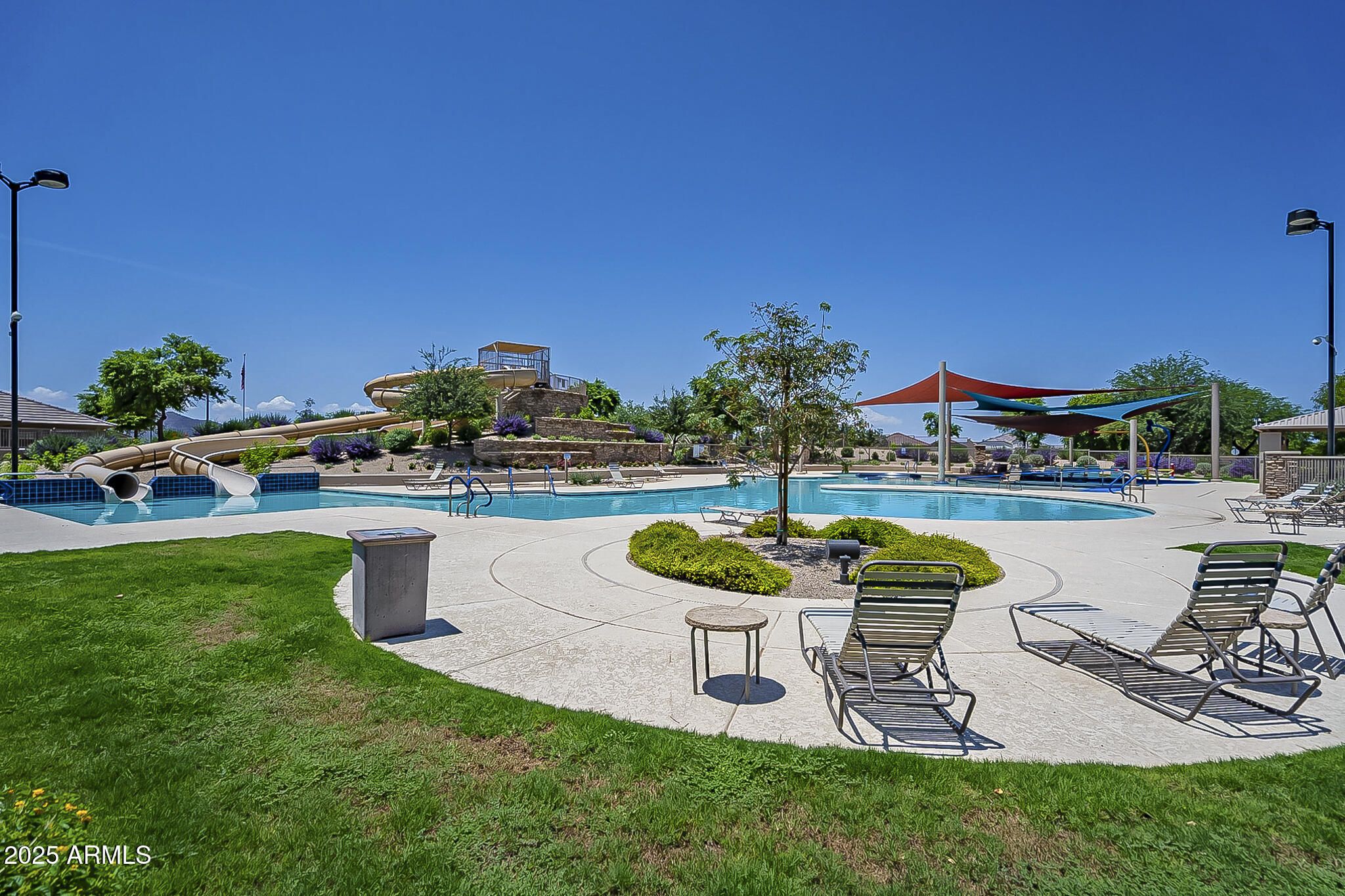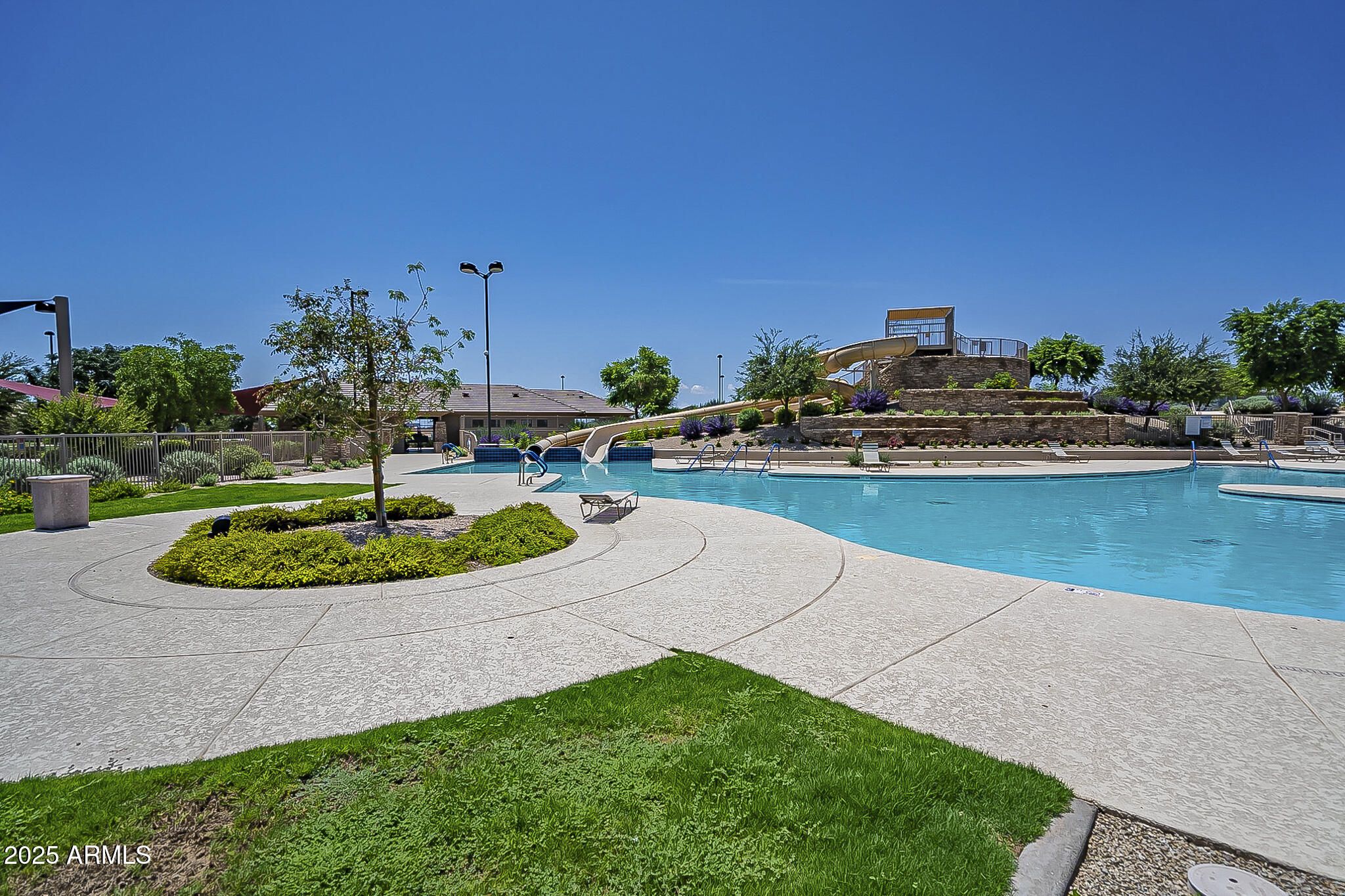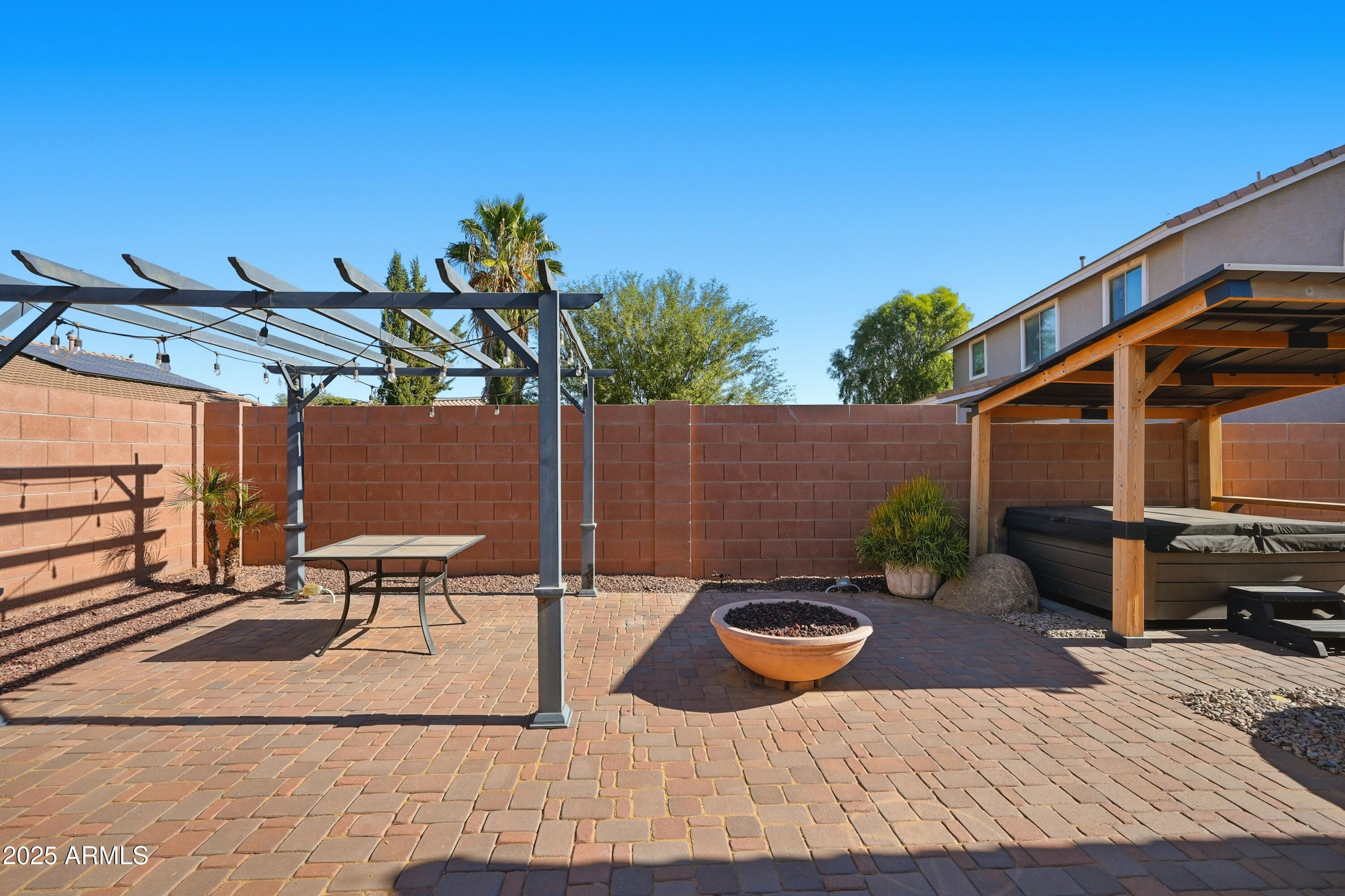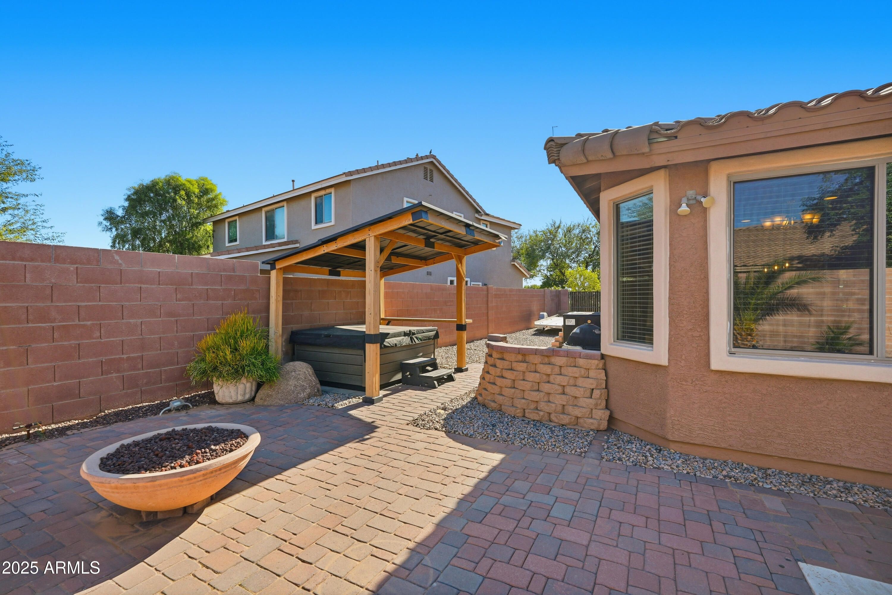 Resort living in Casa Grande! This 4-bed dream home features a heated pool, water softener and new luxury vinyl plank flooring! Located directly across from a park and a water park for instant fun and relaxation. Inside, enjoy an open-concept living area, a cozy family room, and a chef's kitchen. OWNED SOLAR keeps energy bills low! The backyard is perfect for entertaining with a covered patio, metal pergola, spa/hot tub, gazebo, fire pit and sparkling HEATED pool. This home blends comfort, style, and outdoor living in one beautiful package!