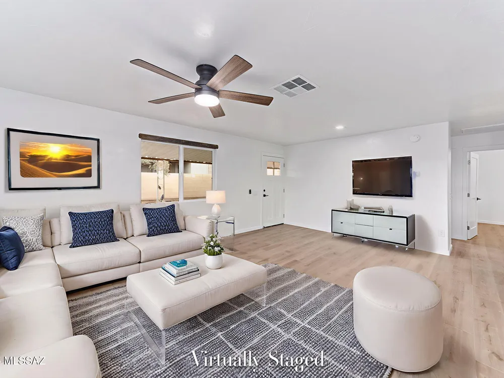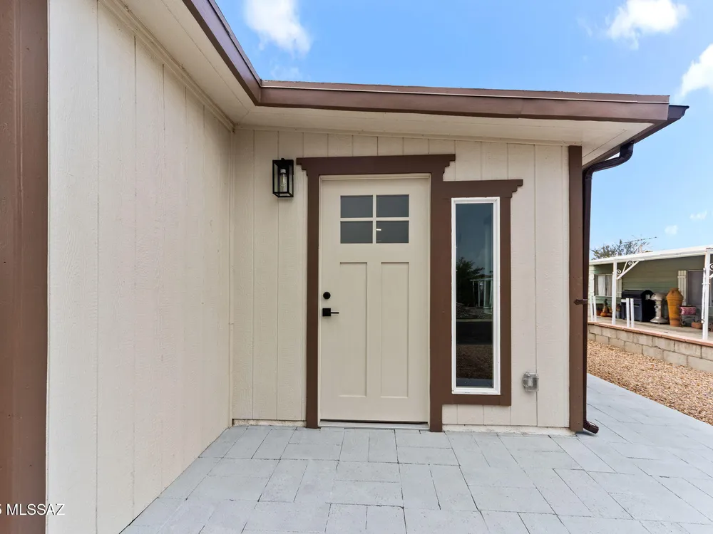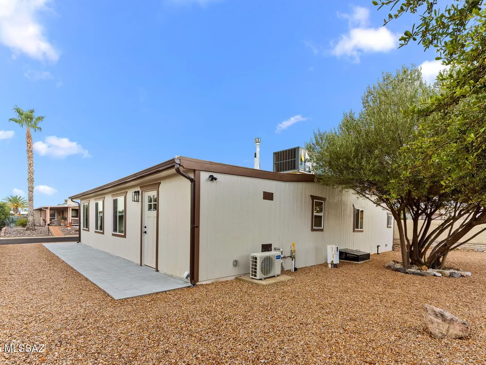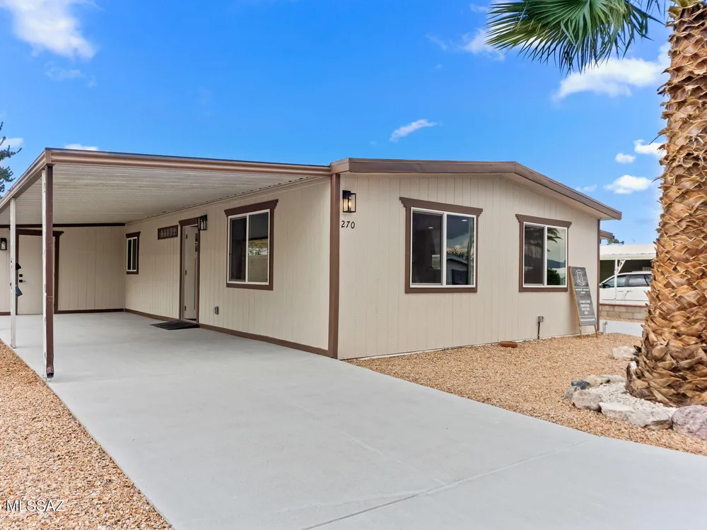 Located in Pueblo Estates, a 55+ community, this updated 2 bedroom, 2 bath home features wide doorways, new vinyl plank flooring throughout, tiled showers, and brand-new cabinets with quartz countertops. In the center of the home is an Arizona room with heating and cooling perfect for year round enjoyment. Additional upgrades include a new AC and heat unit, new windows and doors and new exterior siding. This property does not have Green Valley Recreation (GVR), but it is available if desired. Enjoy access to the community pool and more.