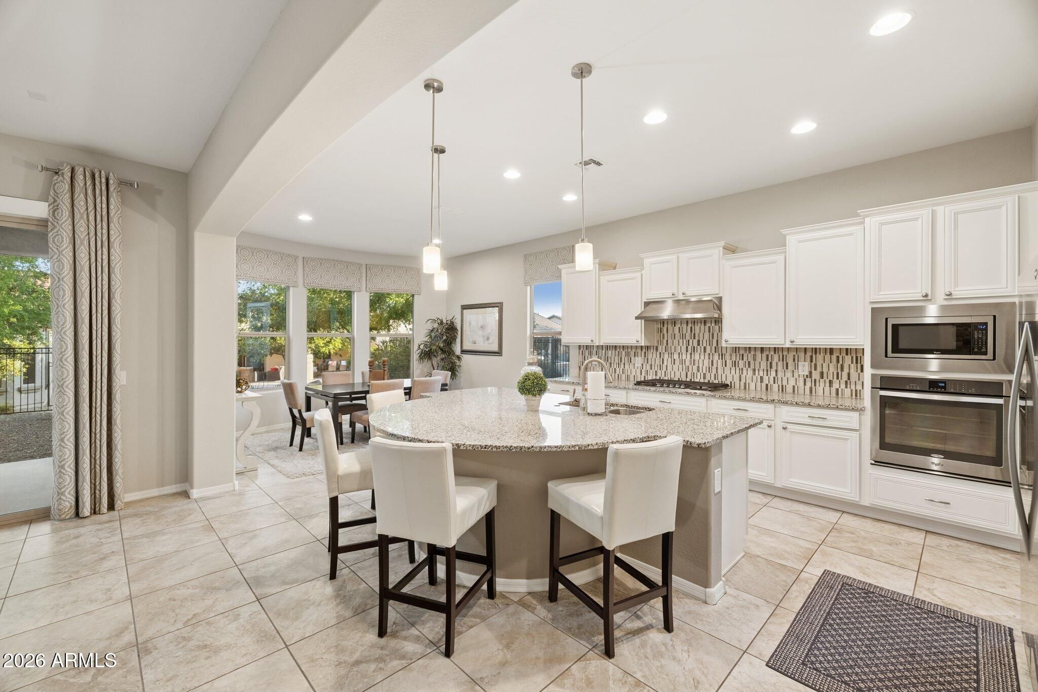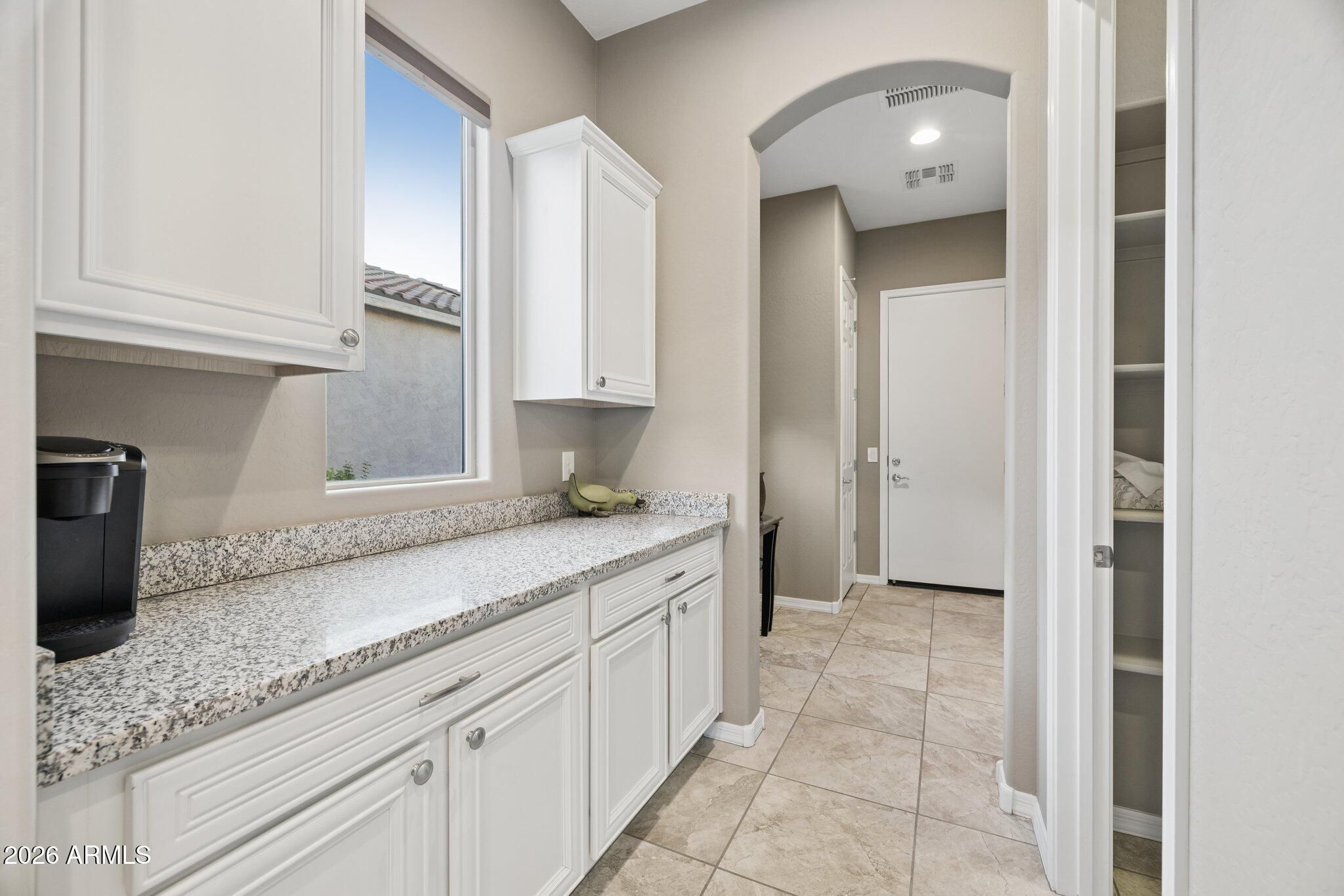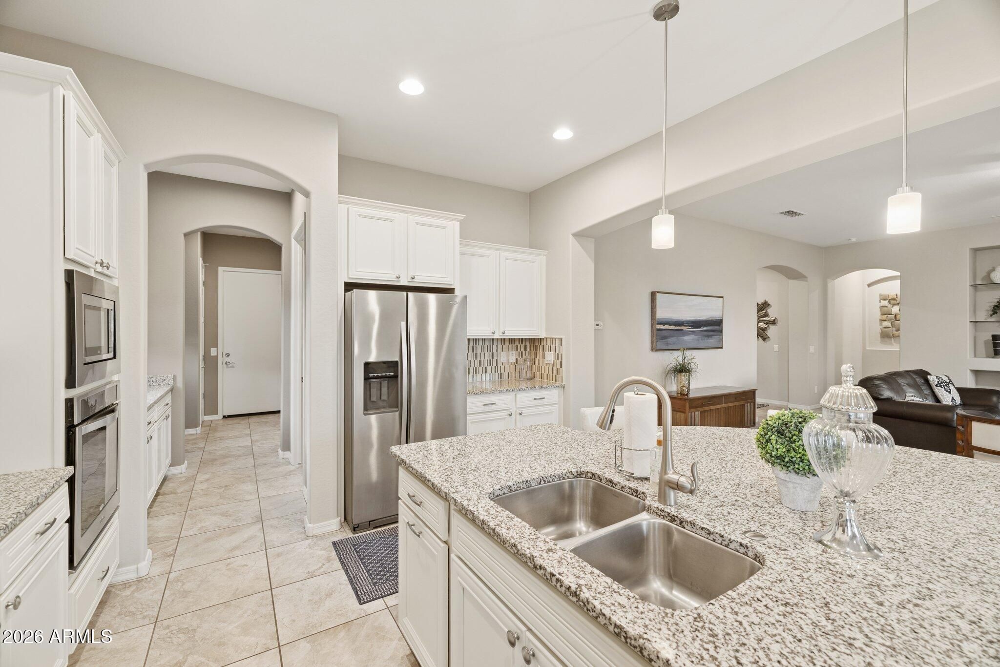 Welcome to Sun City Festival, a premier 55+ Active Adult Community known for its resort-style amenities and well-designed, single-level living. Set on a spacious corner lot, this home offers easy lock-and-leave living, all within a community framed by the scenic White Tank Mountains. A private brick paver courtyard creates a warm and inviting first impression. Inside, a light filled interior with a neutral palette, oversized windows, and 10-foot ceiling sets the scene for a clean cohesive layout. The kitchen features an oversized island with breakfast bar seating, stainless steel appliances, a pantry, and casual dining nook, all opening to the main living area, with automated blinds. A separate dining room or flex space with a French door entry adds versatility for hosting, a home ..... office or hobbies. The split floor plan offers privacy, with the primary suite designed as a quiet retreat, complete with dual vanities, an oversized walk-in closet, and a spacious walk-in shower. Two additional bedrooms are connected by a shared bathroom, creating a comfortable setup for guests. The backyard is designed for low-maintenance desert living, featuring a covered patio with a ceiling fan and a built-in mister system. Additional highlights include a golf cart garage and extended paver driveway. Living in Sun City Festival means access to an elevated lifestyle, with multiple recreation centers, resort-style pools, fitness facilities, pickleball, golf at Copper Canyon, on-site dining at Indigo Grille, and a full calendar of clubs, classes, and social events.