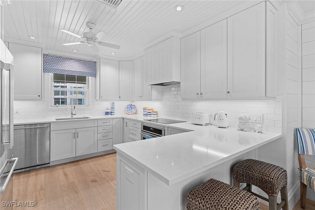 This thoughtfully renovated beachside villa at The Cloisters captures a relaxed yet refined coastal lifestyle, where timeless design and everyday ease come together near the sand. Wide-plank white oak floors, custom tongue-and-groove ceilings, and a soft whitewashed palette create an airy, serene atmosphere that feels sophisticated and welcoming. Sunlight fills the residence throughout the day, with views of the beach from every window, an ever-present reminder of the coastal setting and a backdrop for morning coffee, afternoon breezes and sunset evenings. The interior flows effortlessly, lending itself equally well to quiet mornings by the water and relaxed gatherings with family and friends. The villa offers the convenience of a private elevator, in-unit washer and dryer, a one-car garage, and ample additional storage. Recent updates include new electrical systems, water heaters and air-conditioning, blending timeless coastal design with modern comfort just moments from the beach.