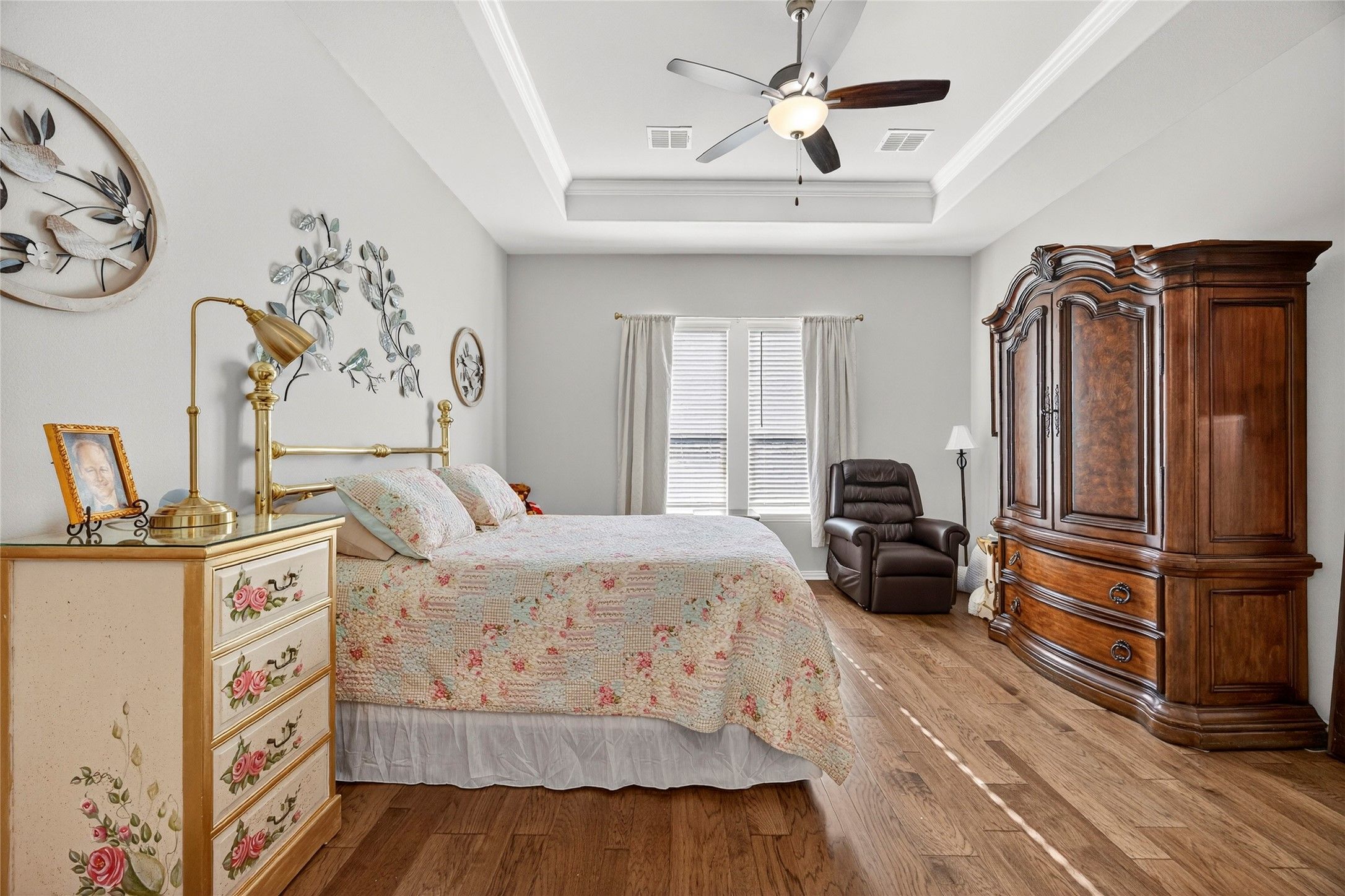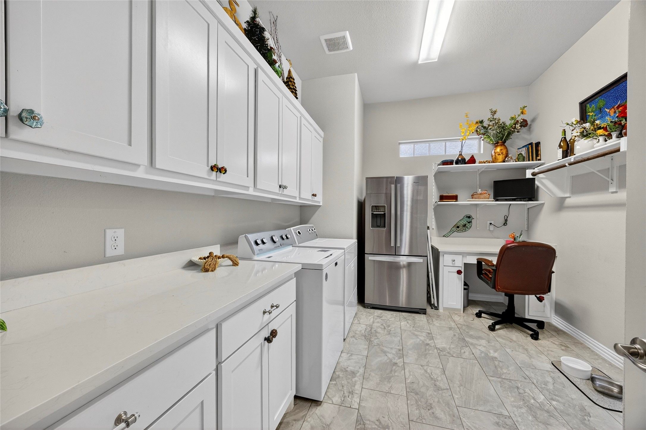 STILL TAKING BACK UP OFFERS! Welcome to this stunning home in the highly sought after 55 plus community of Ladera, offering designer upgrades, a flexible floor plan, and peaceful walking trail views. Step into a large welcoming entryway that flows into the expansive great room and into the heart of the home where the kitchen shines with soaring cathedral ceilings and beautiful wooden beam accents, creating an impressive yet inviting space. The open concept living area connects to the dining space highlighted by a striking brick accent wall and continues into a charming sitting area or sunroom overlooking mature trees and trails. Natural light fills the home while maintaining a warm and comfortable feel throughout. The kitchen features quartz countertops, abundant cabinetry, and a butlers pantry with walk in pantry, brick accent shelving, and wine fridge. The home offers two oversized bedrooms, each with its own en suite bath, plus an additional hall bath for guests. The secondary bedroom is generously sized and its bath includes an upgraded walk-in soaking tub. The primary suite overlooks the trails and connects directly to the primary bath and closet. The oversized laundry room includes quartz countertops, extensive cabinetry, built in desk space, room for an additional refrigerator, and flows conveniently into the primary closet and bath. A dedicated flex space can serve as an office, dining area, or hobby room. Enjoy the screened in porch and small yard, perfect for grilling and relaxing. Every detail reflects quality craftsmanship and thoughtful design in one of the areas most desirable 55 plus communities.
