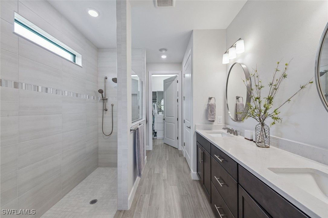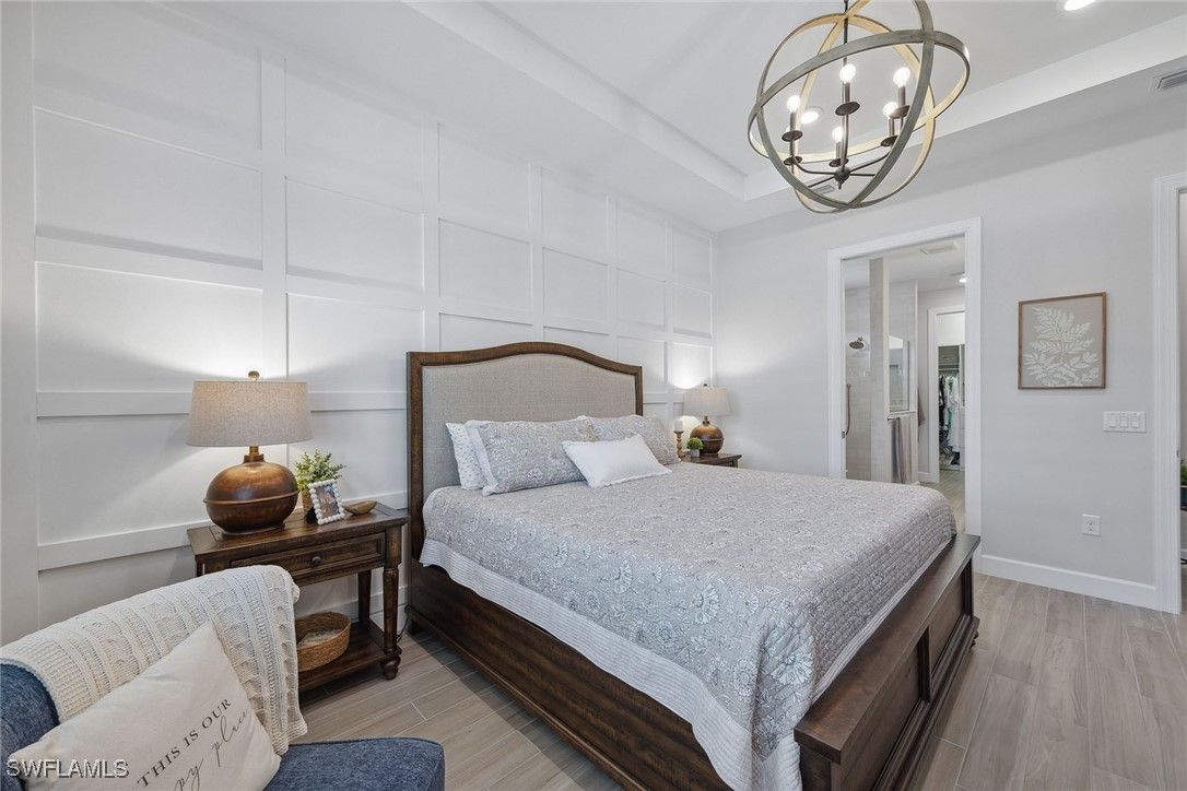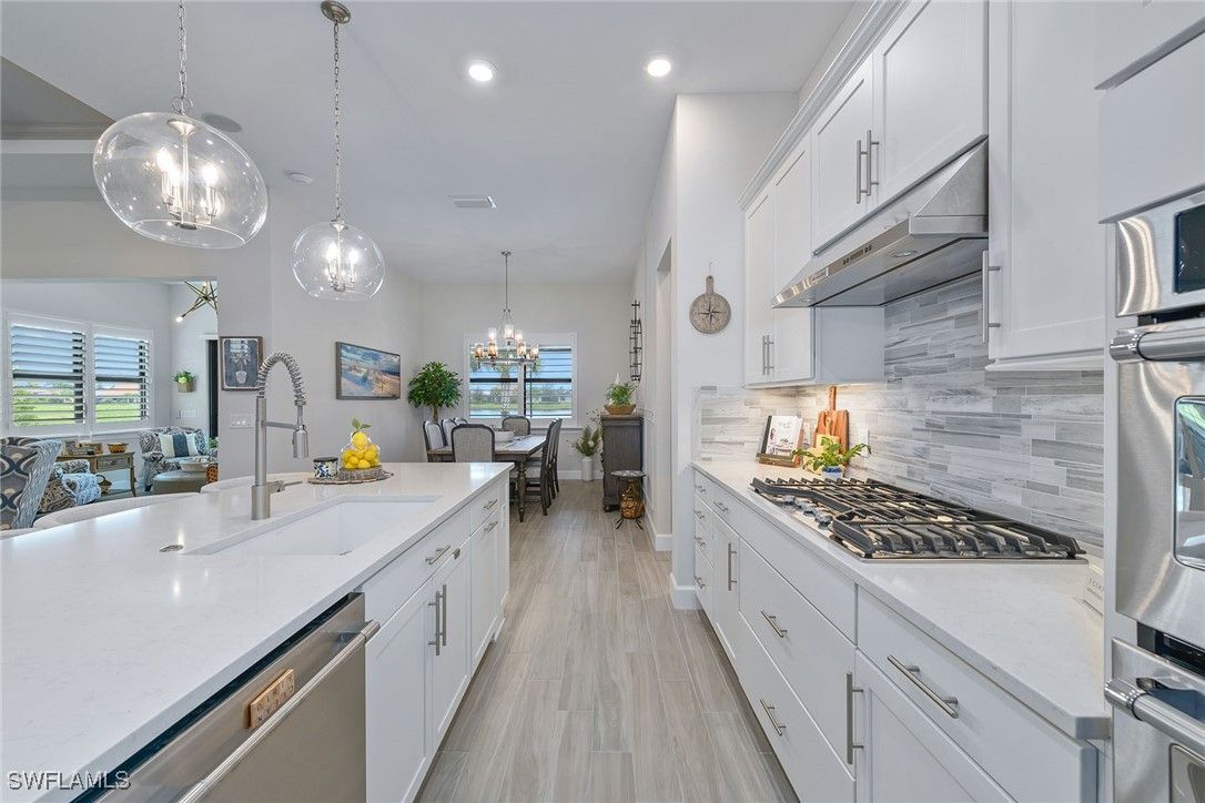 Are you searching for a modern single-family pool home with western exposure, an end-lot setting, and no neighbors on three sides? In the sought-after Amaranda section of Fiddler’s Creek and built in 2020, this stunning three-bedroom plus den residence offers private, unobstructed lake views, a sunlit split-bedroom floor plan and a spacious two-car garage. Upon entry, custom shiplap accent walls lead you into the light-filled living space, where wood-look tile flooring, plantation shutters, and elegant coffered and tray ceilings create a welcoming yet sophisticated atmosphere. The open kitchen is a designer’s dream, featuring white shaker cabinetry, quartz countertops, a mosaic tile backsplash, under-cabinet and recessed lighting, a generous island with bar seating, and high-end KitchenAid appliances including a gas range with hood, French-door refrigerator with icemaker, built-in microwave and oven, and dishwasher. The adjacent dining area showcases a modern chandelier and a scenic window overlooking the lake. The living room, highlighted by a coffered ceiling and sleek ceiling fan, flows into a cozy Florida room, an ideal retreat for reading or savoring your morning coffee while enjoying peaceful views, before opening to the screened lanai, where a custom pool sets the stage for ultimate outdoor relaxation. The lanai offers an ideal outdoor living experience with a covered area, stainless steel built-in barbecue, sink, mini refrigerator and granite countertop for entertaining or enjoying peaceful sunset views over the lake. Impact-resistant doors and windows ensure peace of mind throughout. The primary suite offers serene lake views, custom wall trim, pocket-door entry into the en-suite bath, dual sink quartz vanity, and a large walk-in shower with bench, tiled floor to ceiling. A walk-in closet boasts built-in cabinetry for exceptional organization. The two guest bedrooms, one featuring a charming bay window, share a well-appointed bath with tub-shower combo. The den, with French-door entry and tasteful trim work, makes a refined home office or study. A beautifully finished laundry room, complete with cabinetry, quartz countertop, and Whirlpool washer/dryer, adds to the convenience. The garage is equally impressive—epoxy flooring, custom built-ins, and a utility sink support style and functionality. Residents enjoy access to world-class amenities at the 24,000-plus-square-foot club and spa, including poolside and fine dining, a fitness center with trainers and classes, resort-style pools with waterfalls and slides, spa, sauna, steam room, tennis, pickleball, bocce and a full social calendar. Look forward to planned renovations in 2025. Optional memberships are available for The Tarpon Club (beach/marina access) and The Golf Club at Fiddler’s Creek with its newly remodeled clubhouse. Ideally close to Marco Island, downtown Naples, beaches, dining, shopping and coastal recreation, this home offers a resort-lifestyle every day.