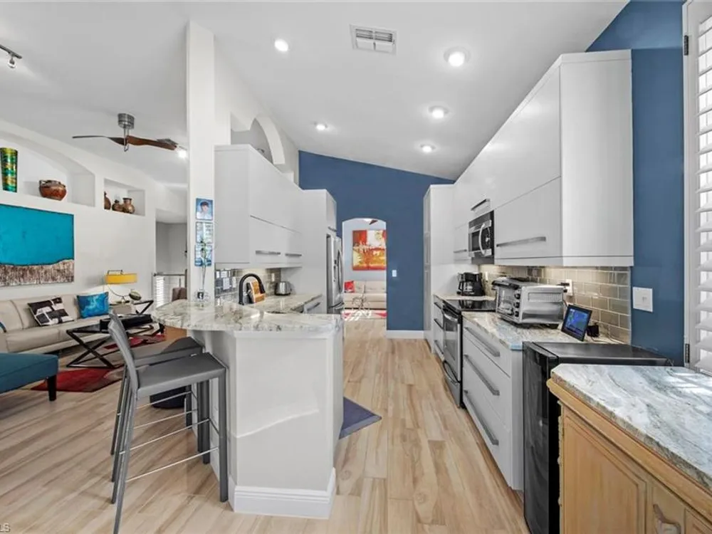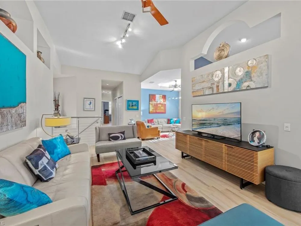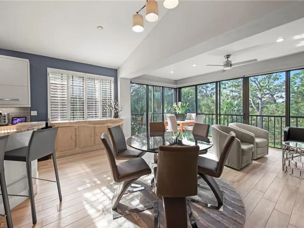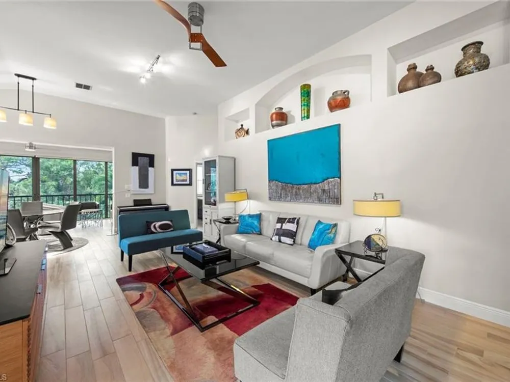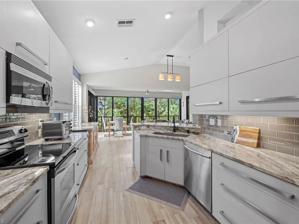 AMAZING VALUE!! This SIMPLY STUNNING second floor home has been thoughtfully redesigned and UPDATED TO THE HIGHEST QUALITY from the modern stainless steel and wire railings to the European kitchen cabinetry, wood plank look porcelain floors, plantation shutters, baths updated with granite counters and vessel sinks, designer lighting and fans and more. The beautiful MODERN EUROPEAN INSPIRED KITCHEN opens to a lovely dining area and living area which seamlessly flow to the large lanai where you will enjoy multiple seating and dining options, all of which is protected with HURRICANE IMPACT SLIDERS allowing for four season enjoyment of the wide landscaped views and spectacular Southwest Florida sunsets. The large master bedroom suite is complete with a walk in closet and luxurious bath. Two guest bedrooms, one with a BONUS connected room perfect for grandchildren sleeping area or a guest den, and a guest bath provide plenty of private space for overnight guests. An additional space currently used as a den can easily be transformed into a formal dining area or game room. Well located JUST STEPS FROM THE COMMUNITY POOL, SPA AND TENNIS COURT in the charming and conveniently located neighborhood of Oakwood, this home is just a short walk or bike ride to club amenities, community activities at Riverwalk Park or the popular Promenade shopping and dining plaza. This building has been repainted and had a new roof in the past few years. Bonita Bay amenities include 3 parks, a private beach park with in season shuttle service, 12-mile network of walking trails, and a resident owned marina and restaurant, resident pickle ball and bocce ball. The Bonita Bay Club is member owned and offers 5 golf courses, 18 tennis courts, restaurants, spa and salon, state-of-the-art fitness center, club pickle ball and croquet and resort style swimming pool with Breezeway cafe and bar and numerous social activities. Truly a one of a kind offering, this property is being sold TURNKEY FURNISHED so you can move right in and start enjoying the renowned Bonita Bay lifestyle!
