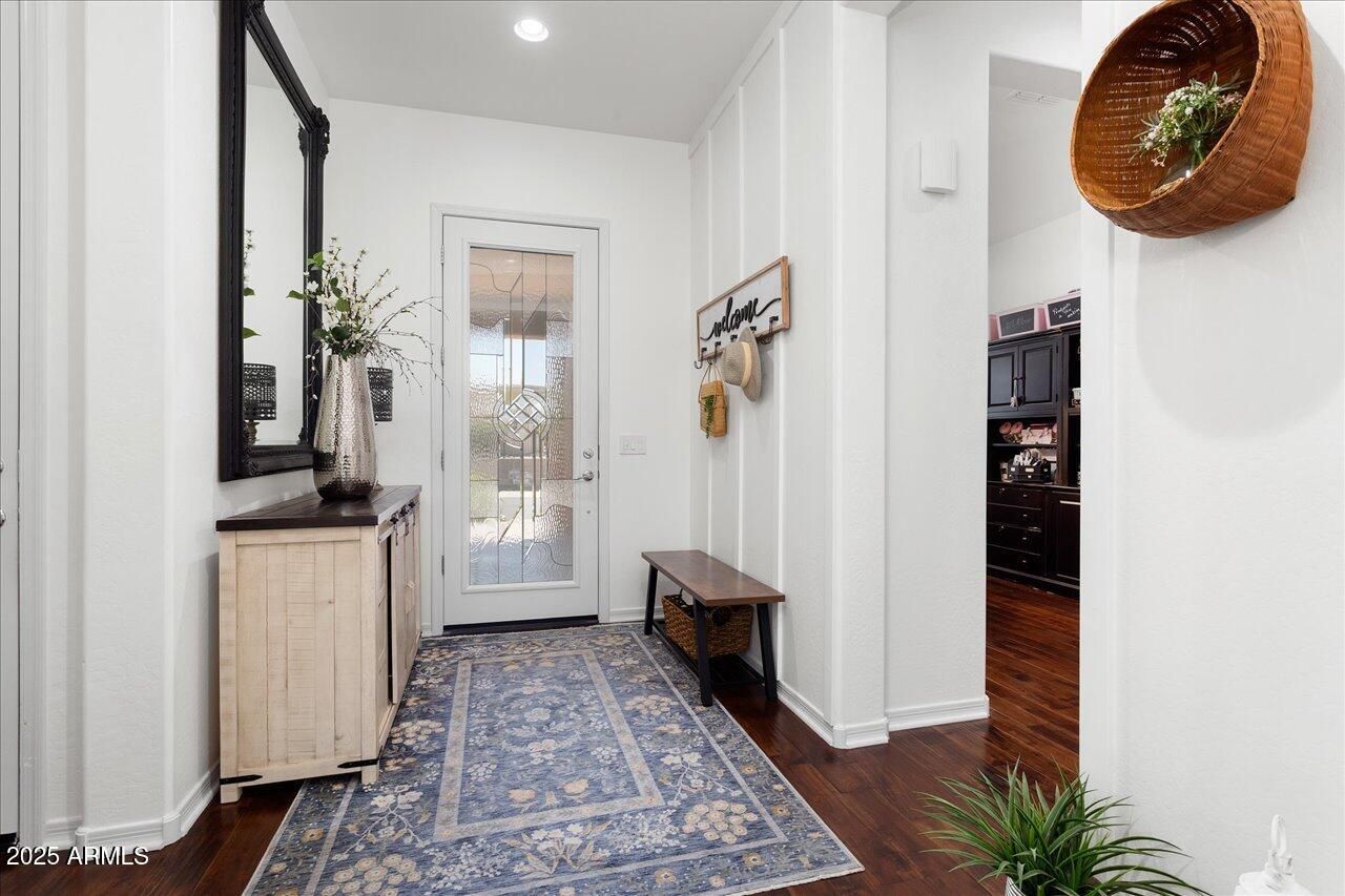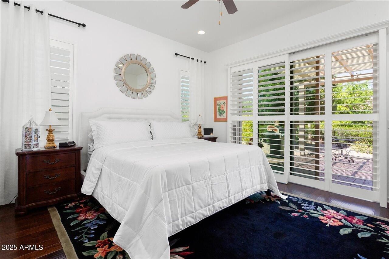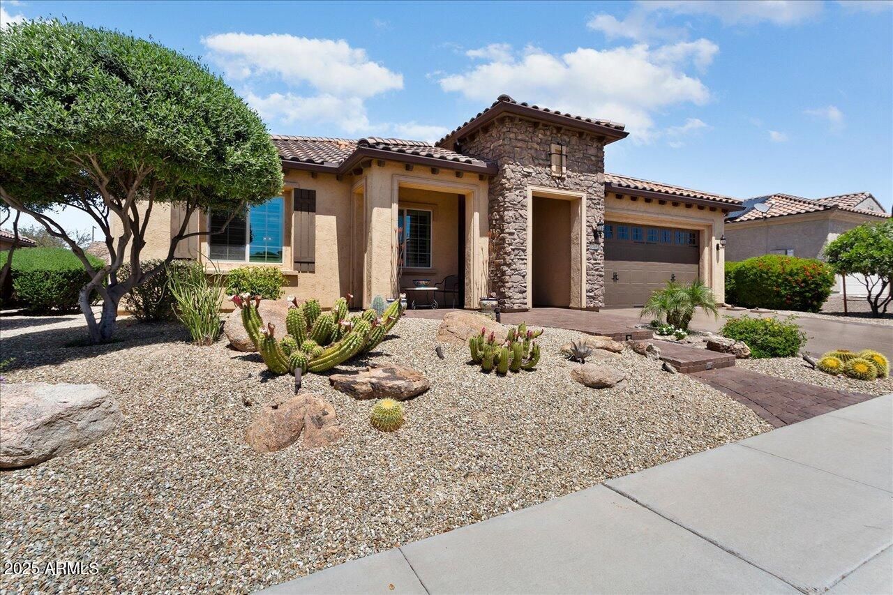 Step inside this inviting modern farmhouse-style Pursuit model, ideally situated in Sun City Festival! As you enter, the painted white wood accent walls in the foyer and great room create a warm and welcoming atmosphere, complemented by beautiful, engineered wood floors that flow throughout the living space. Large windows adorned with white wood shutters fill the home with natural light, accentuating the airy and open layout. The thoughtfully designed kitchen features dark wood cabinets, some with glass fronts; sleek granite counters, and premium stainless-steel appliances, makes for a chef's delight and focal point for gatherings. The primary suite is a peaceful retreat with a luxurious bathroom including a large walk-in shower. The additional bedroom offers ample space for guests or family. Additionally, a flex room allows space for a home office or hobbies. Step outside through one of two sliding doors (one in the great room, and one in the primary suite) to discover a landscaped private backyard oasis. Whether hosting gatherings or enjoying quiet evenings under the stars, the brick patio and pergola offer the perfect setting amidst lush greenery. This home is more than just a place to live - it's a sanctuary where modern comfort meets timeless charm.