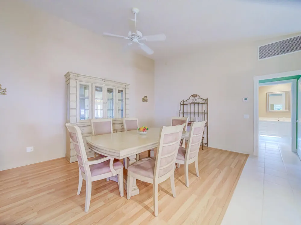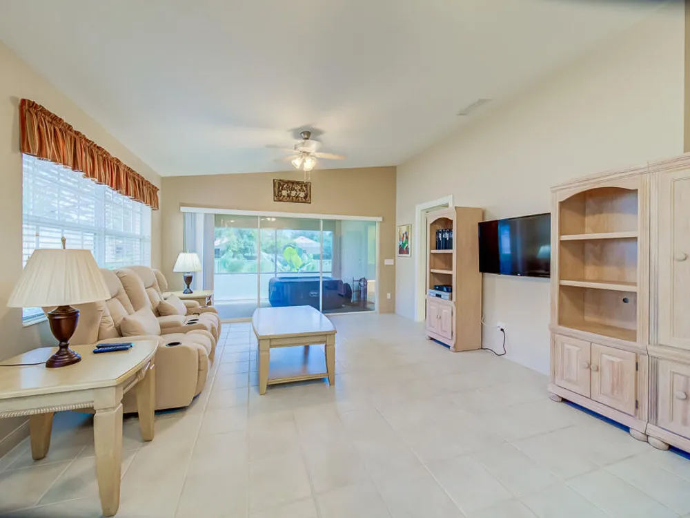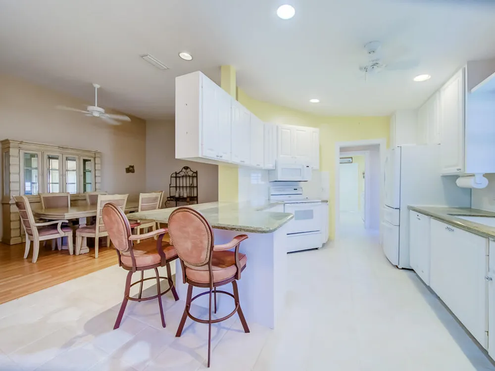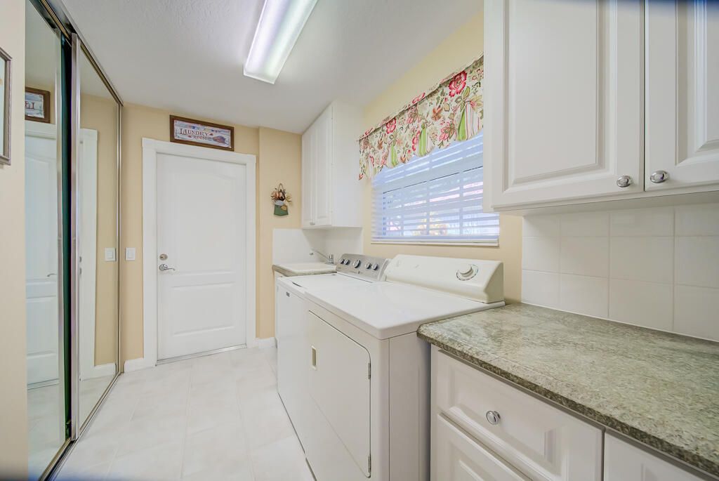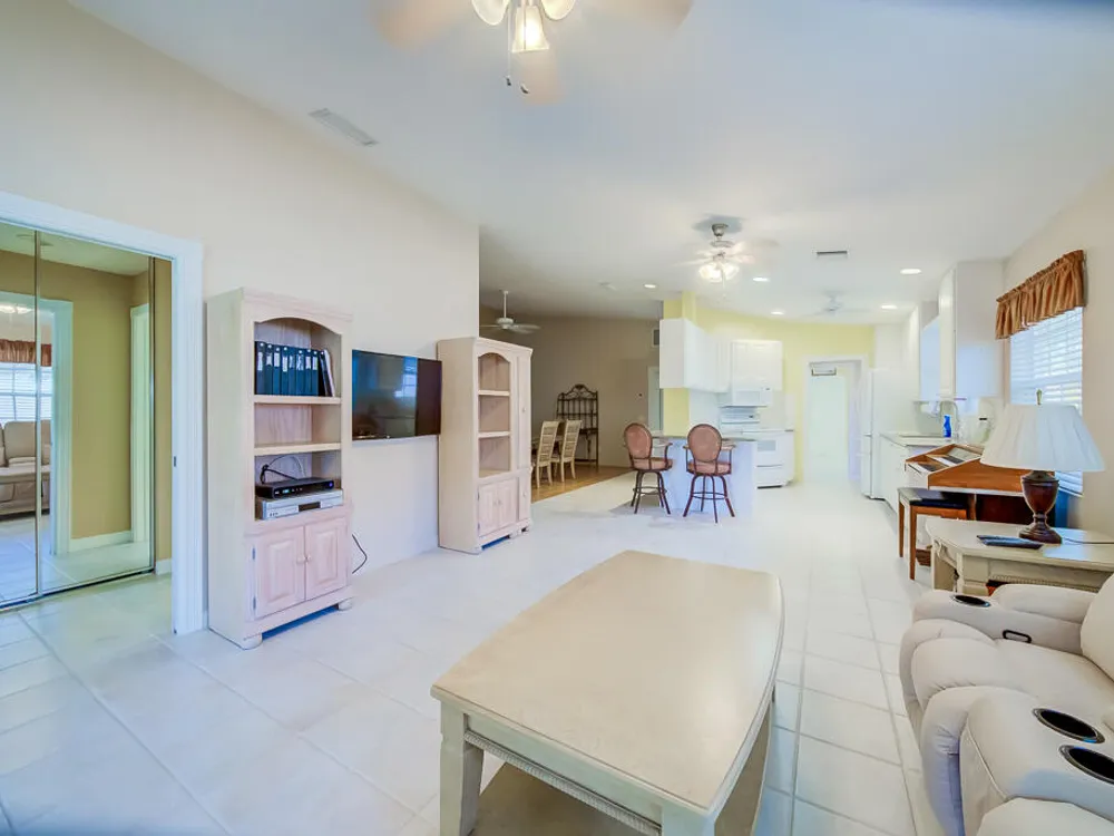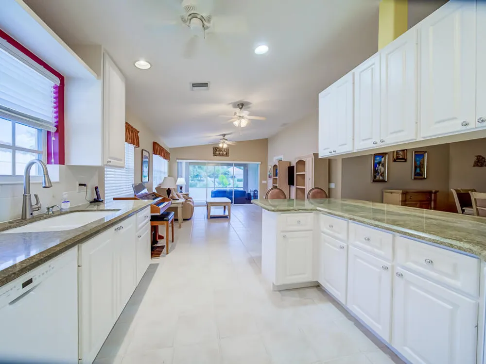 Welcome to this charming lakeview villa, offering 2 bedrooms, 2 bathrooms, and a 2-car garage. RiverWalk offers luxury, resort-style living with ought membership fees! This one-story home features an open layout with elevated ceilings, neutral colors, tile floors in common areas, recessed lighting, and ceiling fans. The modern kitchen boasts white cabinetry and granite countertops, perfect for culinary pursuits. An inside laundry room adds convenience, complete with a sink and washer/dryer. The spacious master bedroom includes laminate floors, a walk-in closet with custom built-ins, a second closet, and an ensuite bathroom featuring a double vanity sink, shower with glass doors, and a linen closet.