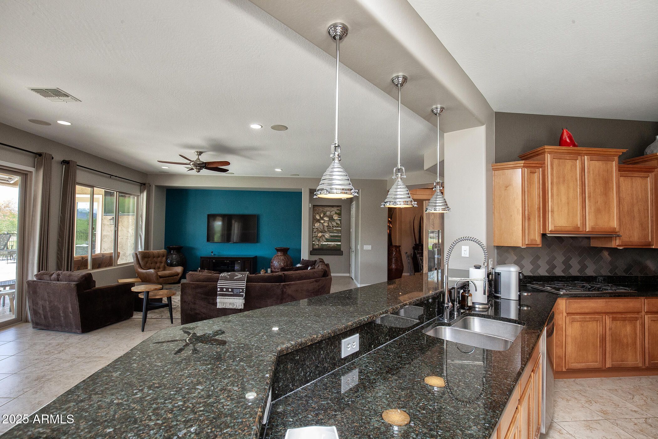 2BR 2 1/2 BA plus den with Murphy Bed that can be used as 3rd Bedroom for guests. Huge 3 Car garage. Popular PARADA MODEL w/Sparkling Pool & SOLAR that sits on a Fabulous Golf & Mountain View lot, overlooking 3rd and 4th holes on The Vista Course. Enjoy dramatic sunsets from the private lot overlooking the vast Arizona sky and Mountains. All the amenities Sun City Festival has to offer. Proximity to desert hiking trails. This is a great LIFESTYLE decision. Don't miss it! Mostly furnished and turn key ready.