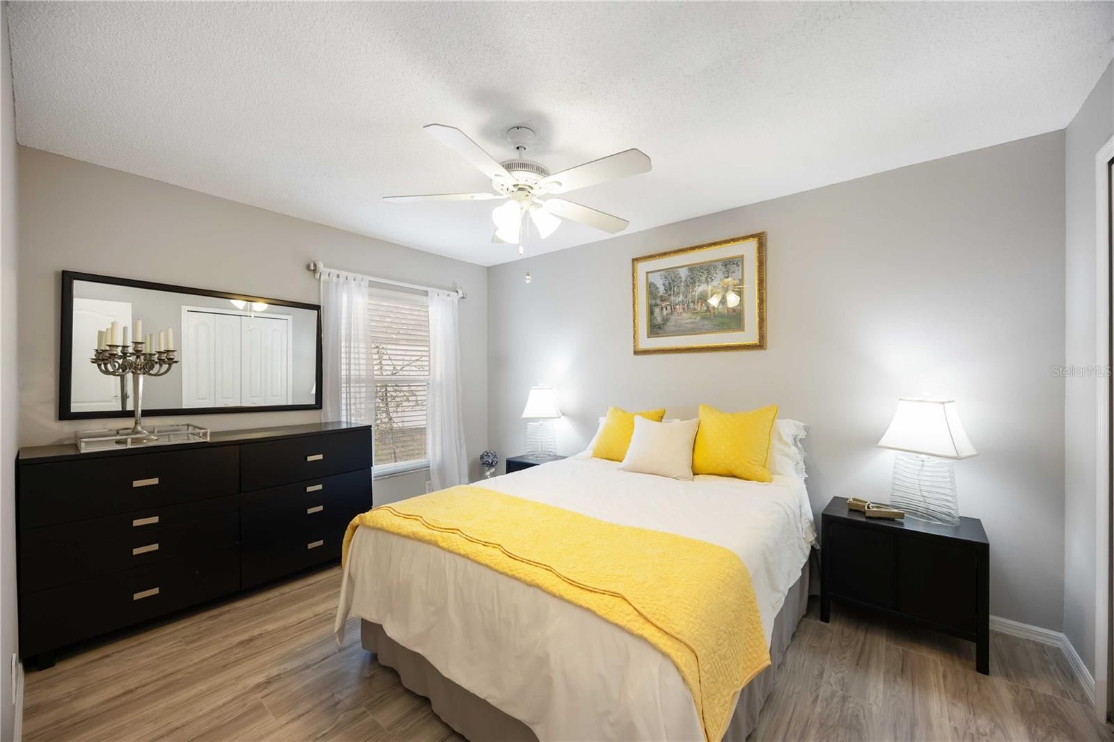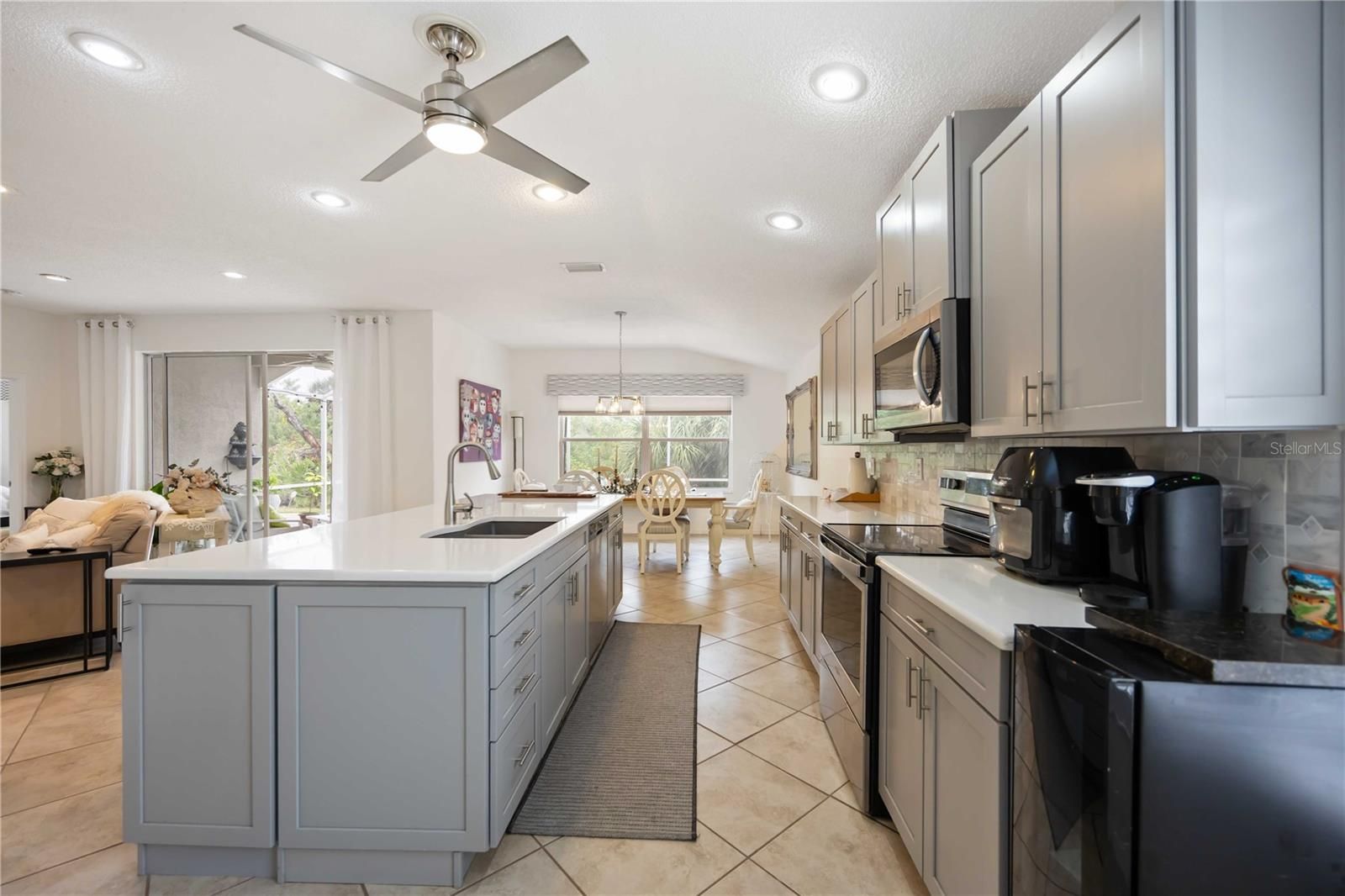 Stunning and tastefully updated located in the desirable deed restricted community of Fairway Village. Recently updated with a shingle roof (2022), A/C (2025), laminate flooring installed in the bedrooms (2025), and so much more! The manicured landscape and colorful plants lead you to the front screened entry. Upon entering, a myriad of elegant architectural features including vaulted ceilings, crown molding, diagonal laid tile, impeccable decor, neutral color scheme, and a freshly painted interior (2026) awaits. This spacious floor plan is desirable for every occasion featuring a great room with two sitting areas, a spacious designer forward kitchen that has been completely remodeled and features, quartz countertops, marble backsplash, stainless steel appliances, a large island and breakfast bar with additional wood cabinets and pullout drawers, upgraded lighting & fan--and a formal dining area where you can host dinners with your close family and friends. You can easily expand your living space outdoors with your double sliding glass doors in the living room to your private Florida oasis! Enjoy both the sun and shade with a large 12' x 7' covered lanai, and an expansive, screened 25' x 10' area where you can enjoy your morning cup of coffee and gathering with friends...of all this plus a brand new (2026) brick paver patio in your backyard-- all surrounded by the privacy of the preserve--truly paradise! There is plenty of room inside with the "split" bedroom layout--the primary suite is separate with a spacious bedroom with a large walk-in closet, easy to maintain new laminate flooring & an ensuite bathroom with dual sinks, tile flooring, private water closet and linen closet . On the opposite end of the home, there are 2 bedrooms and the guest bathroom--both bedrooms feature sizable closets, upgraded lighted fans, and the same new laminate flooring. The guest bathroom provides optimal space for your guests with ample cabinet and counter space, upgraded vanity lighting, and a shower/tub combo. Lets not forget the laundry room with cabinets, TWO additional storage closets, and access to the two-car garage. Enjoy the peace of mind and savings of hurricane shutters and the property is located in an 'X flood zone'...all you could ever want plus more! Don’t wait, come live the Florida dream! Located just minutes from Plantation Golf & Country Club, Wellen Park, beaches, quaint shopping, restaurants, easy access to I-75 and so much more! Come see this immaculate home for yourself!