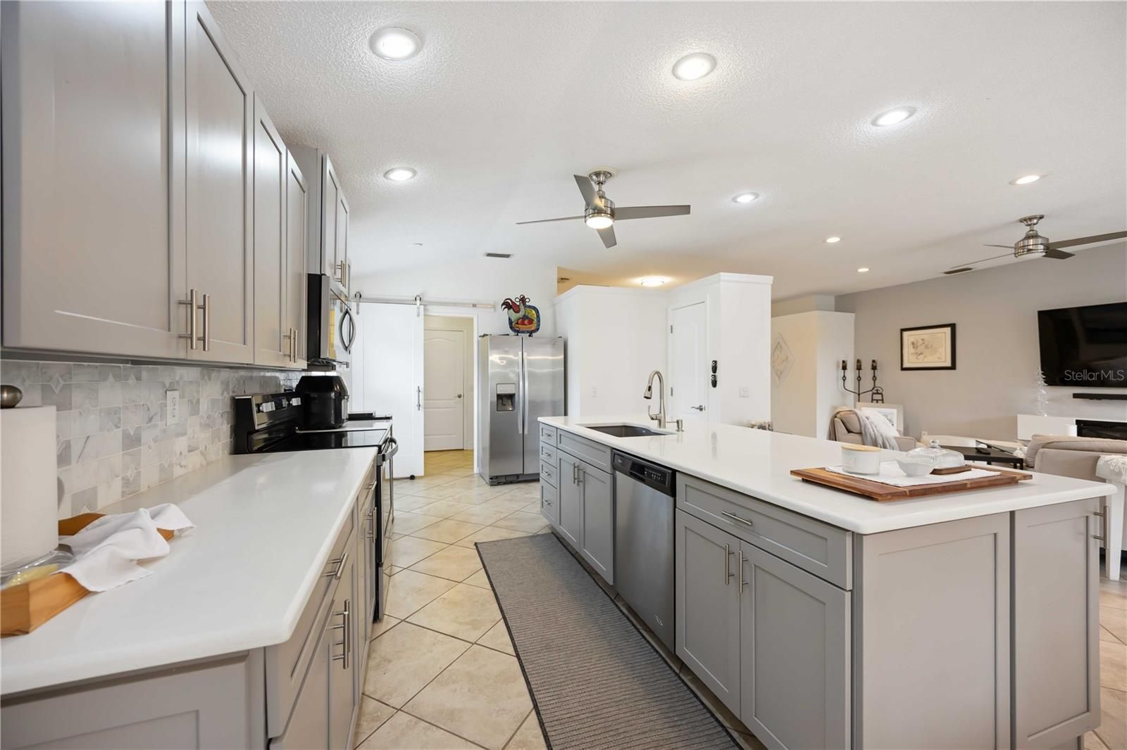 - Ceiling Fan(s), Kitchen/Family Room Combo, Open Floorplan, Main Level Primary, Solid-Wood Cabinets, Split Bedrooms, Stone Counters, Thermostat, Walk-In Closet(s)