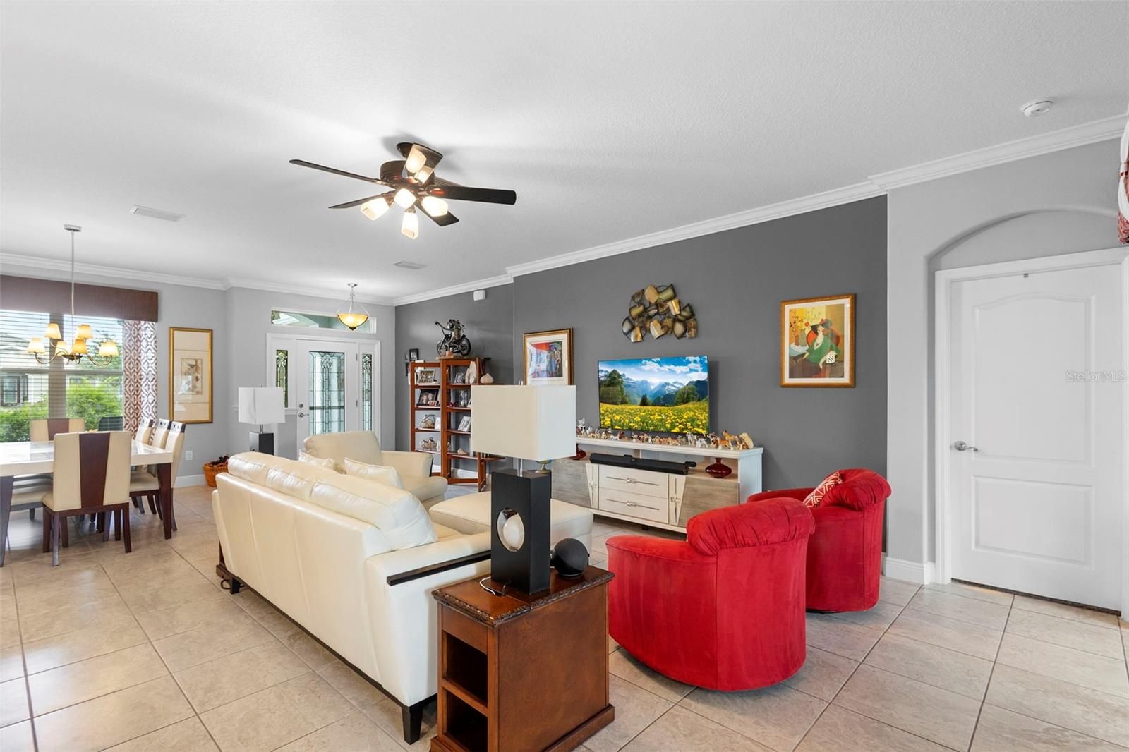 NEW ROOF! This beautifully landscaped property offers a 3-bedroom, 2-bath split floor plan with an open-concept layout, outfitted with crown molding and designed for modern living. The master suite is a private retreat, featuring a walk-in shower, double vanity, and a custom walk-in closet with a organized well thought out closet system. The gourmet kitchen boasts a large island with granite countertops, solid wood cabinets, stainless steel appliances, and stylish backsplash, complemented by a breakfast nook. With plenty of room the separate but (still visbile) living and dining rooms makes it great for entertaining. There is also a spacious bonus room ideal for a family room, media room, office or can even be converted into a 4th bedroom. Additional highlights include a laundry room with abundant storage, water softener, and a 2-car garage. Relax year-round in the enclosed patio under air, complete with walls of windows for natural light and motorized shades for privacy. Arlington Ridge is a 24-hour gated and guarded community offering championship golf, resort-style amenities, and low-maintenance living. HOA fees cover lawn care, high-speed internet, cable, and full use of amenities including two pools, hot tub, fitness center, movie theater, and more. Dine at the Chesapeake Grill & Tavern, enjoy walkable streets with sidewalks and lighting, and take advantage of the community’s prime central location—just minutes to shopping, restaurants, and healthcare, with easy access to Orlando, airports, and Florida’s coasts. Don’t miss this neighborhood gem—schedule your private showing today!