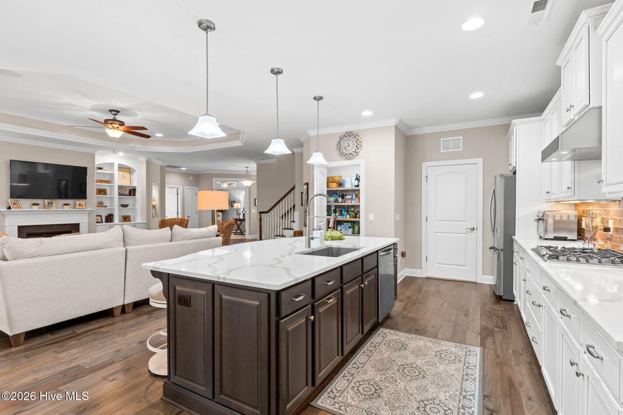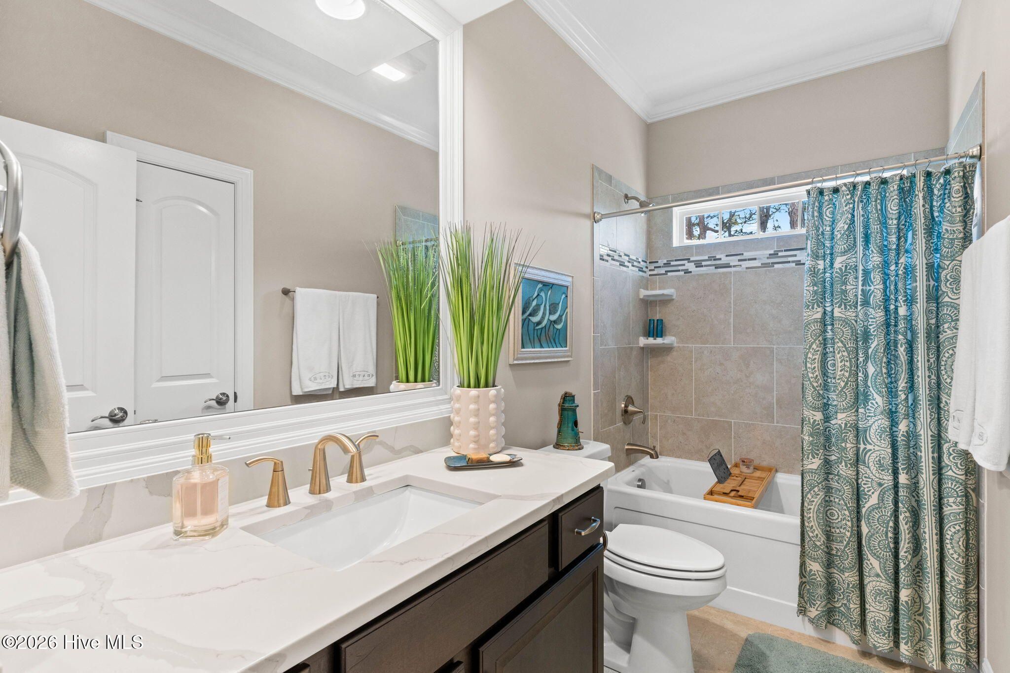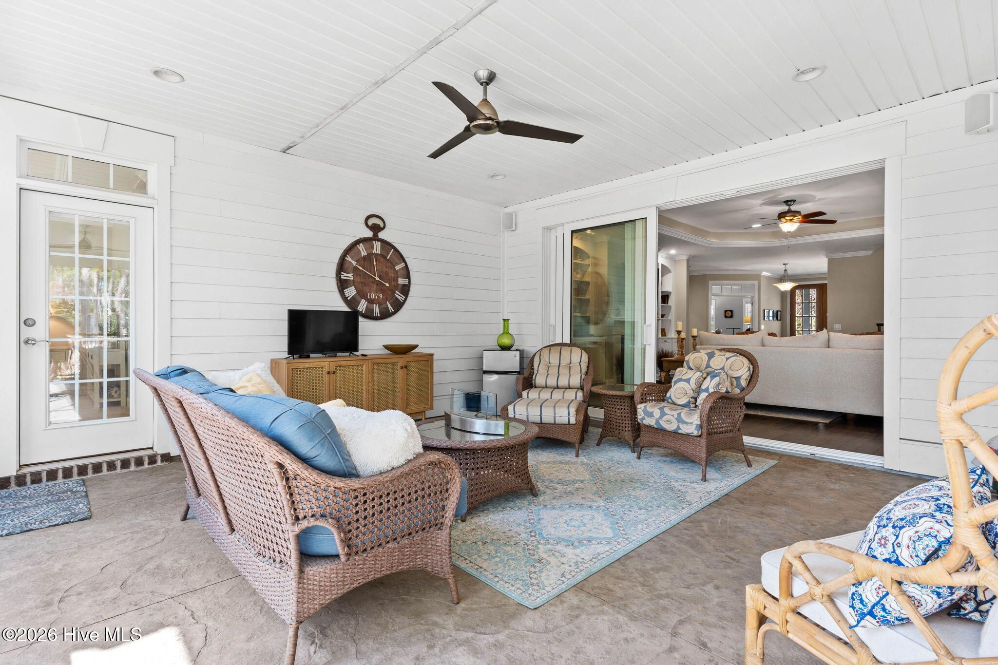 Nestled at the end of a long private driveway on a beautiful corner lot, this exceptional coastal residence offers both privacy and elegance in the highly sought-after Woodlands neighborhood of St. James Plantation. Built in 2018 by Logan Developers, the popular Ocracoke model blends timeless coastal architecture with refined craftsmanship and modern comfort. Charming rocking-chairs on the front porch welcome you home and provides the perfect place to unwind while taking in peaceful wooded views. Step through the impressive mahogany front door into a bright, open-concept living space where custom built-ins frame a gas fireplace, creating a warm and inviting focal point for gatherings and everyday living. Just off the main living area, a sophisticated study with coffered ceilings and French doors offers an ideal work-from-home retreat or quiet reading space. The beautifully designed kitchen is both stylish and functional, featuring a gas cooktop, wall oven, built-in microwave, expansive center island with sink, and a generous walk-in pantry--perfect for entertaining family and friends. The spacious primary suite with an accent lit trey ceiling features his and hers walk-in closets and custom wood shelving and enjoys an abundance of natural light. A huge ensuite master bath provides dual vanities, a luxuriating sunken tub, a roomy tiled shower, an enclosed commode, and a generous linen closet. A private guest suite with a full bath on the main level ensures comfort and privacy for visitors. Upstairs, a versatile bonus room with a full bathroom offers endless possibilities as a third bedroom, media room, or private guest retreat. There is a substantial, easily accessed second floor unfinished storage area. Everyday living is made easy with a large mud room and has a built-in drop zone, laundry area, and additional space for folding and storage. A 3 panel set of 8' sliders lead from the family room to a sprawling screened porch with decorative and durable stamp Crete flooring and overlooking a tranquil private wooded backyard. An oversized 2 car garage with soaring 12'' ceilings provides ample room for parking, storage and a workshop. Irrigated mature landscaping abounds offering naturlal beauty as well as privacy. Located within walking distance to Woodlands Park, the amphitheater, walking trails, and dog park, this home offers the perfect blend of tranquility and community connection. Residents of St. James Plantation enjoy an unparalleled coastal lifestyle with 81 holes of championship golf, four clubhouses, multiple restaurants, resort-style pools, tennis and pickleball courts, a full-service marina, kayak launch, and an exclusive private beach club on Oak Island.