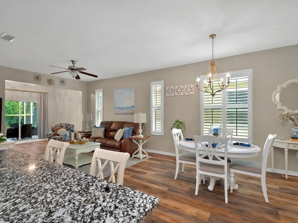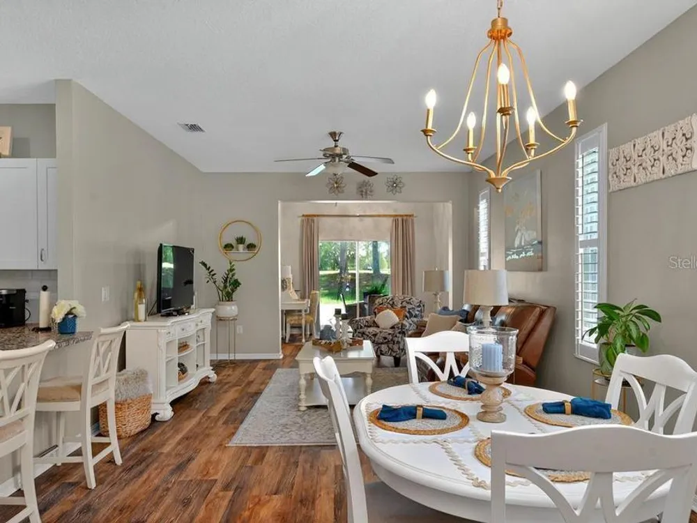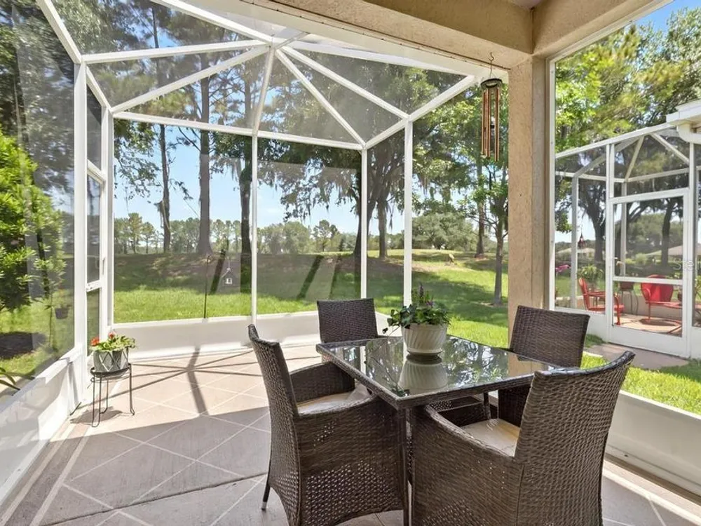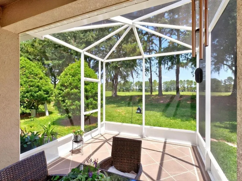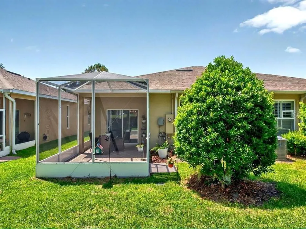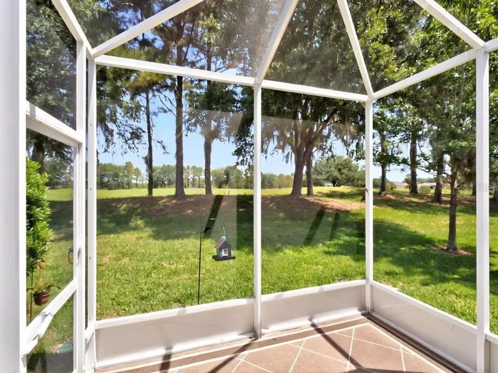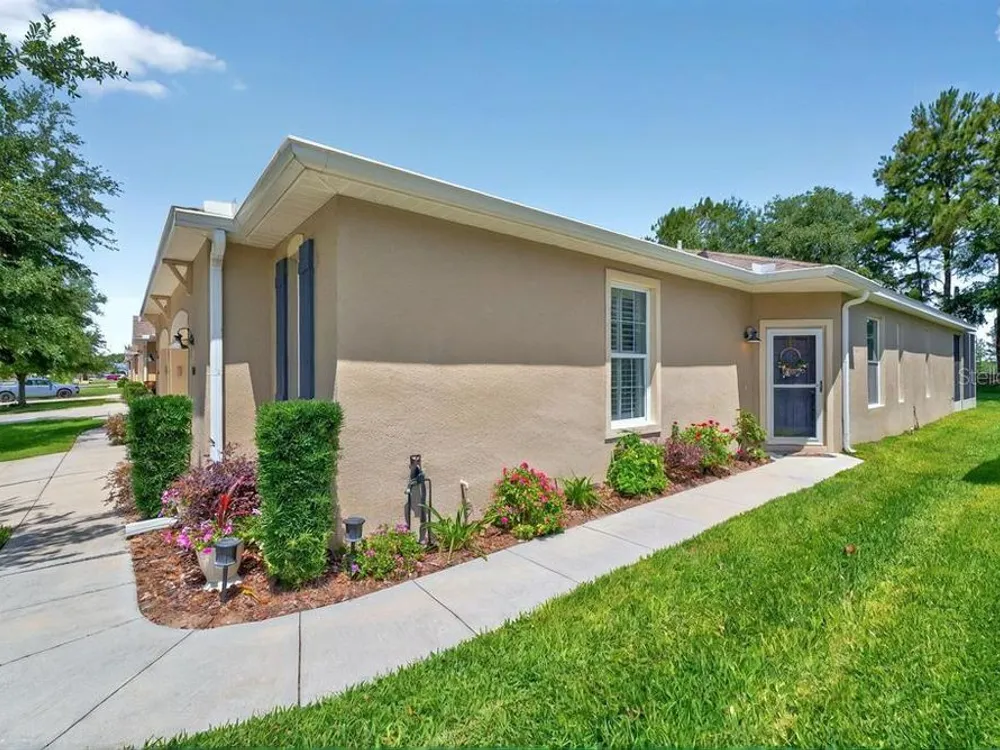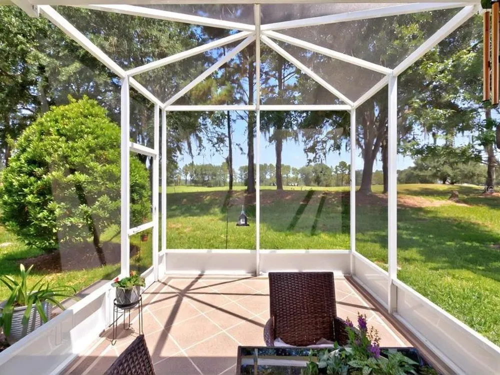 Carefree Living . . . Charming Villa, Low Maintenance, Amenities and Activities Galore . . . Highly Desirable Community of Arlington Ridge. Step inside this Charming light and bright home with 9' ceilings throughout, neutral paint color throughout, luxury vinyl plank flooring, double pane windows with Plantation Shutters, Glass Entry Storm Door, View of the Golf Course from the Screened Lanai and no neighbors behind you. Open Floor Plan Features Living and Dining Room Combination, Kitchen with 36" luxury cabinets, cabinet drawer stack, granite counters, stainless steel appliances and a generous size pantry. Spacious Master Bedroom has two closets with one of them being a walk-in closet, ensuite bathroom with double vanities, and granite counters. The second bedroom and bathroom are on the opposite end of the villa for privacy. The flex/bonus space can be used as an office, exercise area, sitting/reading nook, or hobby room and could easily accommodate a murphy bed. Generous size laundry room with laundry sink and plenty of extra storage space. Spend more time doing the things you enjoy while the exterior painting of the home, roof replacement, lawn service including mowing, edging, weed eating, blowing and lawn irrigation and spraying of lawn are included in the cost of your quarterly HOA fees. Also included in the quarterly HOA fees are 200 + cable tv channels with ability to record your favorite shows, high speed internet and router. The community has a guard at the entry 24 hours per day. This home is a short walk, YES you are within 1/2 block of all the top tier amenities the community has to offer. Enjoy a long list of amenities including an 18-hole championship Golf Course, Putting Green, Chipping Green, Driving Range, and Pro Shop. Resort Style Heated Swimming Pool with Jacuzzi and Beautiful Palms, Lap Pool, State of the Art Fitness Center with Exercise Equipment, Sauna and Showers, Lighted Tennis and Pickleball Courts, Sidewalks for Walking, Yoga, Pilates, Zumba, Water Aerobics, Water Volleyball and Various Other Exercise Classes. The community also features a theater with two free movies per week, full-service Restaurant and Pub, Billiard Room, Library, Coffee Shop, Craft Room, Game/Card Rooms and Fairfax Hall for Special Events and Performances. Crafts include ceramics, crochet/knitting, quilting, stain glass to name a few. Various clubs including Men and Women of Faith, Garden Club and Book Club. Bingo held twice per month, Card games, Dominoes, Mahjong, Euchre, Bridge, Cribbage and Others. * Please Note: The Golf Course is open to the public, memberships are available but not required to play the course or live in the community of Arlington Ridge. The Arlington Ridge 55+ Community is in the heart of Lake County where beautiful lakes are everywhere. The Harris Chain of Lakes (15,000 acres) has a nearby fishing pier and boat ramp where you can launch your boat and travel to nearby Howey in the Hills, Tavares, Mount Dora and Eustis, with dining stops along the way. The Villages are also nearby with restaurants, shops and live entertainment 365 days a year. Orlando International Airport is 1 hour away, and the West Coast Sunset is 1 hour 25 minutes away. East Coast Beaches for sunrises 1 hour 35 minutes away. And don't forget about the mouse, Walt Disney World is 50 minutes away. You are approximately 7 miles from the entrance to North or South Bound Florida Turnpike.