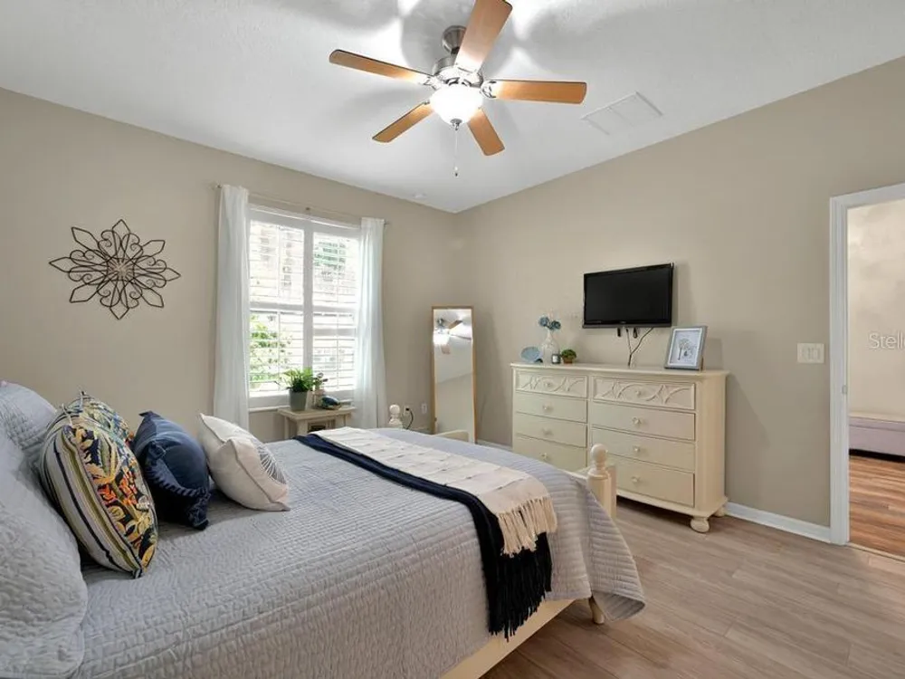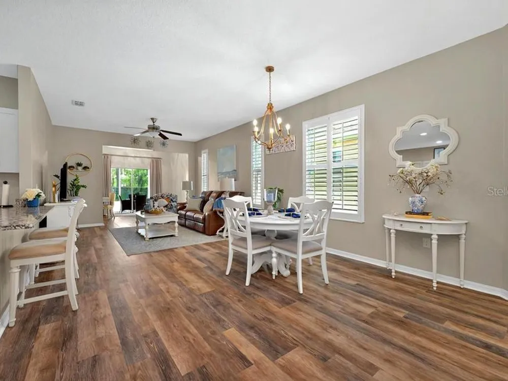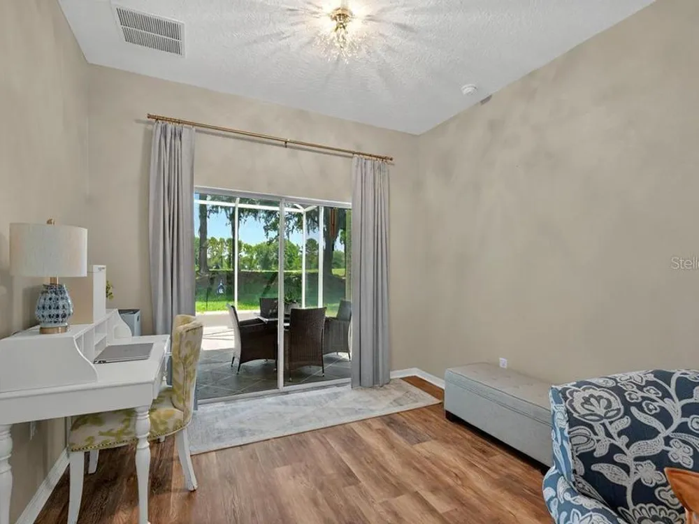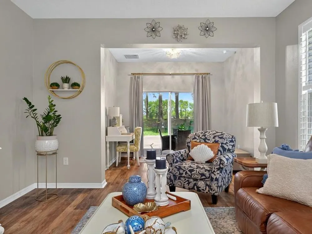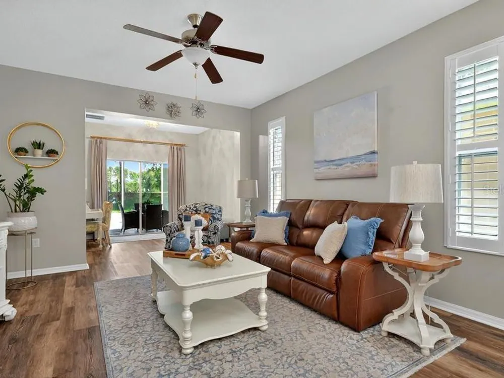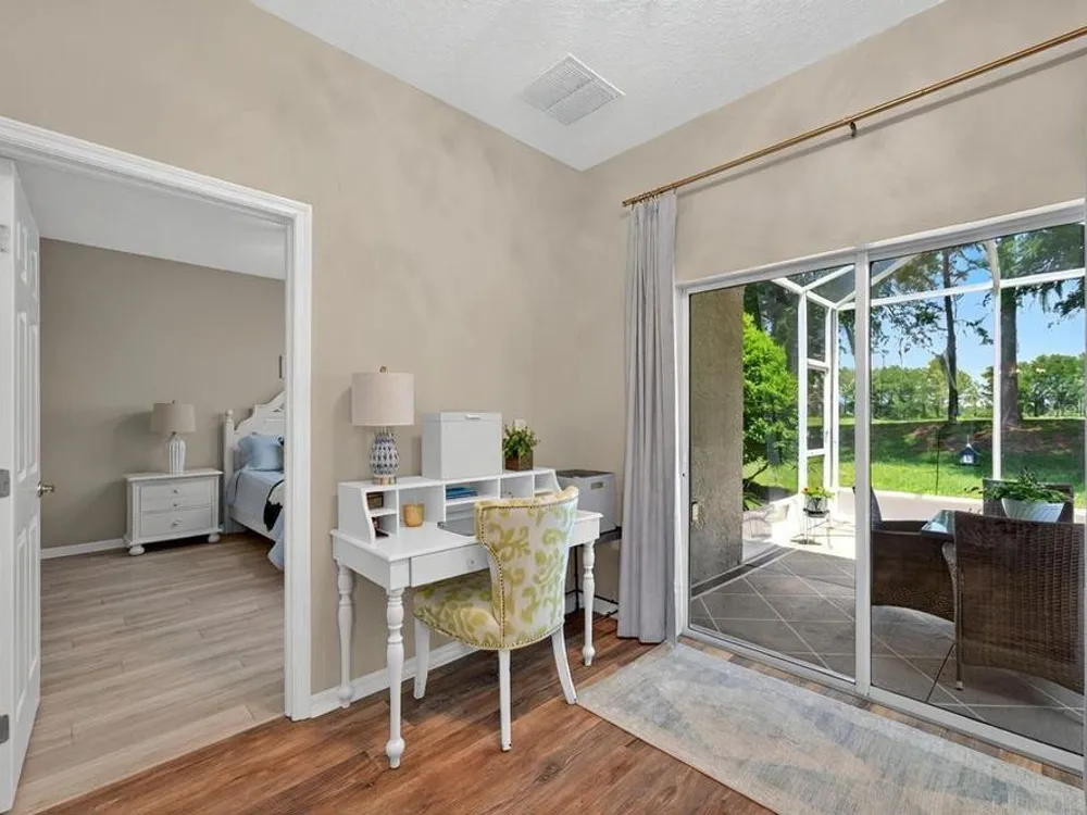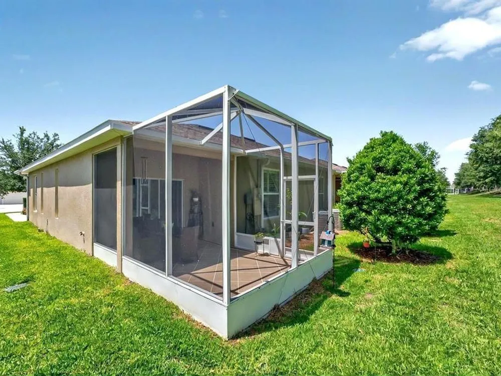 Carefree Living . . . Charming Villa, Low Maintenance, Amenities and Activities Galore . . . Highly Desirable Community of Arlington Ridge. Step inside this Charming light and bright home with 9' ceilings throughout, neutral paint color throughout, luxury vinyl plank flooring, double pane windows with Plantation Shutters, Glass Entry Storm Door, View of the Golf Course from the Screened Lanai and no neighbors behind you. Open Floor Plan Features Living and Dining Room Combination, Kitchen with 36" luxury cabinets, cabinet drawer stack, granite counters, stainless steel appliances and a generous size pantry. Spacious Master Bedroom has two closets with one of them being a walk-in closet, ensuite bathroom with double vanities, and granite counters. The second bedroom and bathroom are on the opposite end of the villa for privacy. The flex/bonus space can be used as an office, exercise area, sitting/reading nook, or hobby room and could easily accommodate a murphy bed. Generous size laundry room with laundry sink and plenty of extra storage space. Spend more time doing the things you enjoy while the exterior painting of the home, roof replacement, lawn service including mowing, edging, weed eating, blowing and lawn irrigation and spraying of lawn are included in the cost of your quarterly HOA fees. Also included in the quarterly HOA fees are 200 + cable tv channels with ability to record your favorite shows, high speed internet and router. The community has a guard at the entry 24 hours per day. This home is a short walk, YES you are within 1/2 block of all the top tier amenities the community has to offer. Enjoy a long list of amenities including an 18-hole championship Golf Course, Putting Green, Chipping Green, Driving Range, and Pro Shop. Resort Style Heated Swimming Pool with Jacuzzi and Beautiful Palms, Lap Pool, State of the Art Fitness Center with Exercise Equipment, Sauna and Showers, Lighted Tennis and Pickleball Courts, Sidewalks for Walking, Yoga, Pilates, Zumba, Water Aerobics, Water Volleyball and Various Other Exercise Classes. The community also features a theater with two free movies per week, full-service Restaurant and Pub, Billiard Room, Library, Coffee Shop, Craft Room, Game/Card Rooms and Fairfax Hall for Special Events and Performances. Crafts include ceramics, crochet/knitting, quilting, stain glass to name a few. Various clubs including Men and Women of Faith, Garden Club and Book Club. Bingo held twice per month, Card games, Dominoes, Mahjong, Euchre, Bridge, Cribbage and Others. * Please Note: The Golf Course is open to the public, memberships are available but not required to play the course or live in the community of Arlington Ridge. The Arlington Ridge 55+ Community is in the heart of Lake County where beautiful lakes are everywhere. The Harris Chain of Lakes (15,000 acres) has a nearby fishing pier and boat ramp where you can launch your boat and travel to nearby Howey in the Hills, Tavares, Mount Dora and Eustis, with dining stops along the way. The Villages are also nearby with restaurants, shops and live entertainment 365 days a year. Orlando International Airport is 1 hour away, and the West Coast Sunset is 1 hour 25 minutes away. East Coast Beaches for sunrises 1 hour 35 minutes away. And don't forget about the mouse, Walt Disney World is 50 minutes away. You are approximately 7 miles from the entrance to North or South Bound Florida Turnpike.