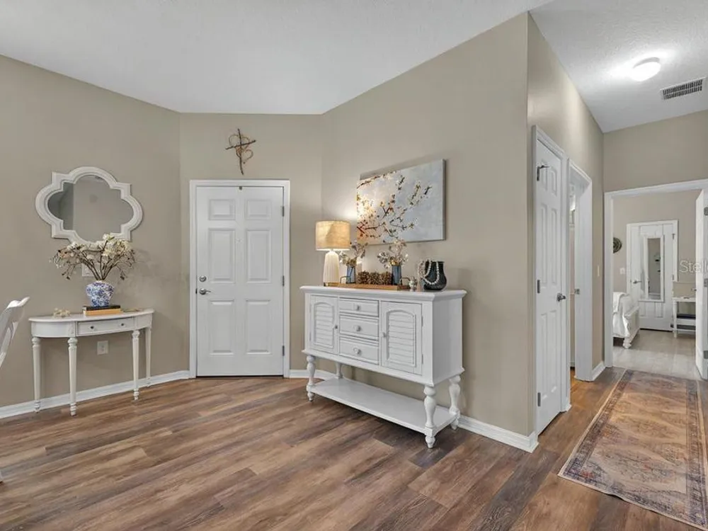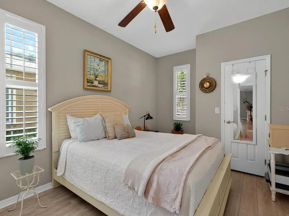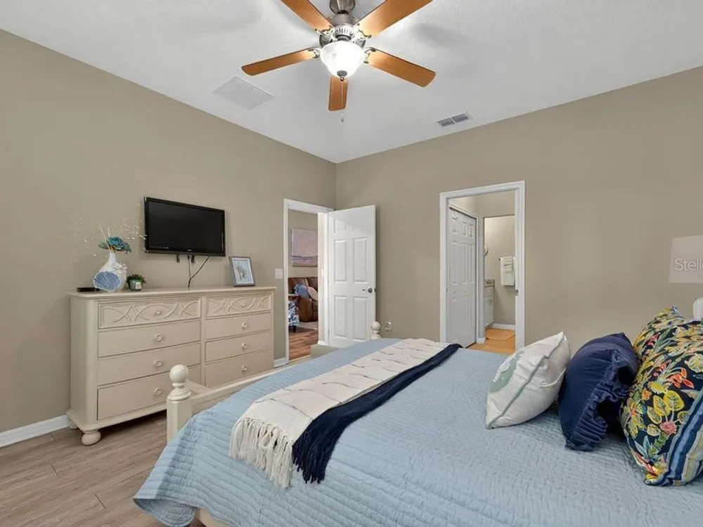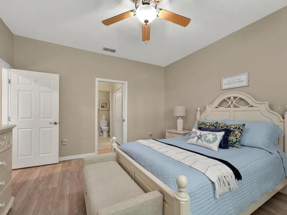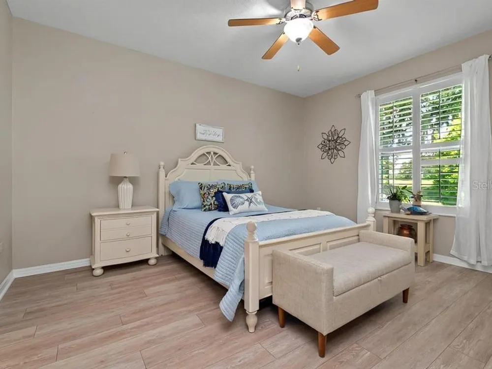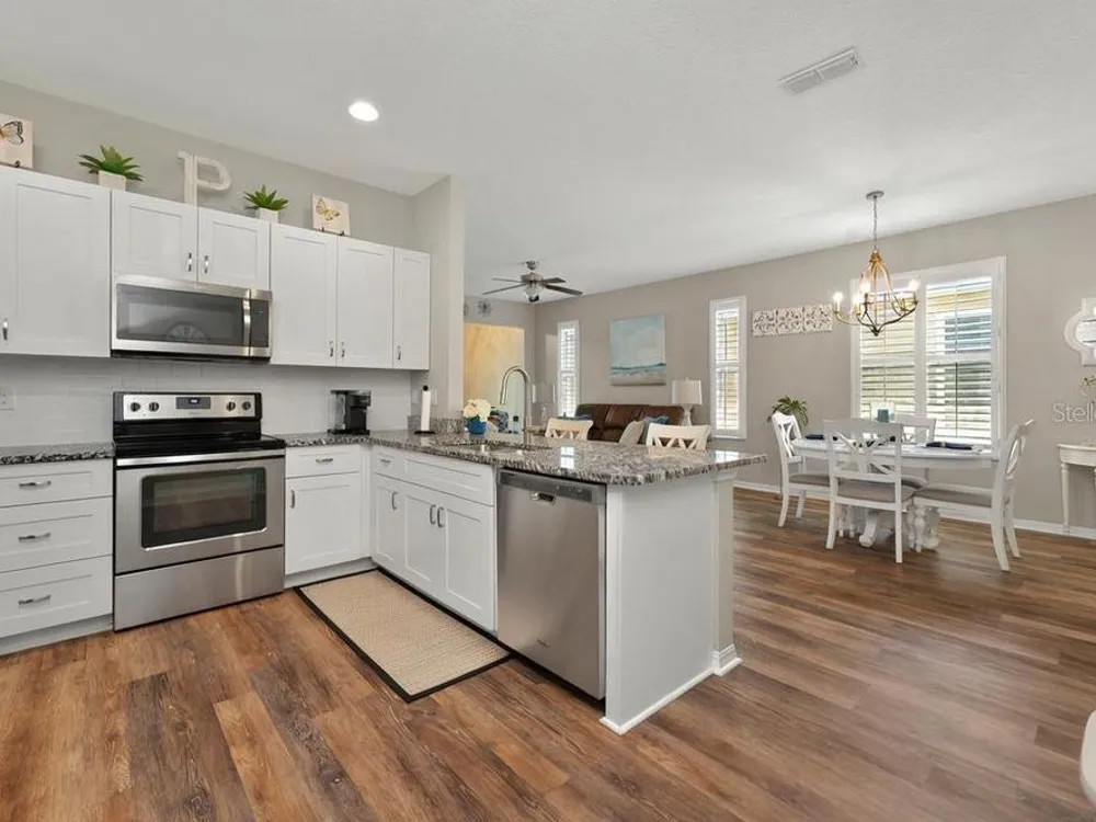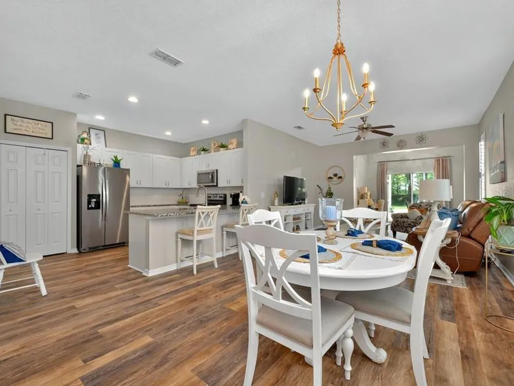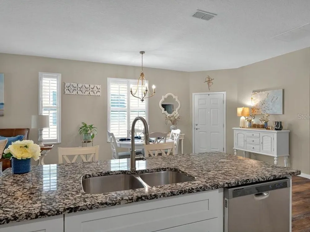 Carefree Living . . . Charming Villa, Low Maintenance, Amenities and Activities Galore . . . Highly Desirable Community of Arlington Ridge. Step inside this Charming light and bright home with 9' ceilings throughout, neutral paint color throughout, luxury vinyl plank flooring, double pane windows with Plantation Shutters, Glass Entry Storm Door, View of the Golf Course from the Screened Lanai and no neighbors behind you. Open Floor Plan Features Living and Dining Room Combination, Kitchen with 36" luxury cabinets, cabinet drawer stack, granite counters, stainless steel appliances and a generous size pantry. Spacious Master Bedroom has two closets with one of them being a walk-in closet, ensuite bathroom with double vanities, and granite counters. The second bedroom and bathroom are on the opposite end of the villa for privacy. The flex/bonus space can be used as an office, exercise area, sitting/reading nook, or hobby room and could easily accommodate a murphy bed. Generous size laundry room with laundry sink and plenty of extra storage space. Spend more time doing the things you enjoy while the exterior painting of the home, roof replacement, lawn service including mowing, edging, weed eating, blowing and lawn irrigation and spraying of lawn are included in the cost of your quarterly HOA fees. Also included in the quarterly HOA fees are 200 + cable tv channels with ability to record your favorite shows, high speed internet and router. The community has a guard at the entry 24 hours per day. This home is a short walk, YES you are within 1/2 block of all the top tier amenities the community has to offer. Enjoy a long list of amenities including an 18-hole championship Golf Course, Putting Green, Chipping Green, Driving Range, and Pro Shop. Resort Style Heated Swimming Pool with Jacuzzi and Beautiful Palms, Lap Pool, State of the Art Fitness Center with Exercise Equipment, Sauna and Showers, Lighted Tennis and Pickleball Courts, Sidewalks for Walking, Yoga, Pilates, Zumba, Water Aerobics, Water Volleyball and Various Other Exercise Classes. The community also features a theater with two free movies per week, full-service Restaurant and Pub, Billiard Room, Library, Coffee Shop, Craft Room, Game/Card Rooms and Fairfax Hall for Special Events and Performances. Crafts include ceramics, crochet/knitting, quilting, stain glass to name a few. Various clubs including Men and Women of Faith, Garden Club and Book Club. Bingo held twice per month, Card games, Dominoes, Mahjong, Euchre, Bridge, Cribbage and Others. * Please Note: The Golf Course is open to the public, memberships are available but not required to play the course or live in the community of Arlington Ridge. The Arlington Ridge 55+ Community is in the heart of Lake County where beautiful lakes are everywhere. The Harris Chain of Lakes (15,000 acres) has a nearby fishing pier and boat ramp where you can launch your boat and travel to nearby Howey in the Hills, Tavares, Mount Dora and Eustis, with dining stops along the way. The Villages are also nearby with restaurants, shops and live entertainment 365 days a year. Orlando International Airport is 1 hour away, and the West Coast Sunset is 1 hour 25 minutes away. East Coast Beaches for sunrises 1 hour 35 minutes away. And don't forget about the mouse, Walt Disney World is 50 minutes away. You are approximately 7 miles from the entrance to North or South Bound Florida Turnpike.