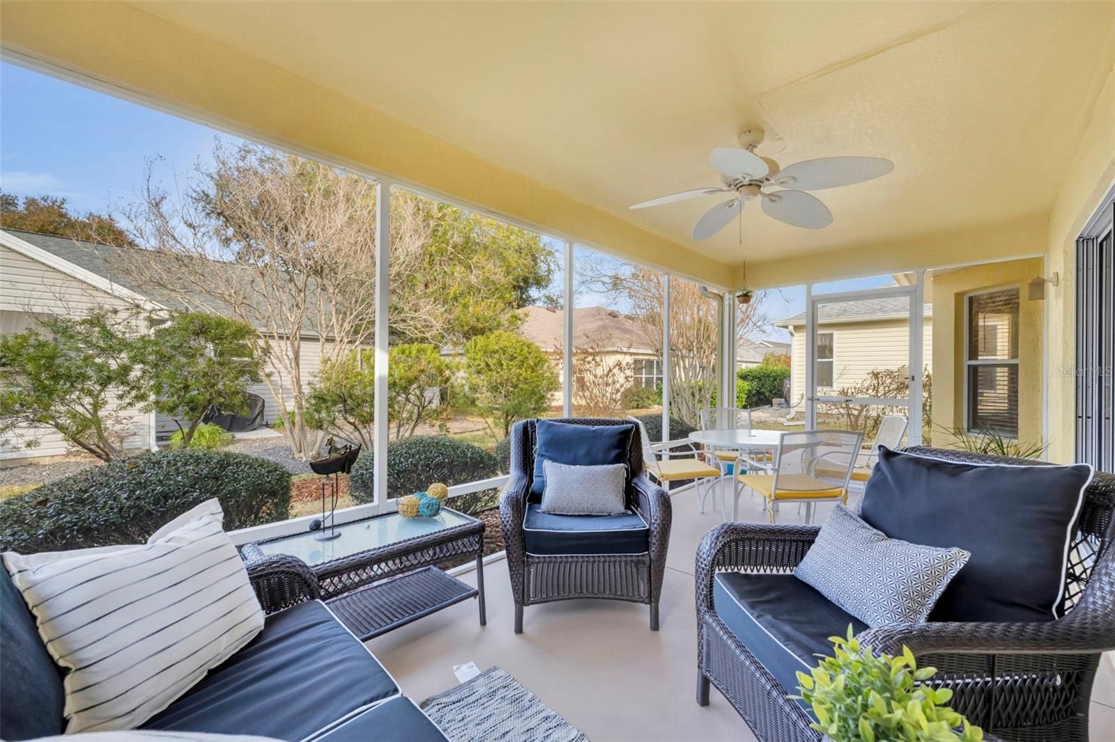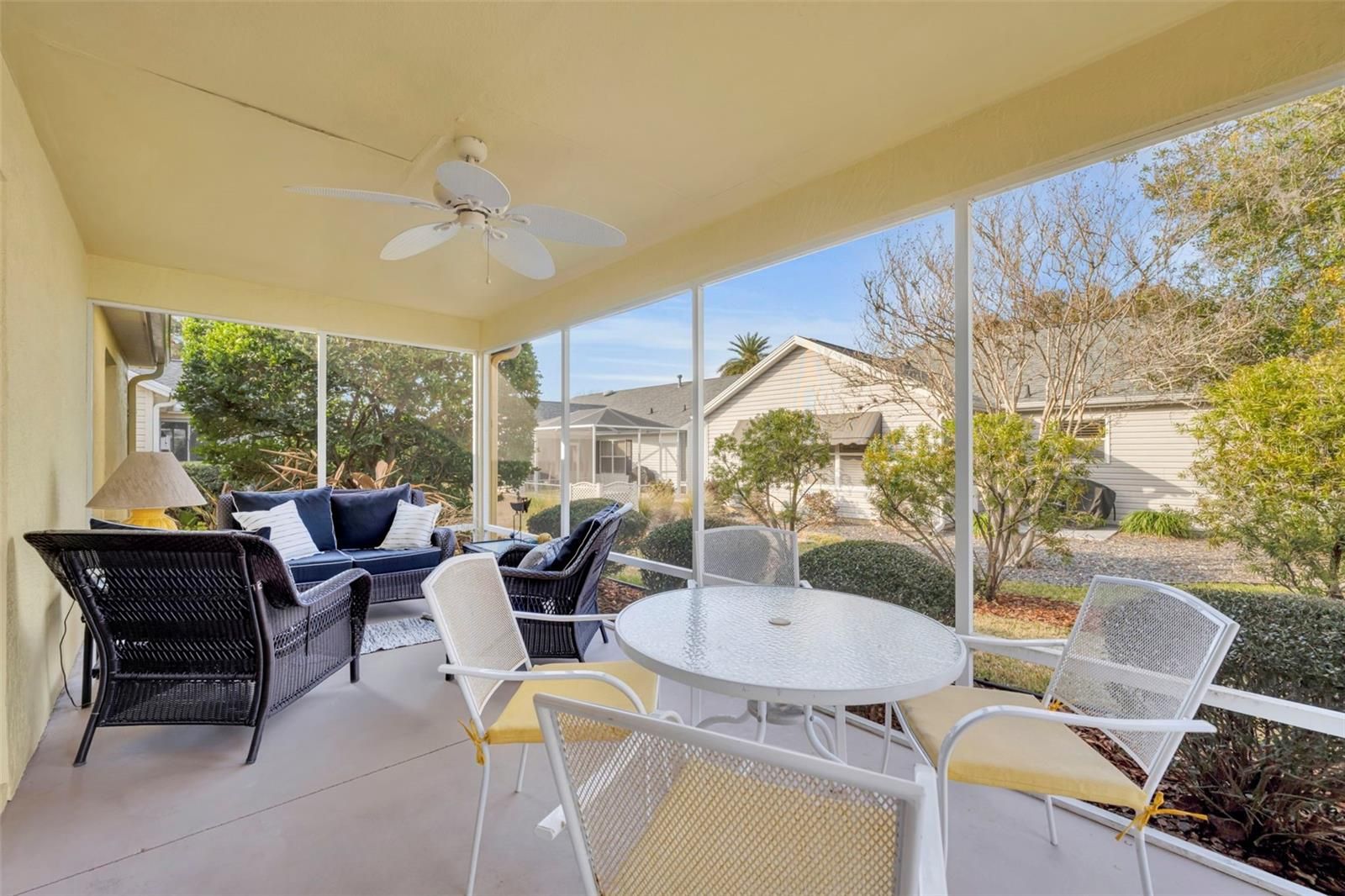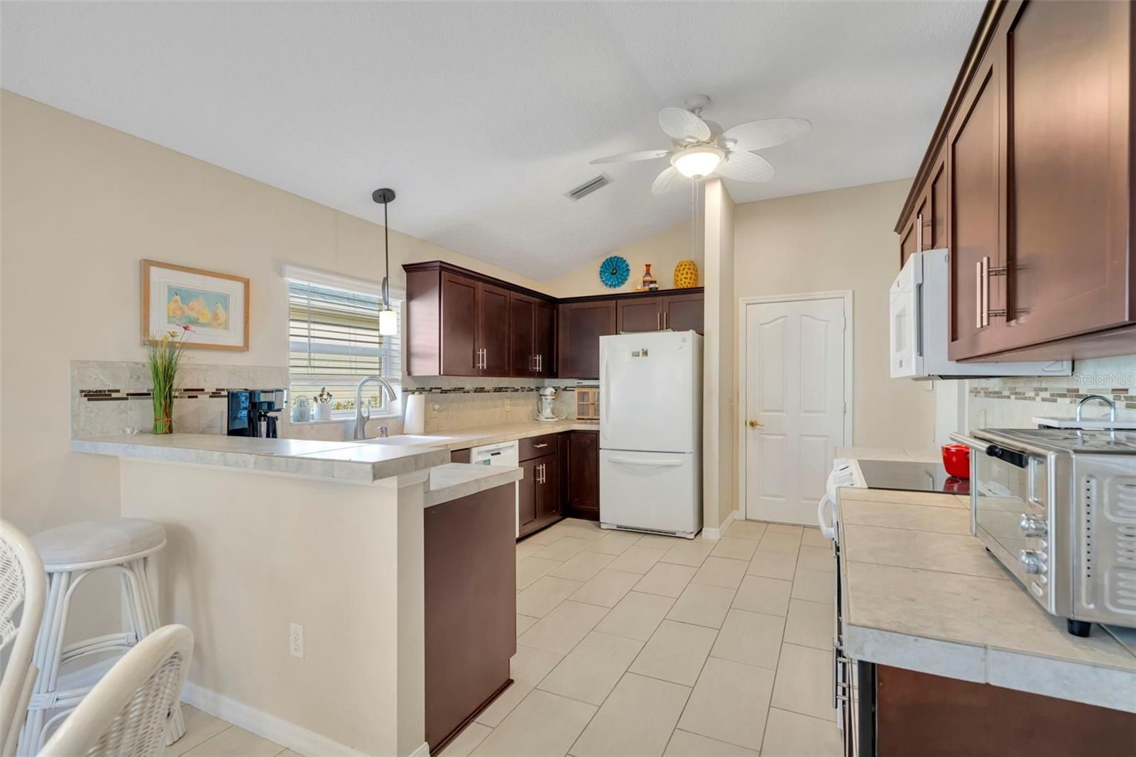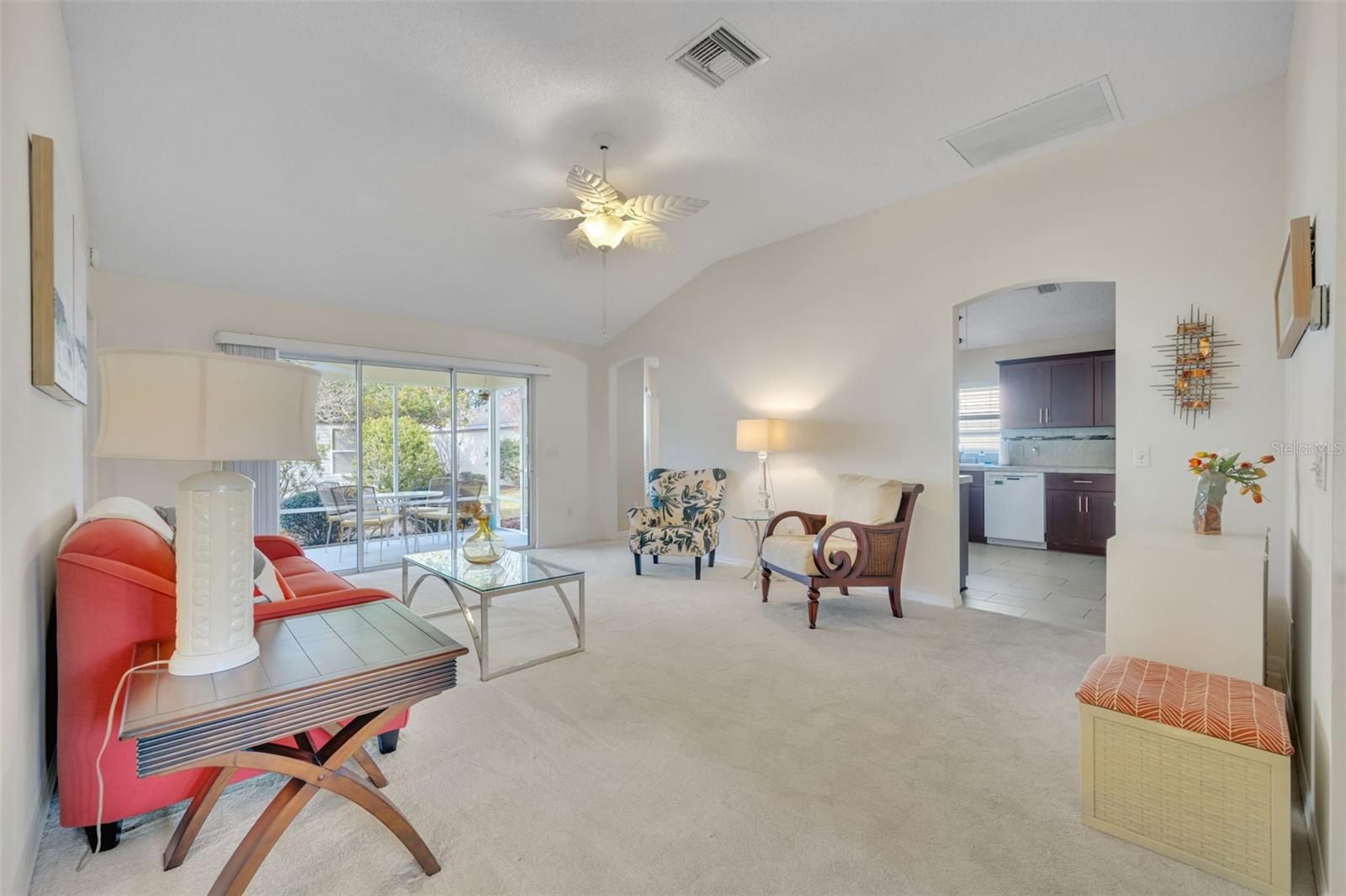 Location, Lifestyle, and Value — This Beautifully Updated Home in The Villages Has It All! BOND IS PAID!!! Welcome to this charming and well-appointed 2-bedroom, 2-bath home with a versatile BONUS ROOM that can easily serve as a THIRD BEDROOM, home office, hobby space, or den, offering flexibility to fit your lifestyle. The heart of the home is the beautifully upgraded kitchen, featuring gorgeous countertops, upgraded cabinetry with convenient pull-outs, a stunning stone backsplash, oversized kitchen sink, breakfast nook and quality appliances including a Bosch dishwasher, GE range and microwave, and Kenmore refrigerator — perfect for both everyday living and entertaining. One of the standout features is the unique dining room, a rare and inviting space that adds character and functionality, making gatherings with family and friends truly special. Throughout the home you’ll find brand-new carpet, creating a fresh and comfortable feel. The spacious primary suite offers dual vanities and tile flooring, providing both style and convenience. Step outside and enjoy Florida living at its best with a 9x20 screened lanai plus an additional patio area ideal for grilling or relaxing outdoors. The large garage provides ample storage, and a golf cart with brand-new batteries is included, making it easy to start enjoying The Villages lifestyle immediately. Additional highlights include: 2019 ROOF Samsung washer & dryer 1,534 sq. ft. of comfortable living space Furniture and furnishings negotiable Perfectly positioned for convenience, this home is: Approximately 10 minutes to Spanish Springs Town Square Only 14 minutes to Lake Sumter Landing Just minutes from the Savannah Center and the El Santiago swimming pool for entertainment, events, tennis and pickleball courts!! If you love to golf the El Diablo Executive Golf Course if minutes away!!! Located on a quiet street in a peaceful village, you’ll appreciate the serene setting — and on clear evenings, you can even watch rocket launches from Cape Canaveral right from your front yard, a truly special Florida experience. Whether you’re looking for a full-time residence or seasonal retreat, this home combines comfort, upgrades, and an unbeatable location. Schedule your private showing today and start living The Villages lifestyle!
