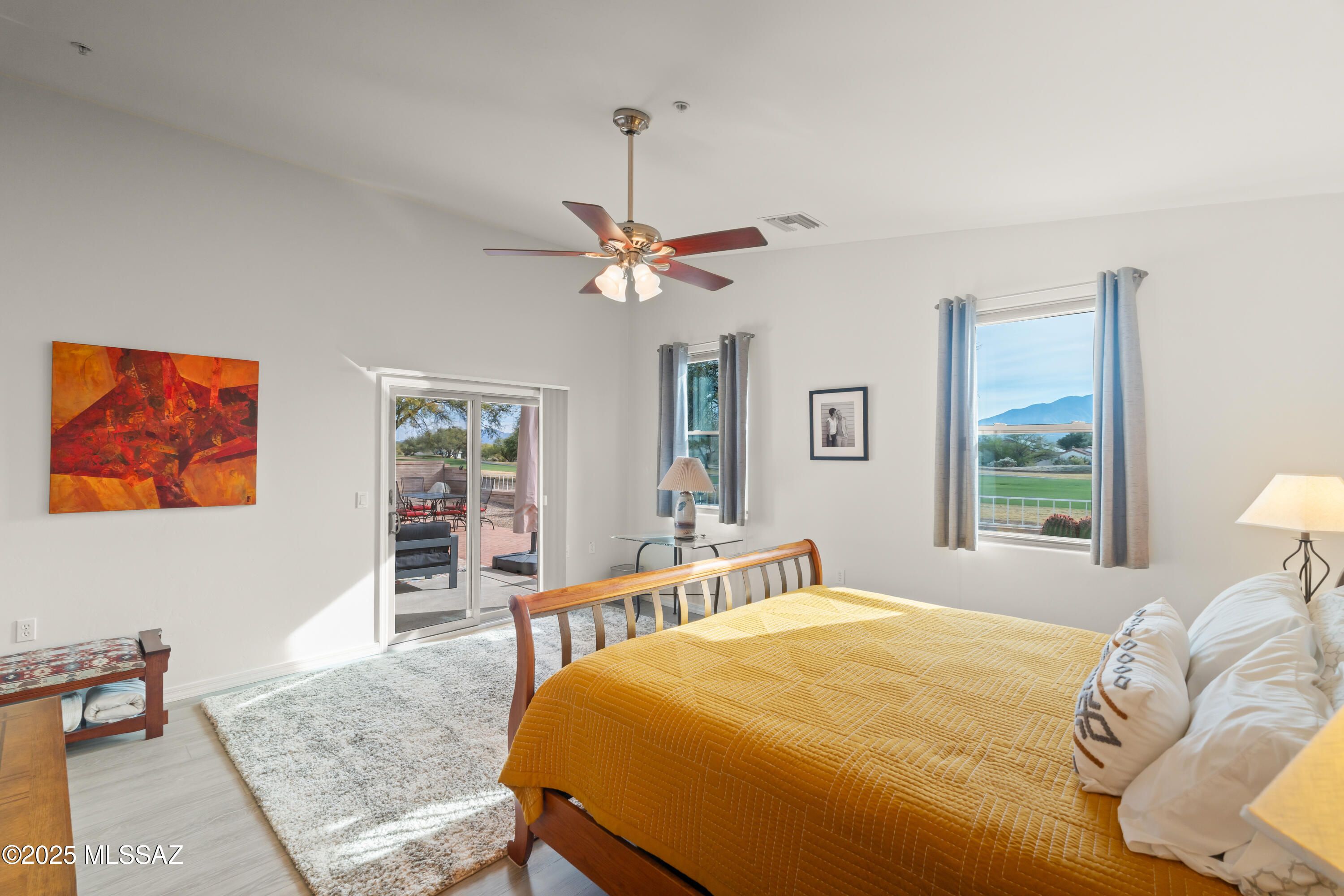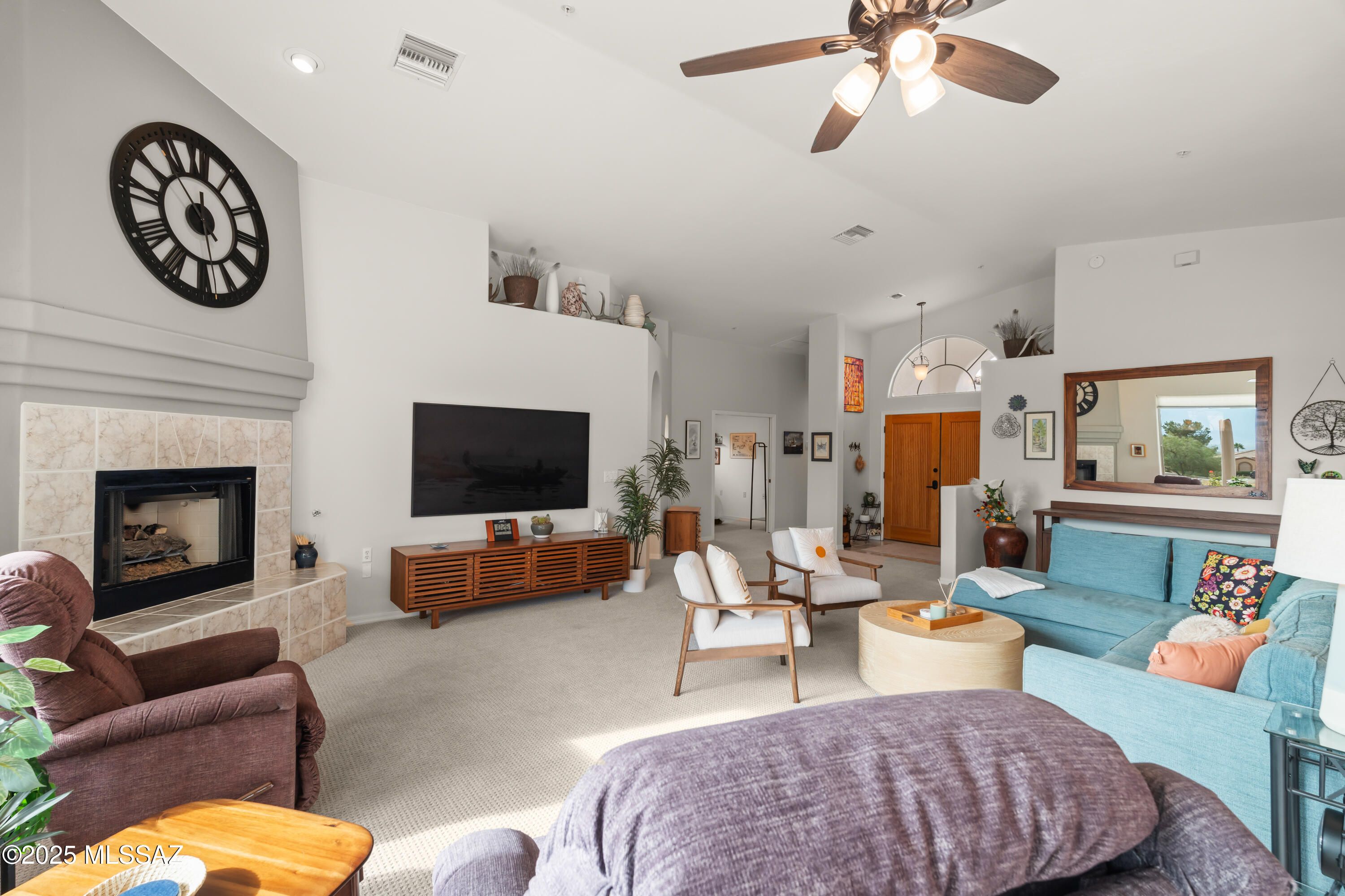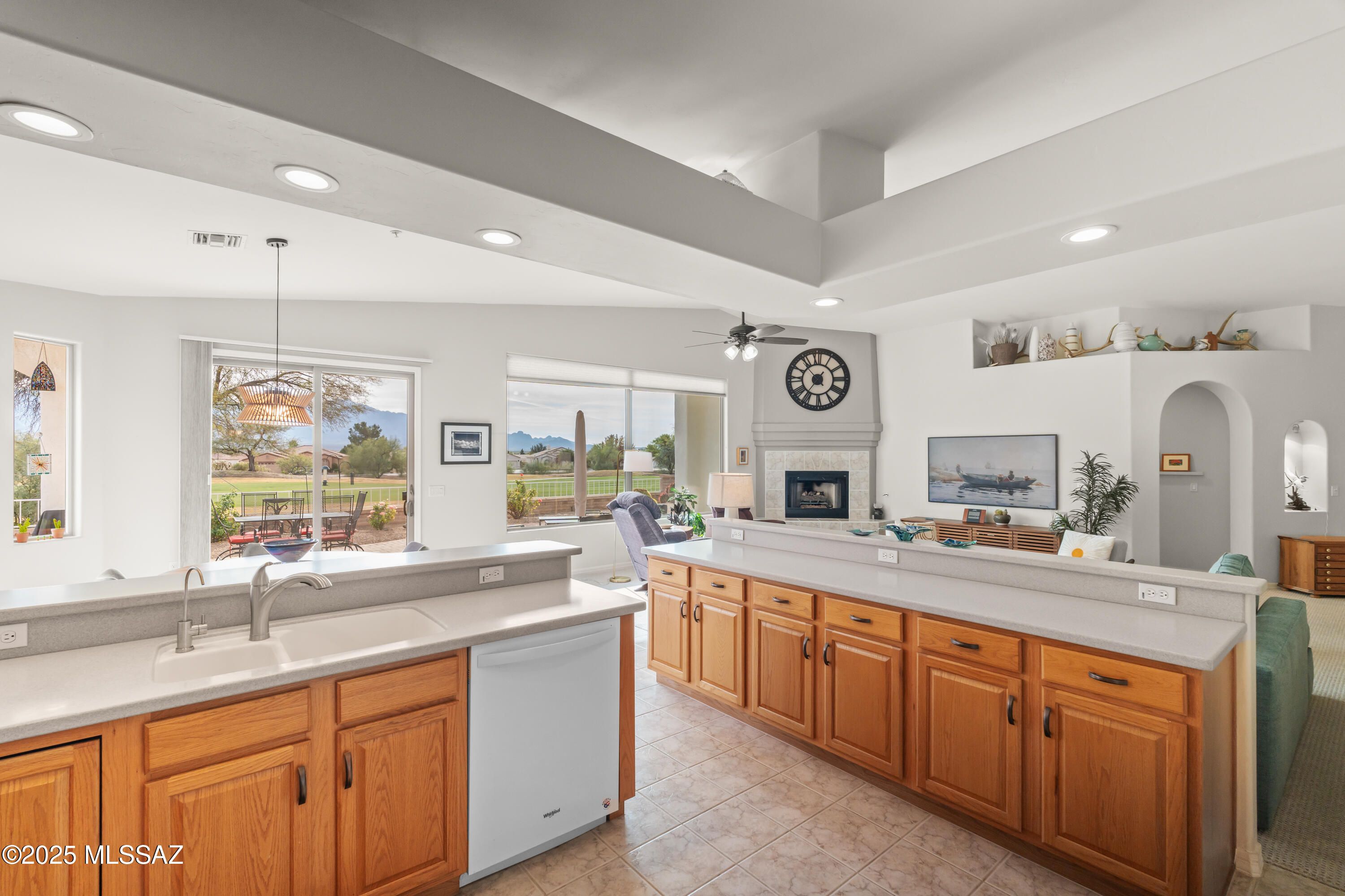 Wake up to STUNNING mountain views in this beautiful single story home perfectly located in the 55 plus community of the Fairways. The moment you step inside your eye is immediately drawn to the gorgeous mountain views framed perfectly through a large picture window. Set on Torres Blanca Golf Course Hole 4, this home offers a rare combination of golf course and mountain scenery that truly defines Green Valley Living! The open floorplan creates an inviting space for both every day comfort and entertaining, anchored by a cozy fireplace and filled with natural light. With two bedrooms plus a DEN with pocket doors, the layout offers flexibility for a third bedroom, home office, or hobby space.