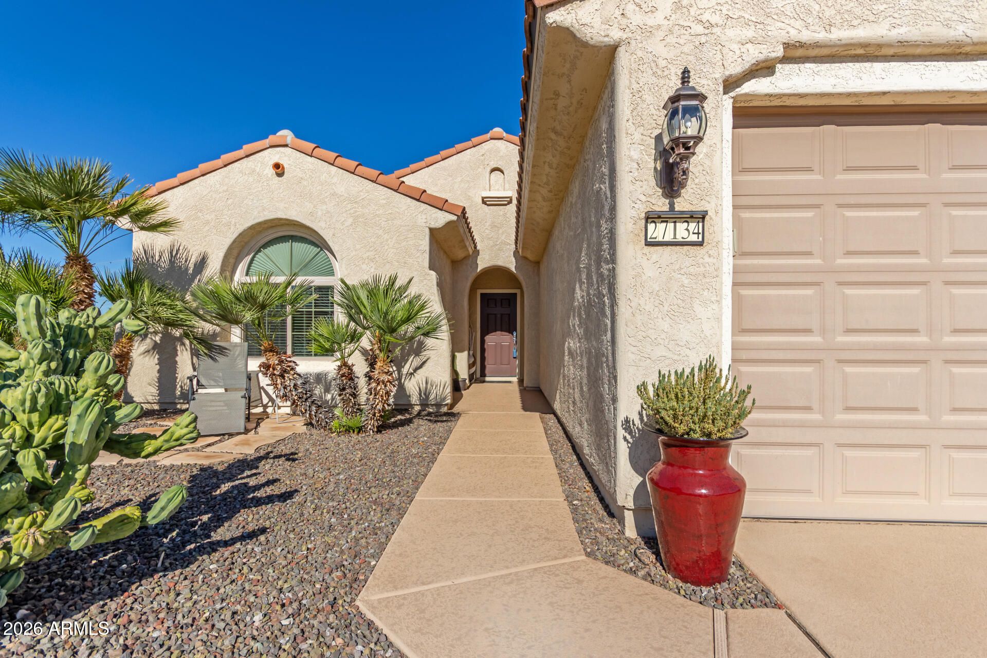 The search is finally over! This lovely 2-bedroom plus den home welcomes you with a picturesque desert landscape for excellent curb appeal and a 2-car plus golf-cart garage. Discover a captivating great room with high ceilings, recessed lighting, blinds, and durable tile flooring. The spotless kitchen features granite counters, abundant wood cabinetry with crown, a tile backsplash, stainless steel appliances, a handy pantry, and an island. You'll also find a cozy den ideal for an office or a quiet lounge. The extended primary bedroom boasts plush carpeting, a sitting nook, a private bathroom with dual sinks, and a huge walk-in closet. Spend peaceful afternoons in the oversized private backyard, complete with a covered patio and breathtaking mountain views. This home is spotless inside/out