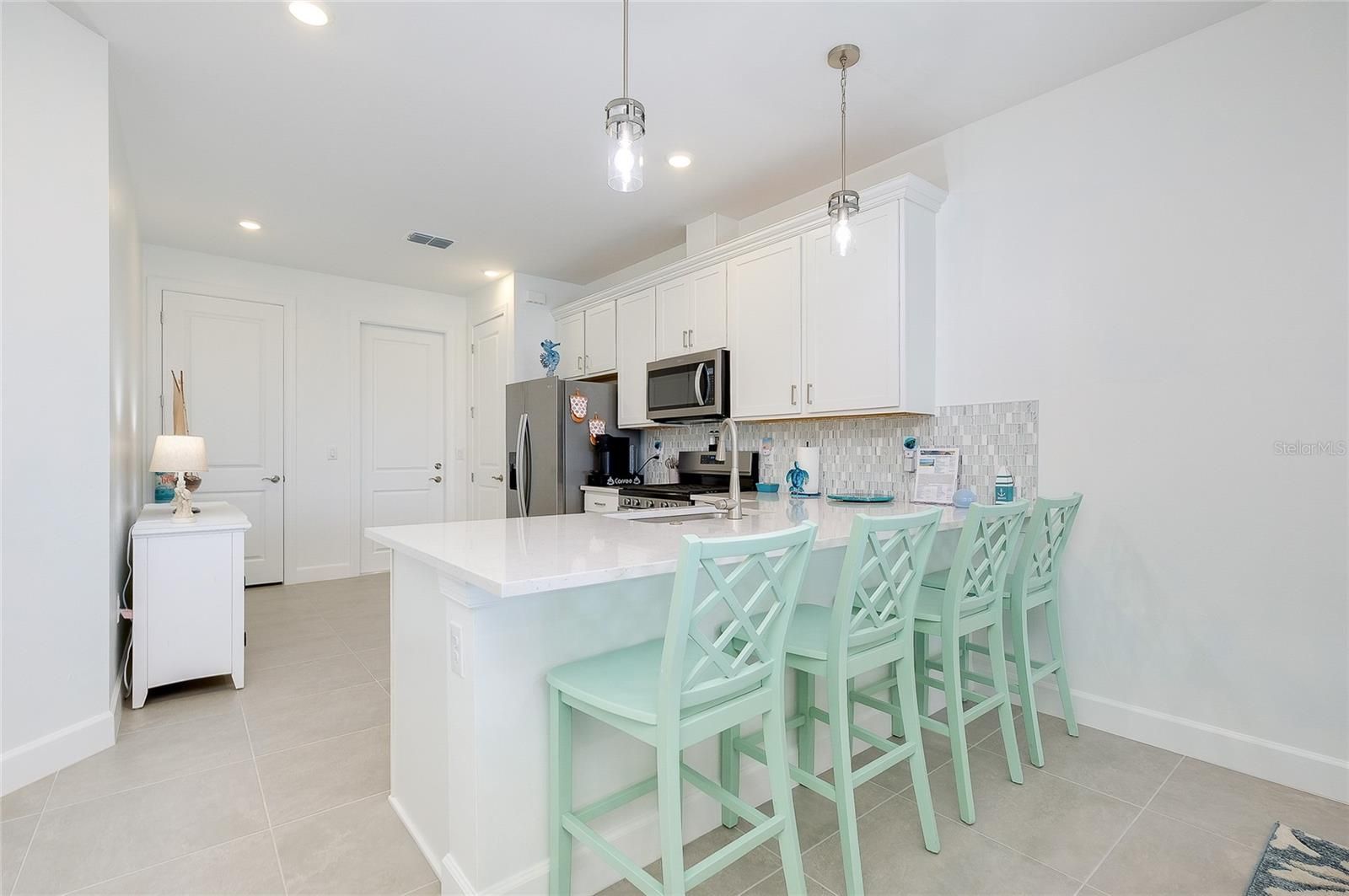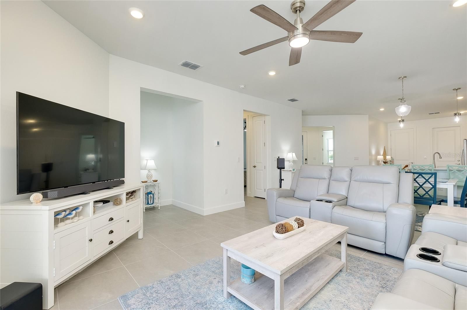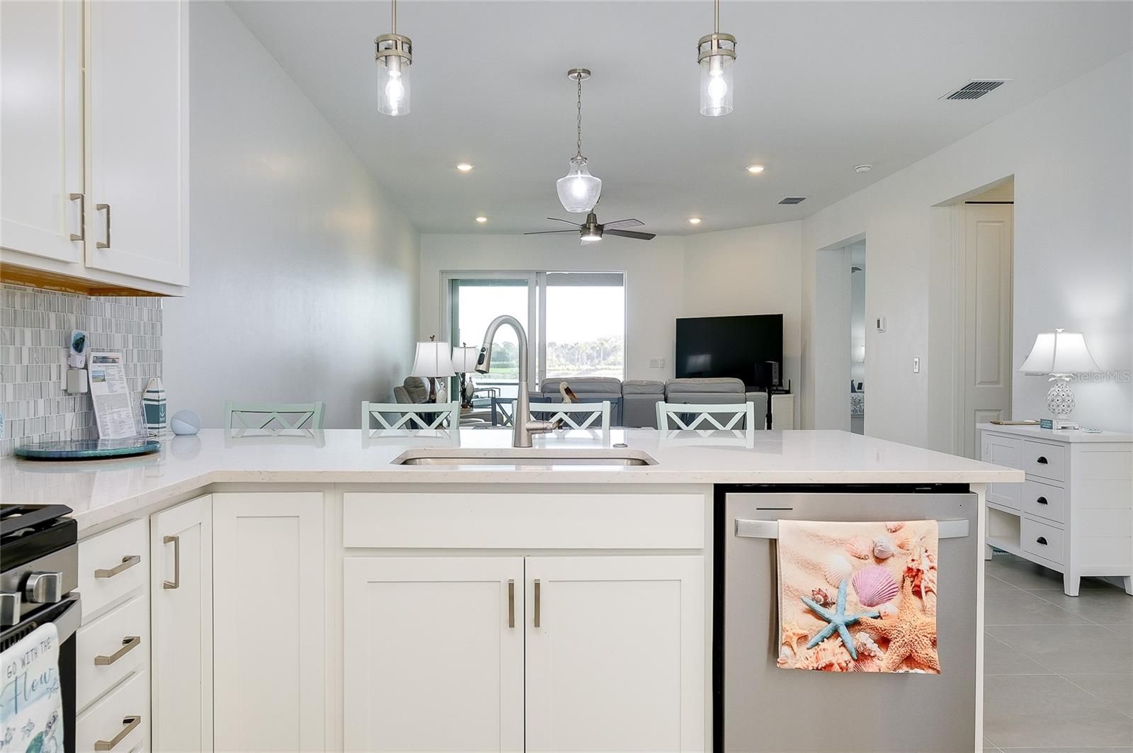 What an amazing view and opportunity to own a 2025 WATERFRONT villa in BEACHWALK by Manasota Key just 2.5 miles from the beach! This home was just built in JUNE 2025 and the owner has done SEVERAL UPGRADES such as CEILING FANS, PENDANT LIGHTS, blinds/window treatment, LAUNDRY CABINETS, EPOXY in the garage, and more! SAVE $4,000 in CAPITAL CONTRIBUTION SAVINGS compared to buying new from the builder and move in without the wait! BUILDER WARRANTIES are TRANSFERABLE to the new owner - this home is BETTER THAN NEW! Welcome to 27136 Capri Shores, a beautifully designed SEAGROVE model perfectly positioned to capture one of the best LONG WATER VIEWS in all of Beachwalk! This home offers the ideal blend of luxury, comfort, value, and features 2 BEDROOMS, 2 BATHS, and a versatile DEN or office. TILE THROUGHOUT for ease of cleaning! Step inside and you’ll find an OPEN-CONCEPT FLOOR PLAN with elegant finishes throughout. The GOURMET KITCHEN features modern cabinetry, GAS stove, stainless steel appliances, QUARTZ countertops, and a spacious ISLAND that flows seamlessly into the living and dining areas — perfect for entertaining or relaxing while enjoying your serene lake views. The owner’s suite offers a peaceful retreat with a spa-inspired bath and a very generous walk-in closet. Outside, your COVERED EXTENDED LANAI is the ideal spot for morning coffee, bird watching, or sunset dinners overlooking the sparkling water. Living in BEACHWALK by Manasota Key means every day feels like a vacation and NO CDD here or CITY TAXES! Residents enjoy MAINTENANCE FREE living and RESORT-STYLE AMENITIES, including: A stunning 11,000 sq. ft. clubhouse with ON-SITE DINING and BAR, RESORT-STYLE POOL with beach entry and lap lanes, PICKLEBALL and tennis courts, Bocce courts, FITNESS center and movement studio, DOG PARK and walking trails. Only minutes from Manasota Key beach, and local shopping and dining! Coming soon...the opening of the WATERLINE RESTAURANT and the addition of a new 13,000 sq. ft. 3RD AMENITIES CENTER with GOLF SIMULATOR, auditorium and huge GAME ROOM. Don’t miss your chance to own this move-in ready villa with an incredible long water views — and instant savings!
