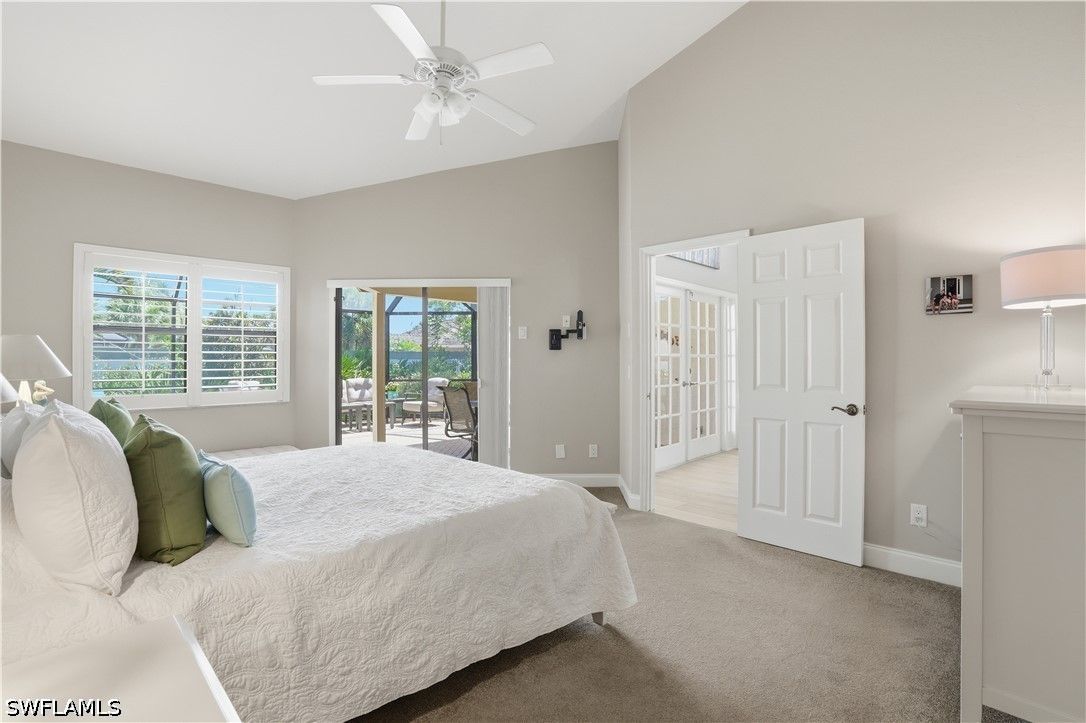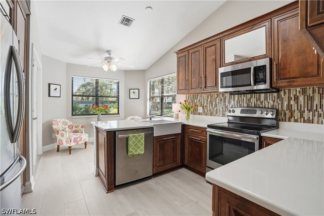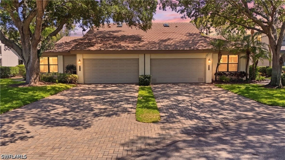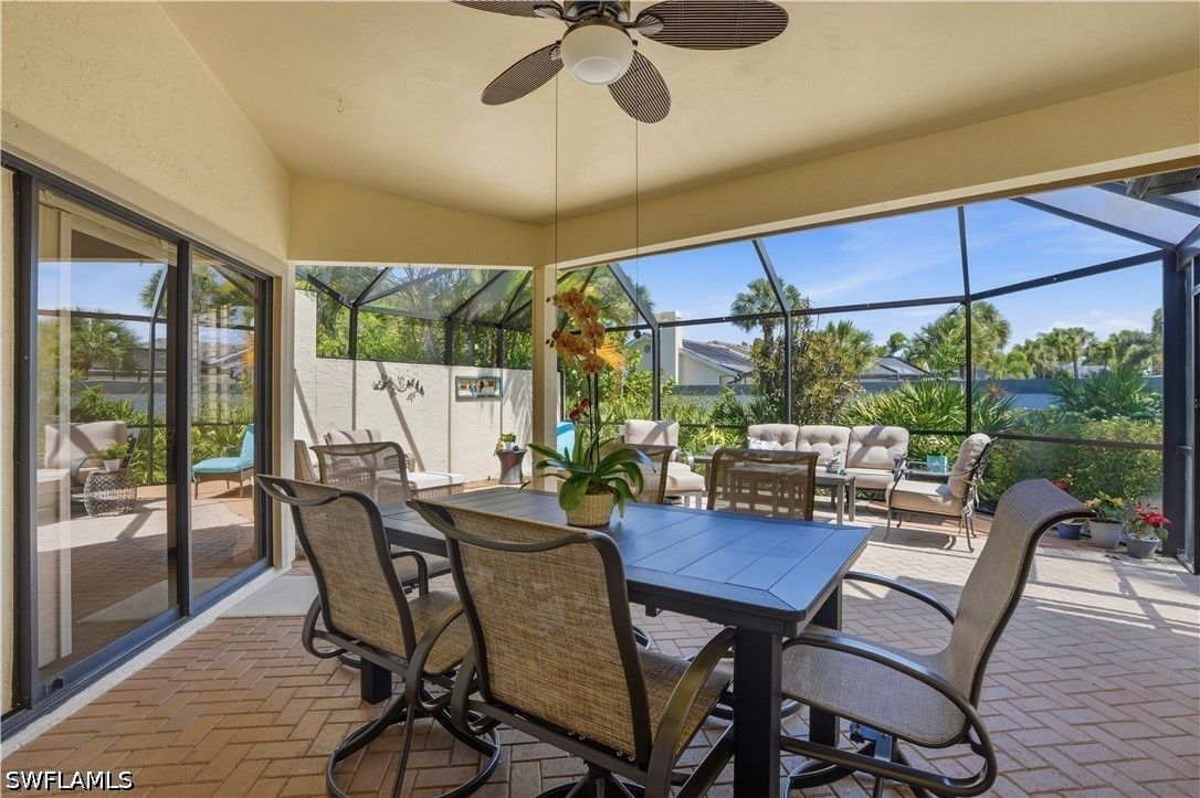 This gorgeous 2-bedroom plus den, 2-bath residence is nestled among mature oak trees in the charming Burning Tree neighborhood of Bonita Bay, offering exceptional curb appeal and a serene, private setting. Thoughtfully designed with a modern open-concept floor plan, this home is ideal for both everyday living and for entertaining. Vaulted ceilings in the living and dining areas, kitchen, and primary suite create a spacious, light-filled atmosphere, while stained glass accent windows add a touch of character and charm. The inviting great room flows seamlessly to the outdoors through French doors that open to a private lanai retreat, creating the perfect indoor-outdoor lifestyle. The kitchen is a standout, featuring floor-to-ceiling cabinetry, quartz countertops, and stainless steel appliances, along with direct lanai access for effortless entertaining. The primary suite is a peaceful retreat with vaulted ceilings, plantation shutters, two custom walk-in closets, and private access to the lanai. The en-suite bath offers dual sinks, a walk-in shower, and a skylight that fills the space with natural light. A versatile den just off the great room provides the perfect space for a home office or guest accommodations, complete with French doors and plantation shutters, while the guest bedroom is ideally positioned for privacy. Additional features include luxury vinyl flooring throughout (with the exception of the primary bedroom), a well-appointed laundry room with utility sink and storage cabinetry, and an attached two-car garage with ample space for storage, tools, and recreational gear. Numerous updates enhance peace of mind, including a new water heater (2025), washer and dryer (2023), and HVAC condenser pump (2025). Step outside to the expansive lanai, offering both sun-filled and covered areas, perfect for relaxing, entertaining, or al fresco dining while enjoying beautifully landscaped, private views. Located within walking distance to the Promenade shops and restaurants, this home also includes access to the unparalleled amenities of Bonita Bay. Residents of Bonita Bay enjoy an unmatched lifestyle with access to a private beach club, kayaking and canoeing, pickleball and tennis, multiple parks, and more than 12 miles of walking and biking paths. Golf enthusiasts will appreciate five championship courses, along with multiple dining venues, a state-of-the-art fitness center, and a full-service marina (club membership required; additional fees apply). Ideally located just minutes from world-class dining, shopping, beaches, and nature preserves, with easy access to Downtown Bonita Springs, Downtown Naples, and RSW International Airport, this residence offers the perfect balance of luxury, convenience, and coastal living.