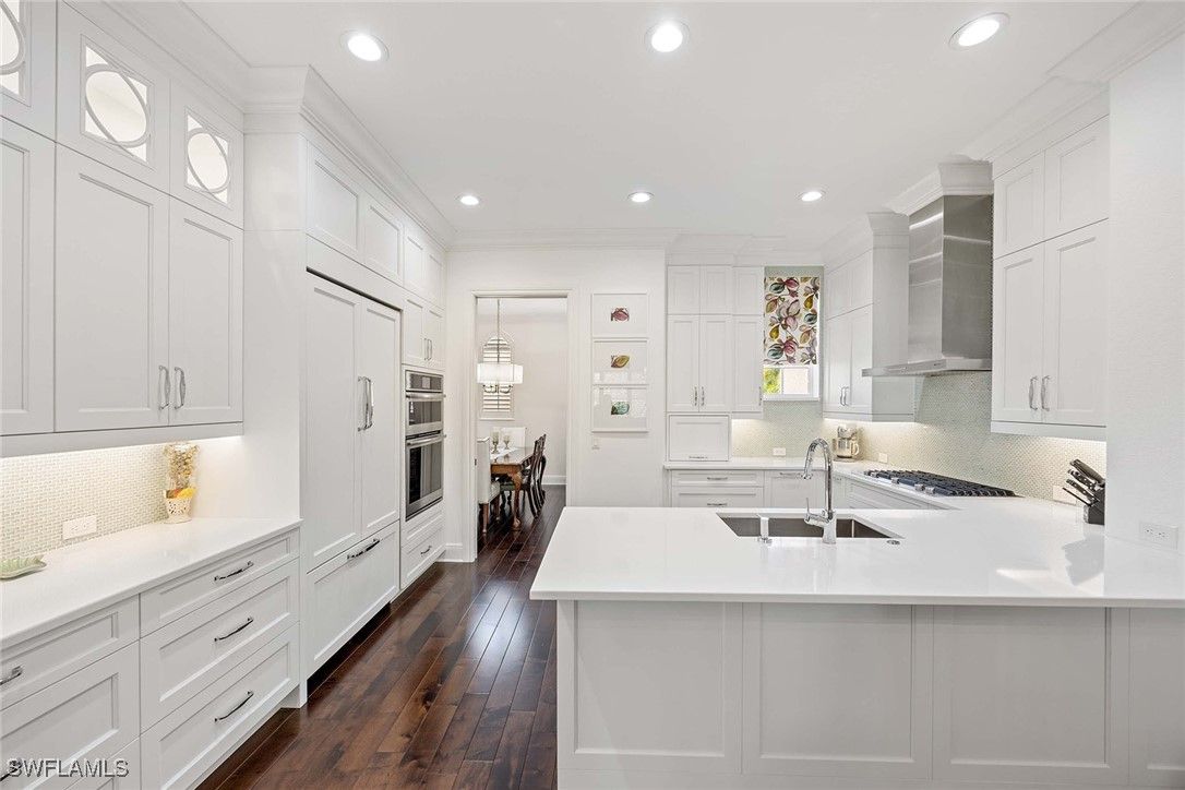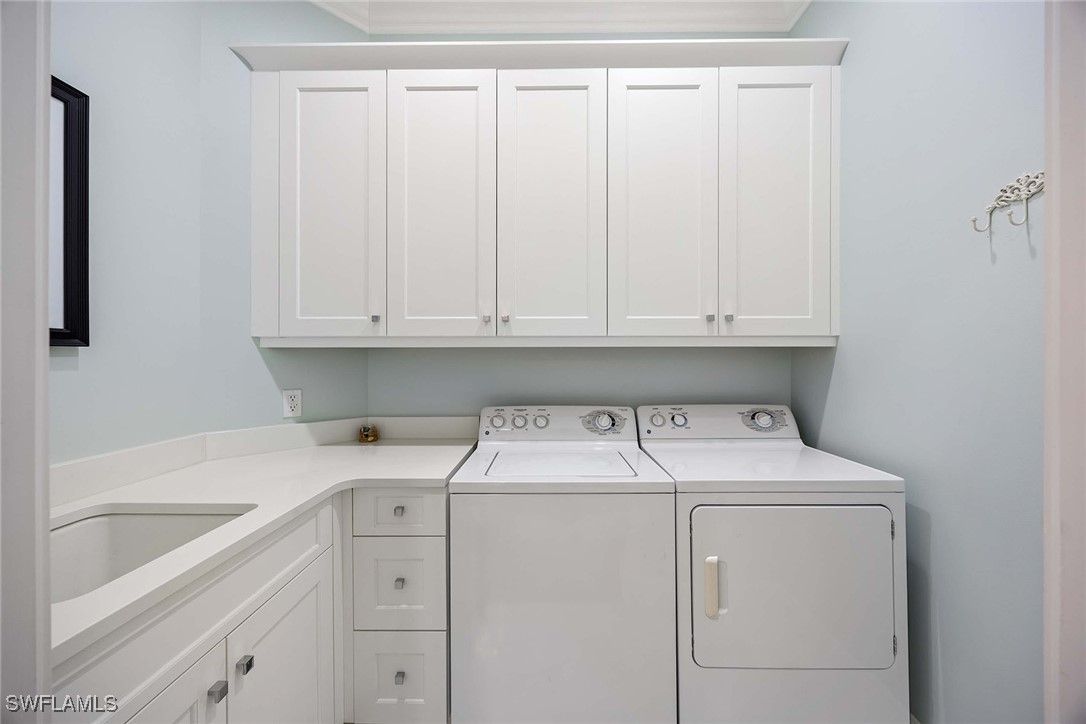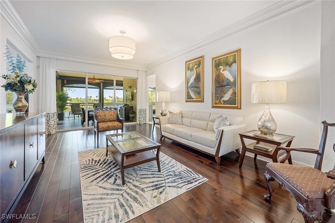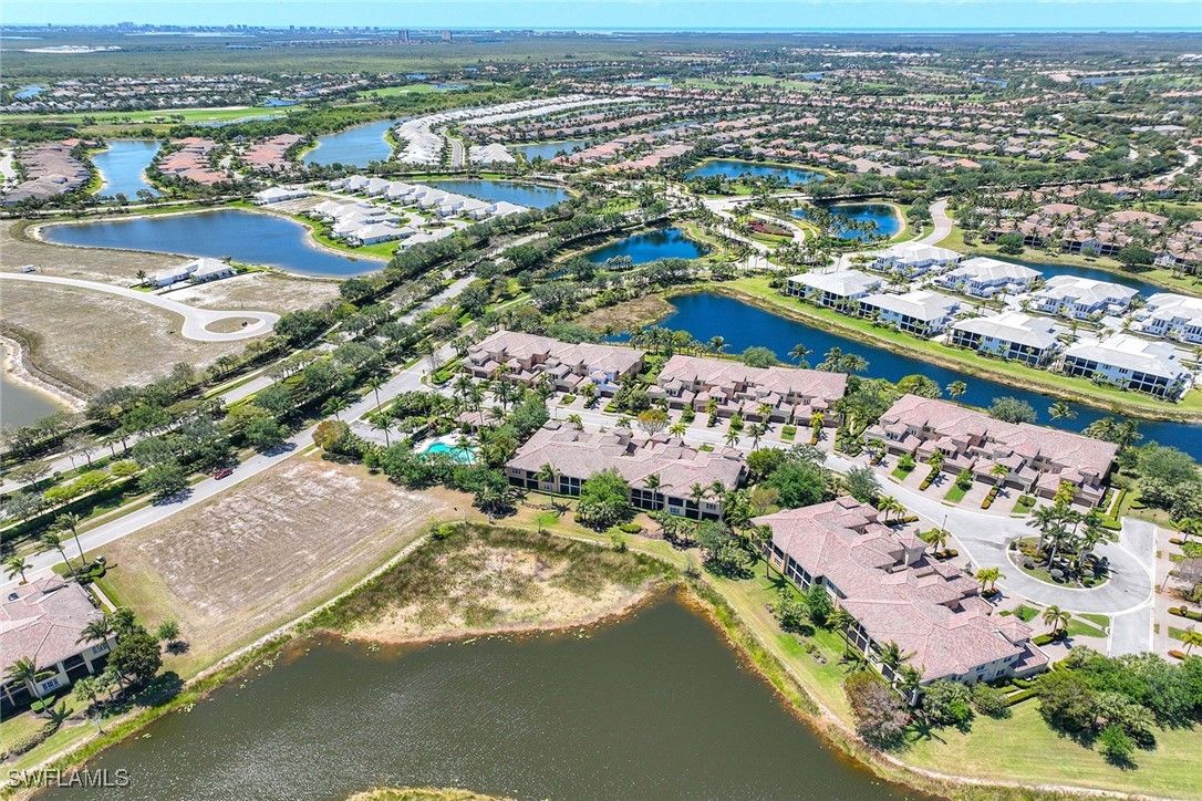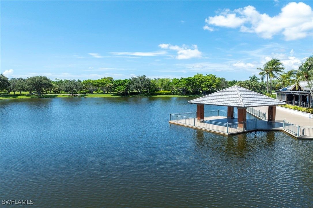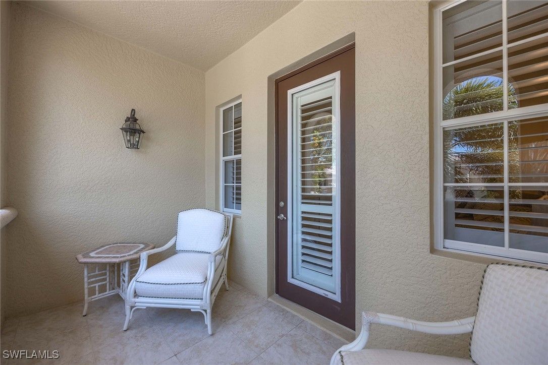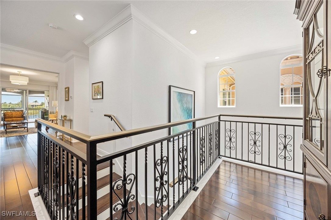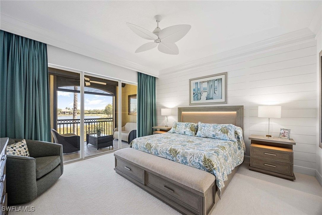 Relish the embodiment of the Naples resort lifestyle! In a quiet neighborhood, this second-floor, lakefront, coach home has been lavishly remodeled to surpass the surrounding basic, ongoing new construction. Upgrades include beautiful wood flooring throughout most of the home, wood steps, wrought-iron staircase, quartz countertops, 42-inch white custom cabinets with soft-close drawers, JennAir stainless appliances, designer crown molding throughout, plantation shutters and decorative wood walls. Hurricane-impact windows and doors throughout, and electric storm screens on lanai provide an added level of safety. Newly installed elevator, HVAC and more. The formal living room adds a touch of elegance to this magnificent home. The primary suite opens into the lanai with lake views and features two spacious walk-in closets. The primary bath has dual sinks on opposite walls with an oversized shower and soaking tub. The large second bedroom features en-suite bath with private Juliette balcony. Third bedroom has decorative wood-trimmed walls. The half bath can be returned to full bath if desired. Tastefully decorated with upscale furnishings and designer treatments provide immediate enjoyment for discerning individuals. Fiddler’s Creek is a guard-gated, patrolled, resort community featuring a nature park with boardwalk and gazebo, 54,000-square-foot clubhouse, six Har-Tru tennis courts, bocce ball, four pickleball courts, state-of-the-art fitness facility and full-service spa, resort-style multi-pool swimming complex with cascading waterfalls and whirlpool, a variety of clubs, classes and seminars, year-round social activities, events and themed dinner parties. Culinary choices include Caxambas for fine dining, casual alfresco at The Gator Grille and beachfront at Sale e Pepe.