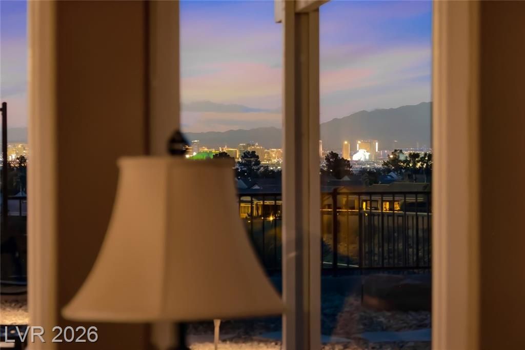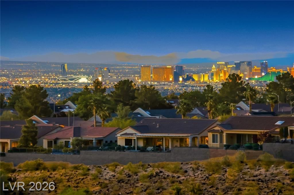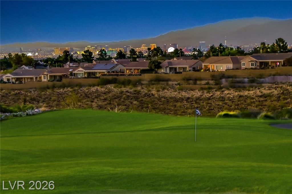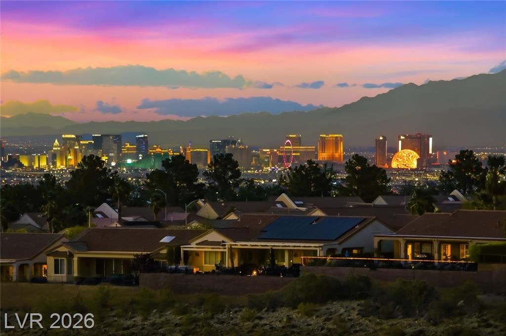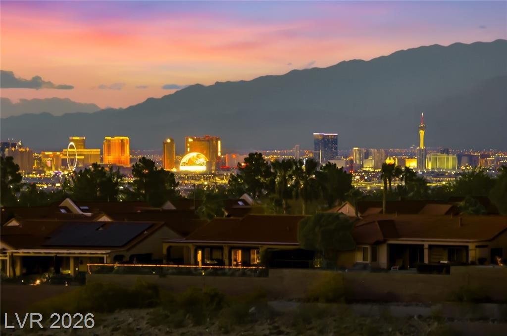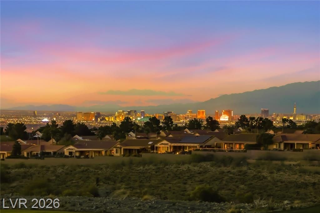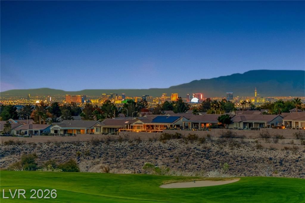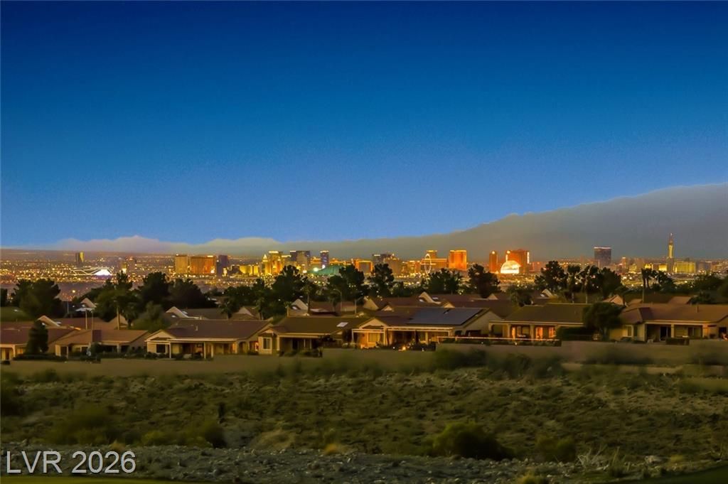Experience stunning Strip, golf & mountain views. Ideally positioned overlooking the 8th hole of the Lexington golf course, offering a unique setting with both golf course and city views. Views can be enjoyed from inside the home, enhanced by new oversized picture window & slider maximizing natural light. Open floorplan features oversized tile flooring, fireplace, custom built-ins & plantation shutters. Kitchen includes white shaker cabinets, waterfall countertop, stainless appliances & custom lighting. High-efficiency Trane A/C units add comfort and efficiency. Primary suite offers bay window, patio access & updated bath with quartz countertops. Secondary bedrooms and separate office provide flexible space for guests or 4th bedroom. Backyard features extended covered patio, stamped concrete, putting green & captivating Strip views, ideal for enjoying the morning sunrise & evening views. Located in premier 55+ community w/pools, fitness, golf, pickleball, tennis & active lifestyle.