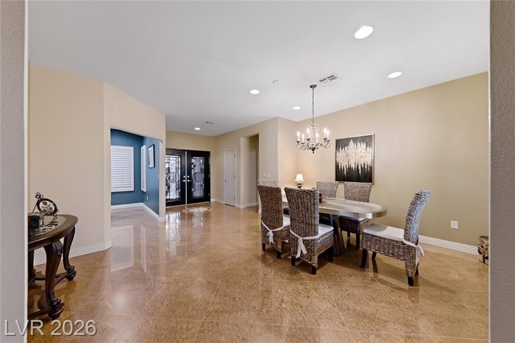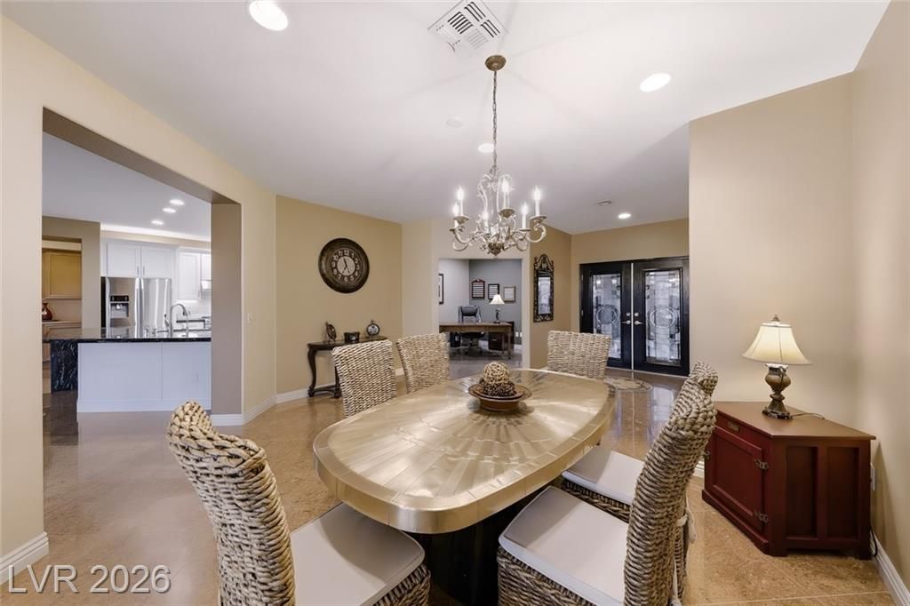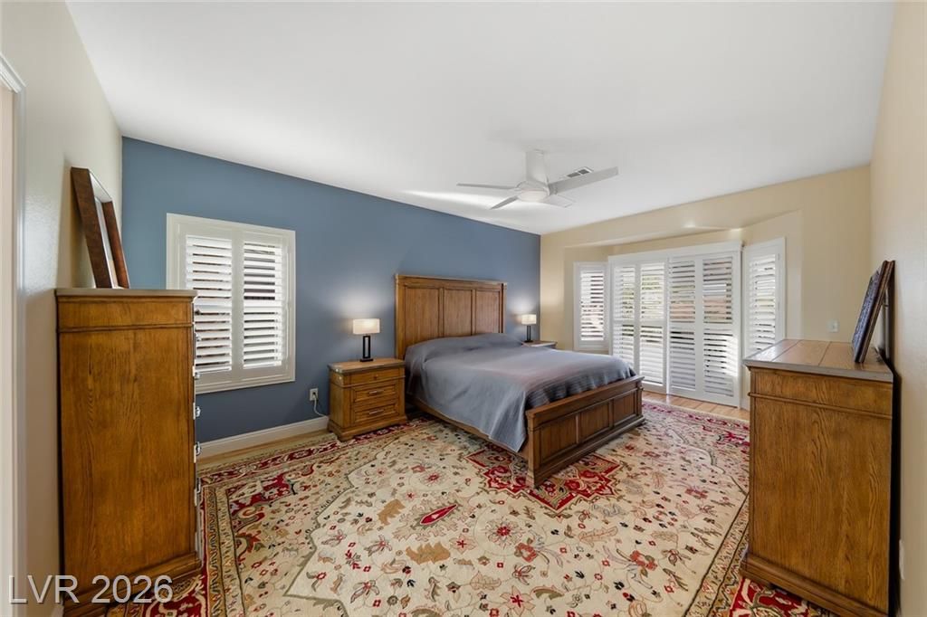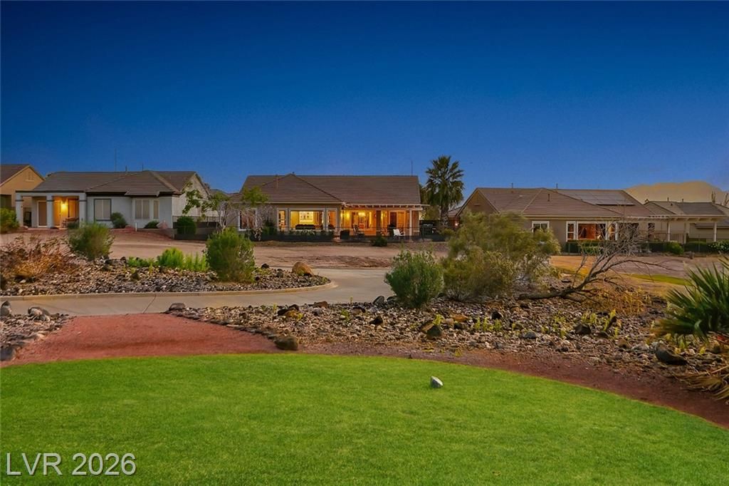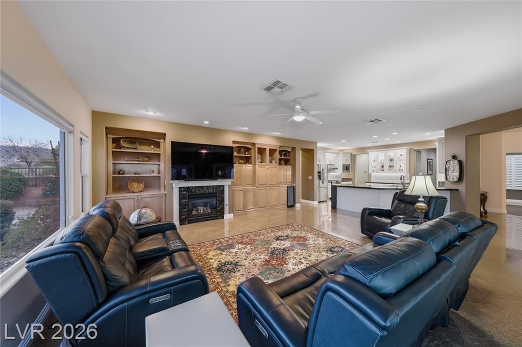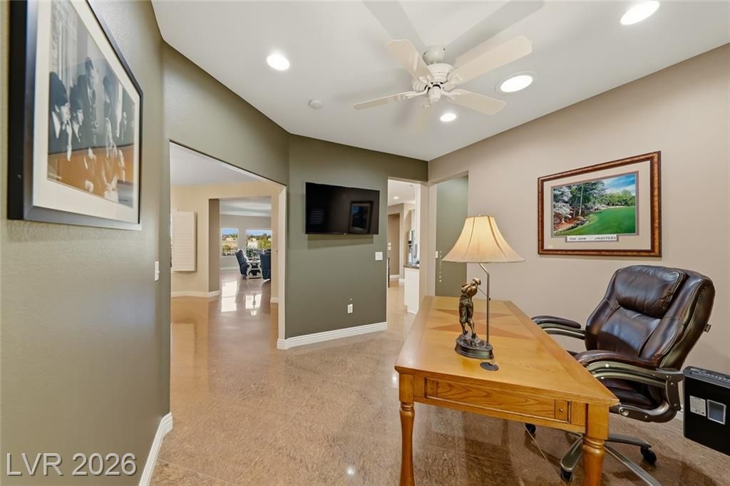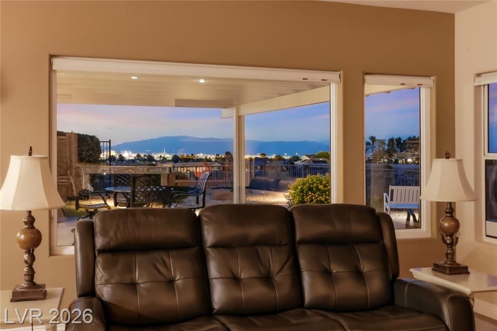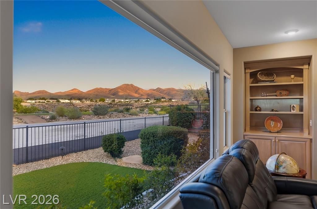 Experience stunning Strip, golf & mountain views. Ideally positioned overlooking the 8th hole of the Lexington golf course, offering a unique setting with both golf course and city views. Views can be enjoyed from inside the home, enhanced by new oversized picture window & slider maximizing natural light. Open floorplan features oversized tile flooring, fireplace, custom built-ins & plantation shutters. Kitchen includes white shaker cabinets, waterfall countertop, stainless appliances & custom lighting. High-efficiency Trane A/C units add comfort and efficiency. Primary suite offers bay window, patio access & updated bath with quartz countertops. Secondary bedrooms and separate office provide flexible space for guests or 4th bedroom. Backyard features extended covered patio, stamped concrete, putting green & captivating Strip views, ideal for enjoying the morning sunrise & evening views. Located in premier 55+ community w/pools, fitness, golf, pickleball, tennis & active lifestyle.