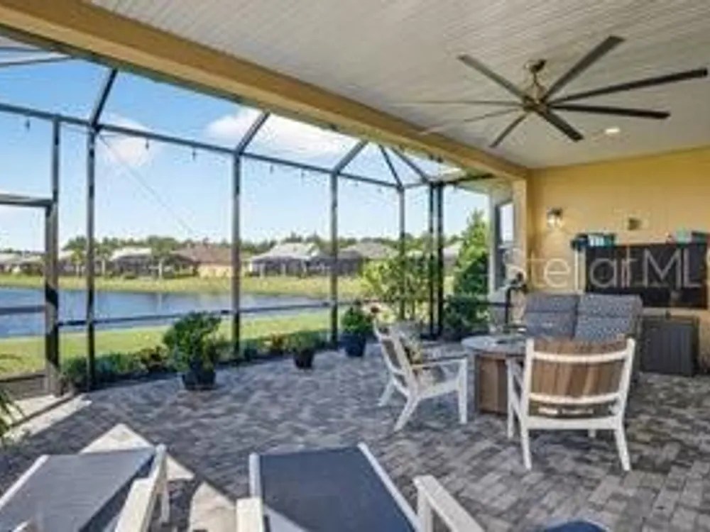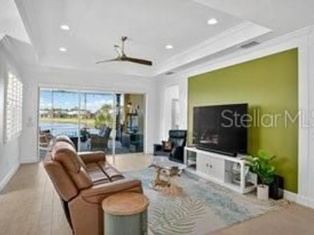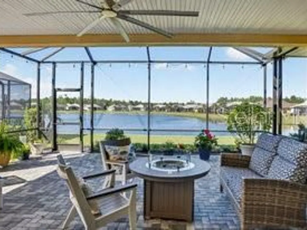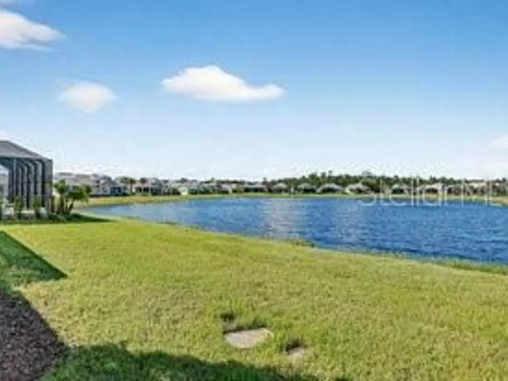Welcome to your coastal-inspired retreat in Latitude Margaritaville! This elegant Breeze model blends modern comfort with coastal charm, offering 2 bedrooms, 2.5 bathrooms, a 2-car garage, and a versatile flex room that easily converts into a third bedroom. Designed for effortless living and entertaining, this home captures beautiful water views from the moment you arrive. A widened walkway and glass front door lead you into a bright, open living space where natural light pours through expansive sliding glass doors. Throughout the home, you'll find 8-foot interior doors, neutral tile flooring, plantation shutters, and crown molding, all adding to the elevated coastal feel. The gourmet kitchen is the centerpiece of the home, showcasing quartz countertops, a gas range, stainless steel appliances, a new backsplash installed in 2025, soft-close cabinetry, and 42'' upper cabinets topped with crown molding. The adjacent dining area features a stylish light fixture and opens seamlessly into the spacious living room with a tray ceiling, perfect for relaxed gatherings or entertaining friends. The primary suite offers a private retreat with two walk-in closets with wood shelving and a spa-style bathroom featuring dual vanities, white cabinetry, quartz countertops, and a frameless glass walk-in shower with floor-to-ceiling tile. The guest suite provides comfort and privacy with its own en suite bath, quartz countertop, a pocket door, and wood shelving in the closet. The laundry room combines function and style with a newer washer and dryer and Serena & Lily wallpaper that infuses the space with personality. Adjacent to the garage entry, a quartz-topped stop-and-drop area with cabinetry keeps daily essentials neatly within reach. Open the sliding glass doors to your extended lanai with pavers, the perfect spot to enjoy morning coffee or evening cocktails while taking in the tranquil water views visible from every rear window. Community & Lifestyle: Designed for vibrant 55+ living, this community blends recreation, relaxation, and connection. Enjoy resort-style pools, state-of-the-art fitness center, restaurant, theater, live entertainment daily, pickleball and tennis courts, dog park, art studio, and a private beach club with shuttle service. HOA maintenance includes lawn care, exterior pest control, and access to all community amenities, so you can truly live the Margaritaville lifestyle. Roof 2021 | HVAC 2021 | Tankless Hot Water Heater 2021 Square footage received from tax rolls. All information recorded in the MLS intended to be accurate but cannot be guaranteed.