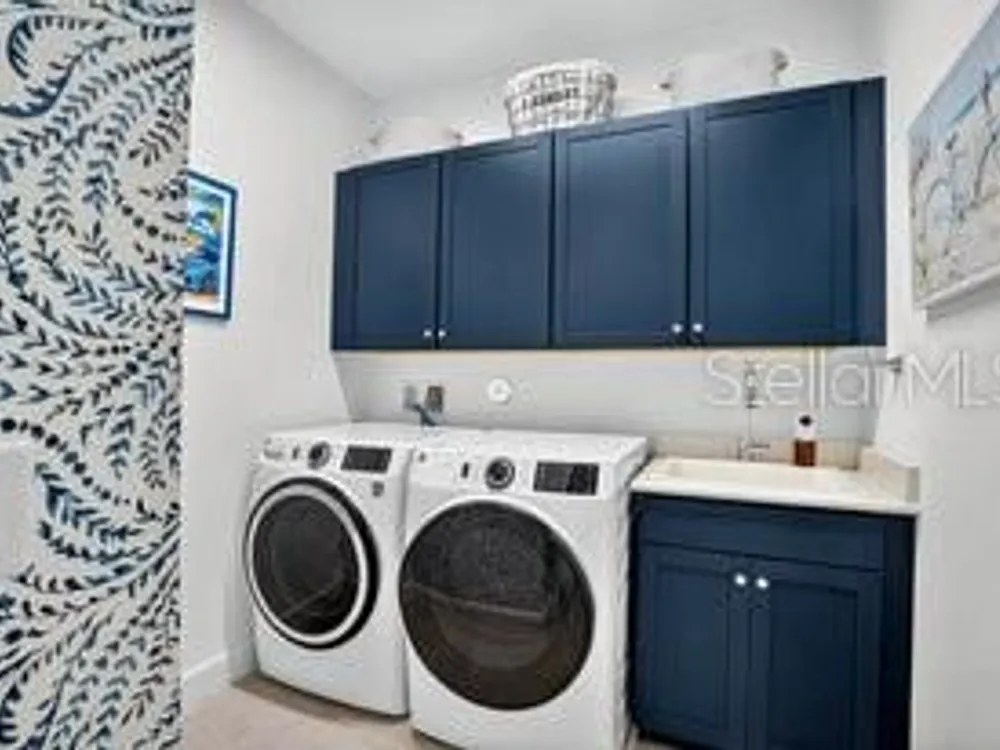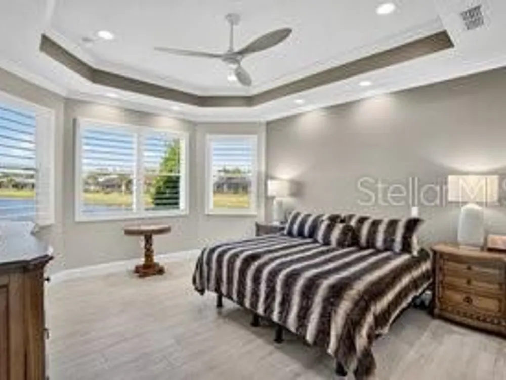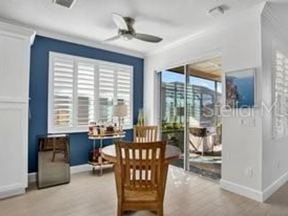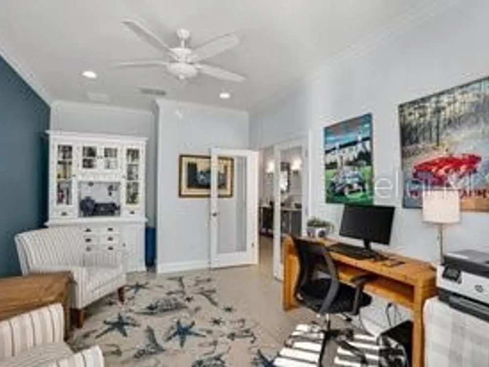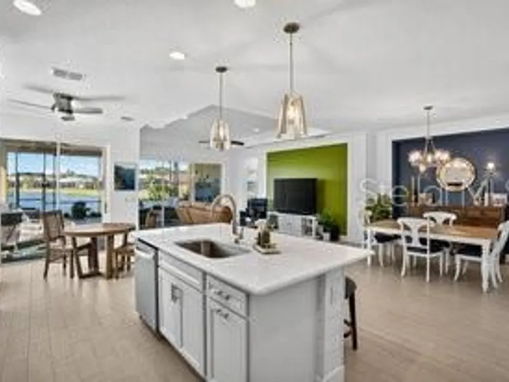 Welcome to your coastal-inspired retreat in Latitude Margaritaville! This elegant Breeze model blends modern comfort with coastal charm, offering 2 bedrooms, 2.5 bathrooms, a 2-car garage, and a versatile flex room that easily converts into a third bedroom. Designed for effortless living and entertaining, this home captures beautiful water views from the moment you arrive. A widened walkway and glass front door lead you into a bright, open living space where natural light pours through expansive sliding glass doors. Throughout the home, you'll find 8-foot interior doors, neutral tile flooring, plantation shutters, and crown molding, all adding to the elevated coastal feel. The gourmet kitchen is the centerpiece of the home, showcasing quartz countertops, a gas range, stainless steel appliances, a new backsplash installed in 2025, soft-close cabinetry, and 42'' upper cabinets topped with crown molding. The adjacent dining area features a stylish light fixture and opens seamlessly into the spacious living room with a tray ceiling, perfect for relaxed gatherings or entertaining friends. The primary suite offers a private retreat with two walk-in closets with wood shelving and a spa-style bathroom featuring dual vanities, white cabinetry, quartz countertops, and a frameless glass walk-in shower with floor-to-ceiling tile. The guest suite provides comfort and privacy with its own en suite bath, quartz countertop, a pocket door, and wood shelving in the closet. The laundry room combines function and style with a newer washer and dryer and Serena & Lily wallpaper that infuses the space with personality. Adjacent to the garage entry, a quartz-topped stop-and-drop area with cabinetry keeps daily essentials neatly within reach. Open the sliding glass doors to your extended lanai with pavers, the perfect spot to enjoy morning coffee or evening cocktails while taking in the tranquil water views visible from every rear window. Community & Lifestyle: Designed for vibrant 55+ living, this community blends recreation, relaxation, and connection. Enjoy resort-style pools, state-of-the-art fitness center, restaurant, theater, live entertainment daily, pickleball and tennis courts, dog park, art studio, and a private beach club with shuttle service. HOA maintenance includes lawn care, exterior pest control, and access to all community amenities, so you can truly live the Margaritaville lifestyle. Roof 2021 | HVAC 2021 | Tankless Hot Water Heater 2021 Square footage received from tax rolls. All information recorded in the MLS intended to be accurate but cannot be guaranteed.