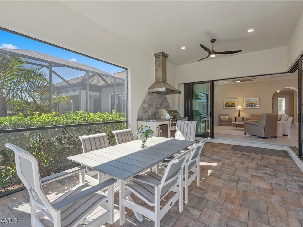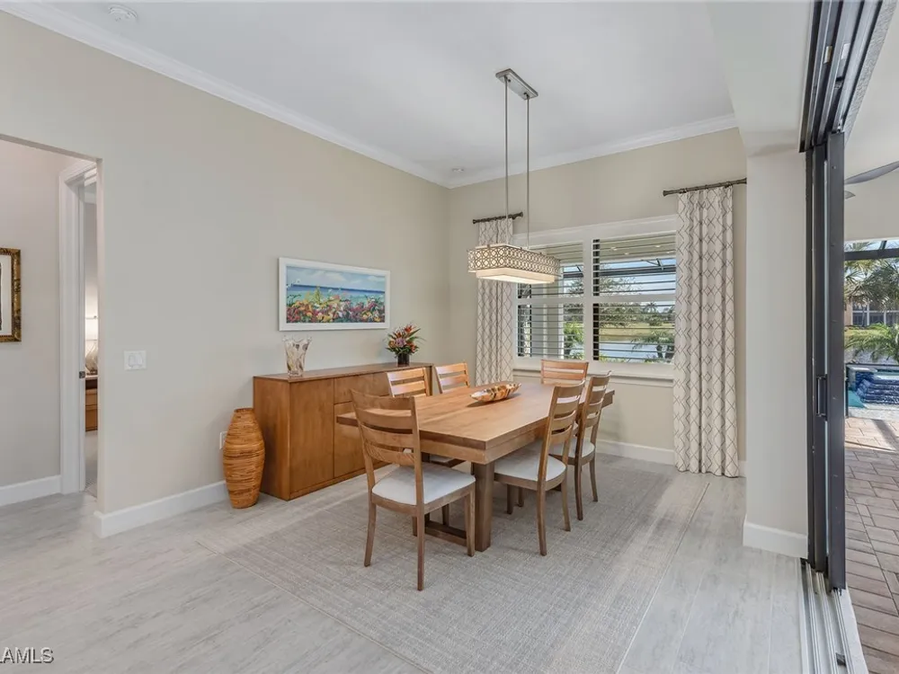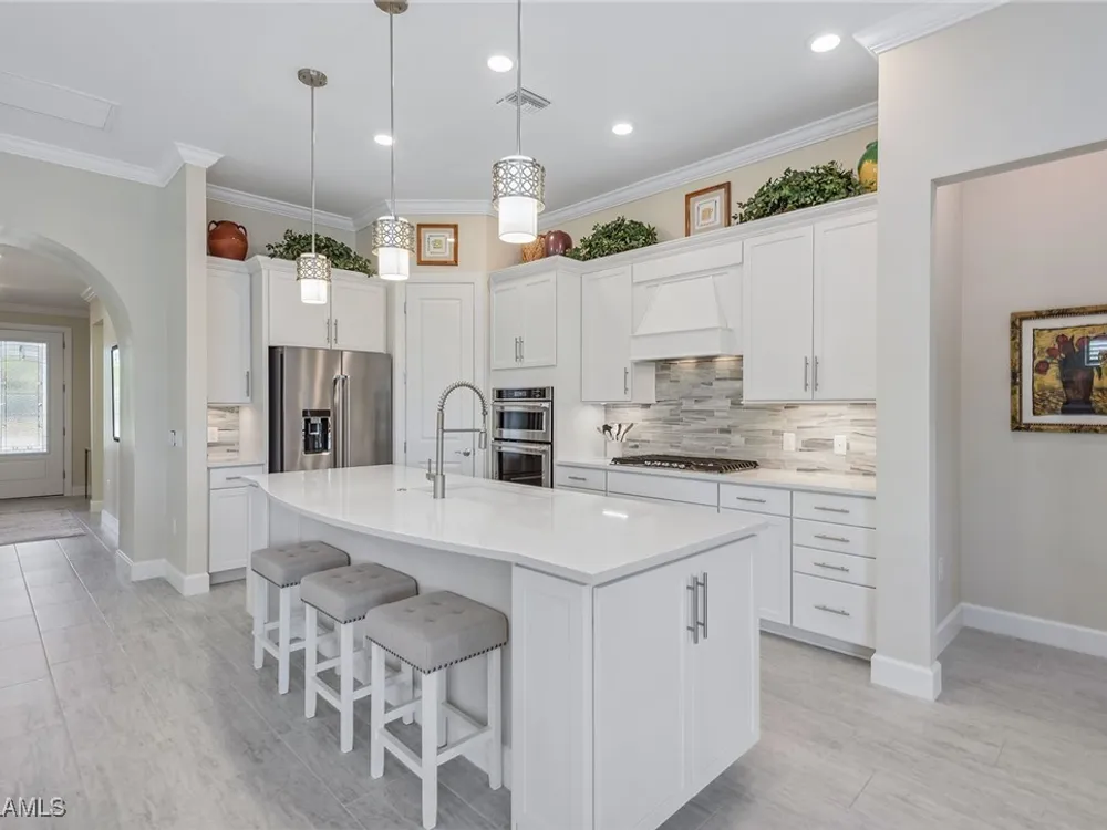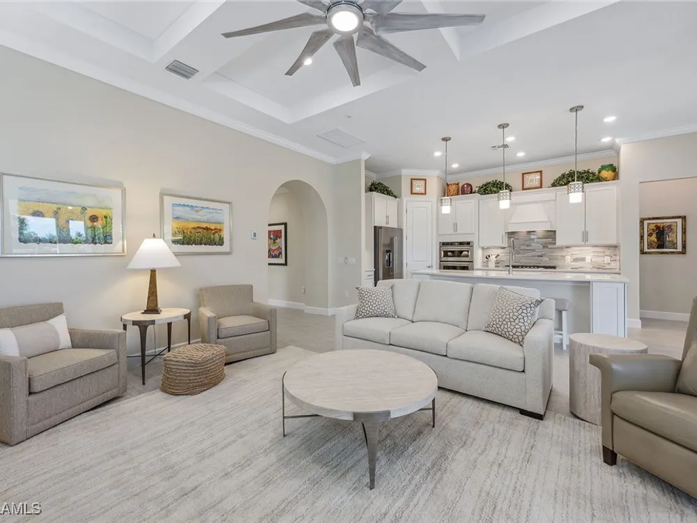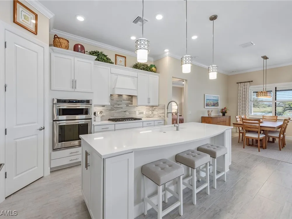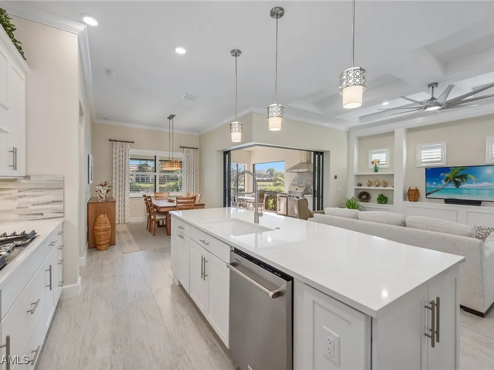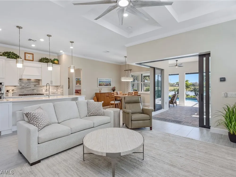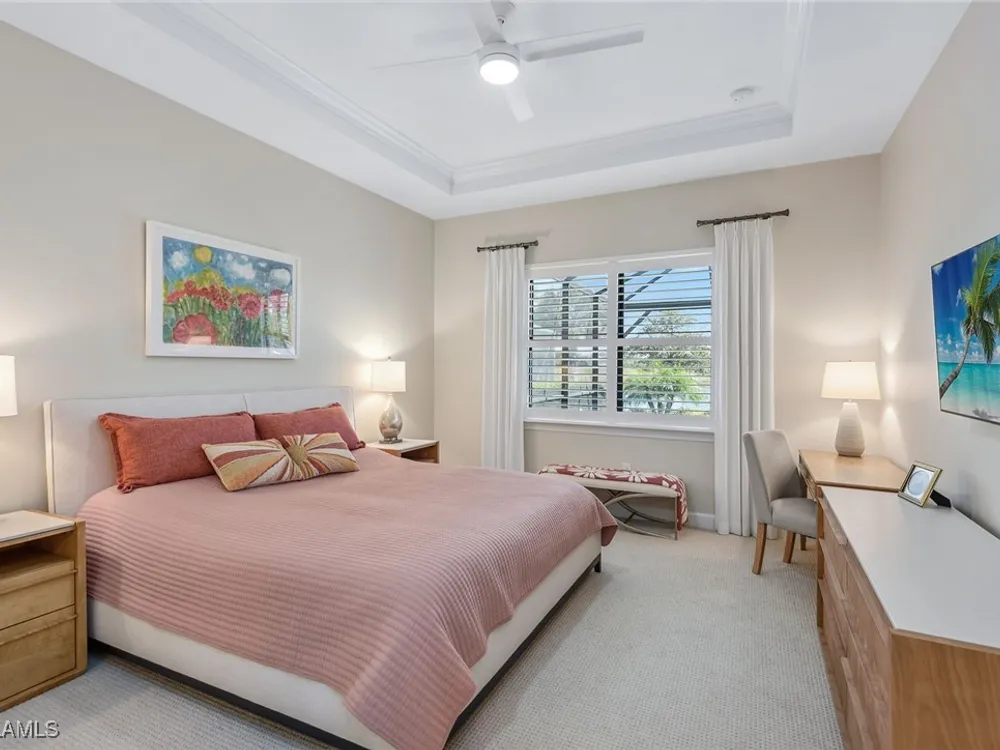 Searching for a home where serene lake views embrace your daily life? This impeccably maintained three-bedroom, three-full-bath lakeside residence in Amaranda in the distinguished community of Fiddler’s Creek offers a harmonious merging of comfort and splendor! From its vibrant landscaping and colorful blooms to its thoughtfully designed interior, every detail of this abode is crafted for elegance and ease. Go inside to discover an open-concept layout bathed in natural light, courtesy of abundant impact windows, sliders and doors. Coffered ceilings with crown molding, plantation shutters and wood-look ceramic floors add warmth and sophistication, while contemporary fans provide a modern touch. This incredible home offers plentiful natural light and is like a new home without the wait or stress of building. Entertain effortlessly in the living and dining areas, while the open kitchen creates an ideal focal point with its sleek white cabinetry, gleaming quartz countertops, natural gas cooktop, wall oven and premium stainless appliances. The pendant-lit island and generous pantry make it as functional as it is stylish. Your primary suite is an oasis, featuring a tray ceiling, walk-in closet, and spa-like en suite with a dual vanity and multi-head shower for ultimate relaxation. French doors lead to a bonus study, offering a versatile space for work or leisure. The expansive screened-in lanai is another area where this dwelling shines. Pocketing corner doors create a seamless transition between indoor and outdoor living, leading to a pristine saltwater pool and spa with breathtaking lake views. The patio’s outdoor kitchen with its stylish tile backsplash and built-in grill is ideal for weekend get-togethers, while electric shutters provide convenience and protection. Additional highlights include an attached two-car garage and a laundry room with built-in shelving and a sink. Venture beyond your tranquil street to uncover the many perks of residing in Fiddler’s Creek. This exclusive, gated community features miles of scenic promenades for biking and jogging, profuse greenery and world-class amenities. Stay active with a state-of-the-art fitness center, professional trainers and group classes, or unwind in the hot tub, sauna and steam room. Tennis and pickleball lovers will love the year-round programs, while golf enthusiasts can treat themselves to the new clubhouse and newly renovated championship course with immediate optional membership. An extensive social calendar fosters a sense of camaraderie. Ideally just minutes from downtown Naples and Marco Island, this home offers easy access to stunning beaches, excellent restaurants, boutique shops, yacht clubs and endless recreational sports. Memberships in golf, beach and marina clubs are optional and sure to enhance your experience. Grab this exceptional opportunity today!