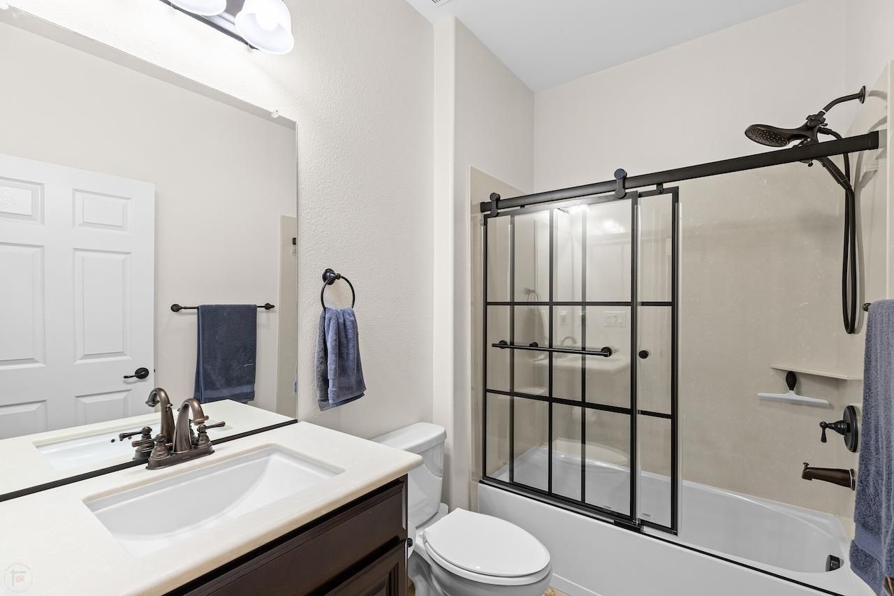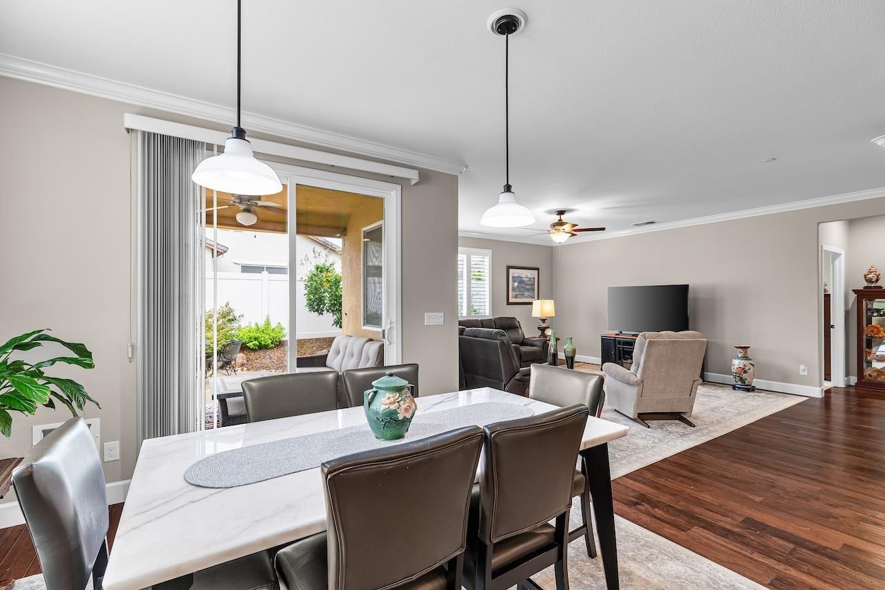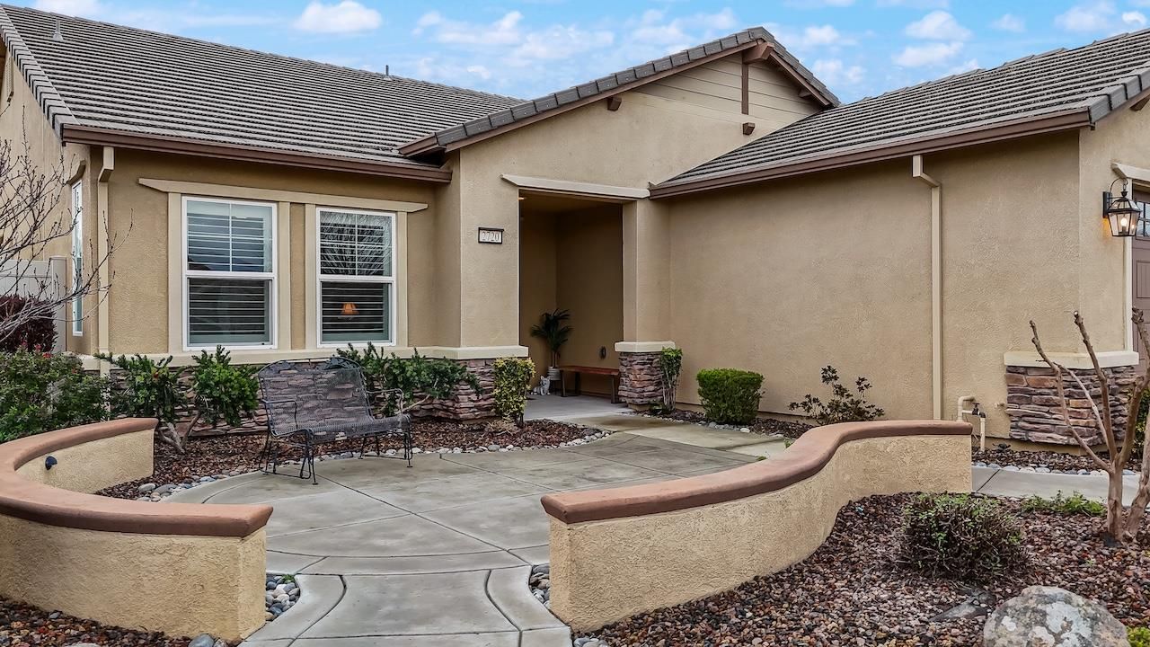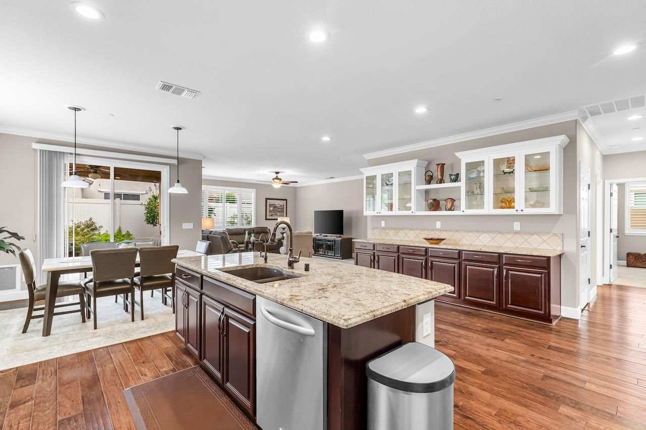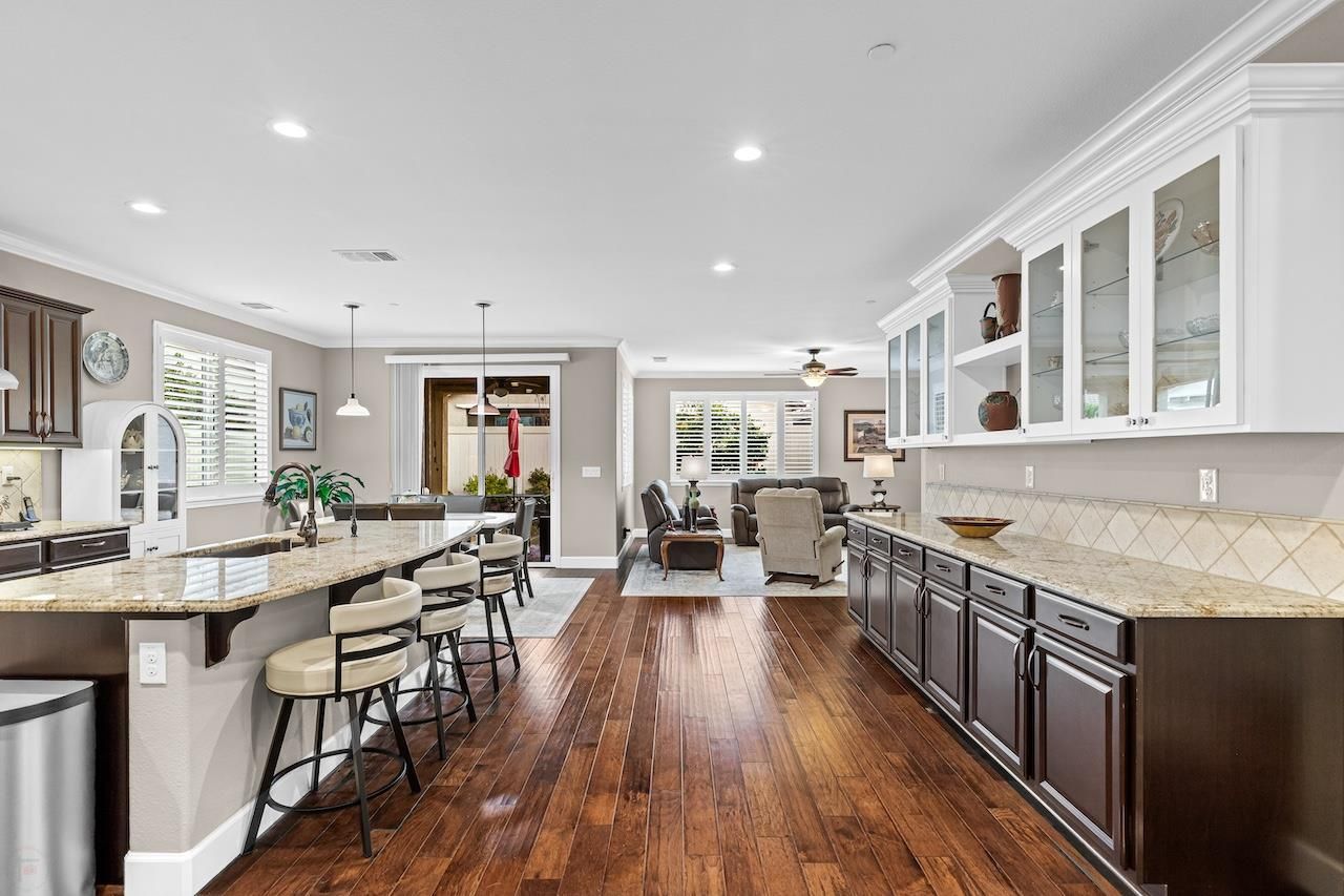 Meticulous Pioneer model is loaded with upgrades!! Engineered hardwood flooring, plantation shutters, freshly painted interior, crown molding in living room, water softener, tankless water heater, 3 true bedrooms (each with closet) have lighted ceiling fans, kitchen features slab granite counters, tumbled-tile backsplash, stainless appliances, 5-burner gas cooktop, SS fridge stays, island with sink & breakfast bar, slide-outs, pantry closet, built-in buffet has newly added upper cabinets with glass doors, dining area has 2 new lights, primary BR includes 2 sinks, stall shower, newer shower head, walk-in closet & tile floor, guest bath has new frameless shower doors & new shower head, laundry room has electric dryer hookup, cabinetry, sink & tile floor, finished & painted extended Super' garage with abundant storage cabinets, backyard features a covered patio with roll-down sunscreen, gas-plumbed for BBQ, stamped concrete, fruit trees and shed. Take a look at this dynamite home!! Woodbridge is a 55+ active adult community with a clubhouse, pool, softball field, putting green, tennis court, pickle ball courts & much more!