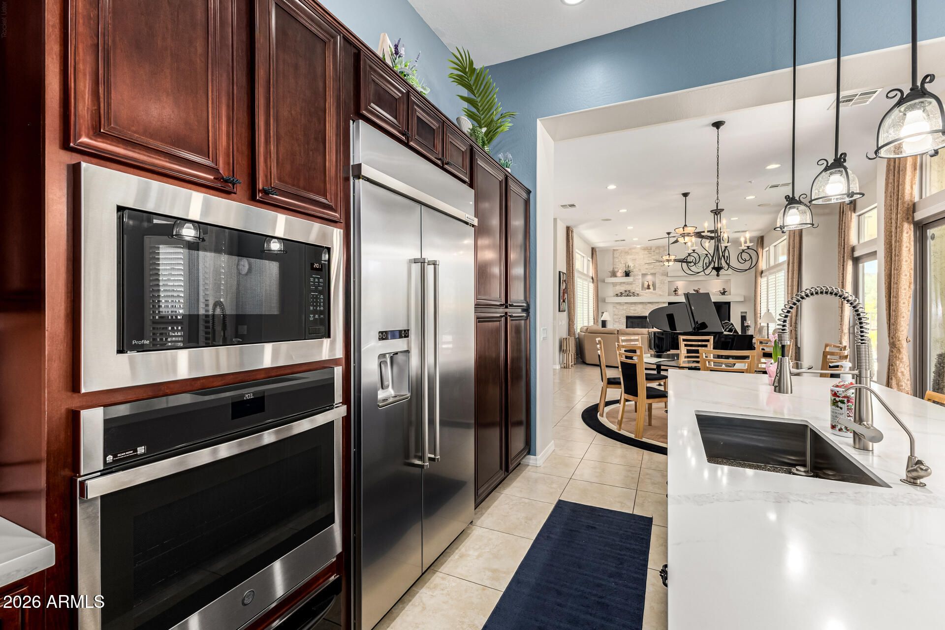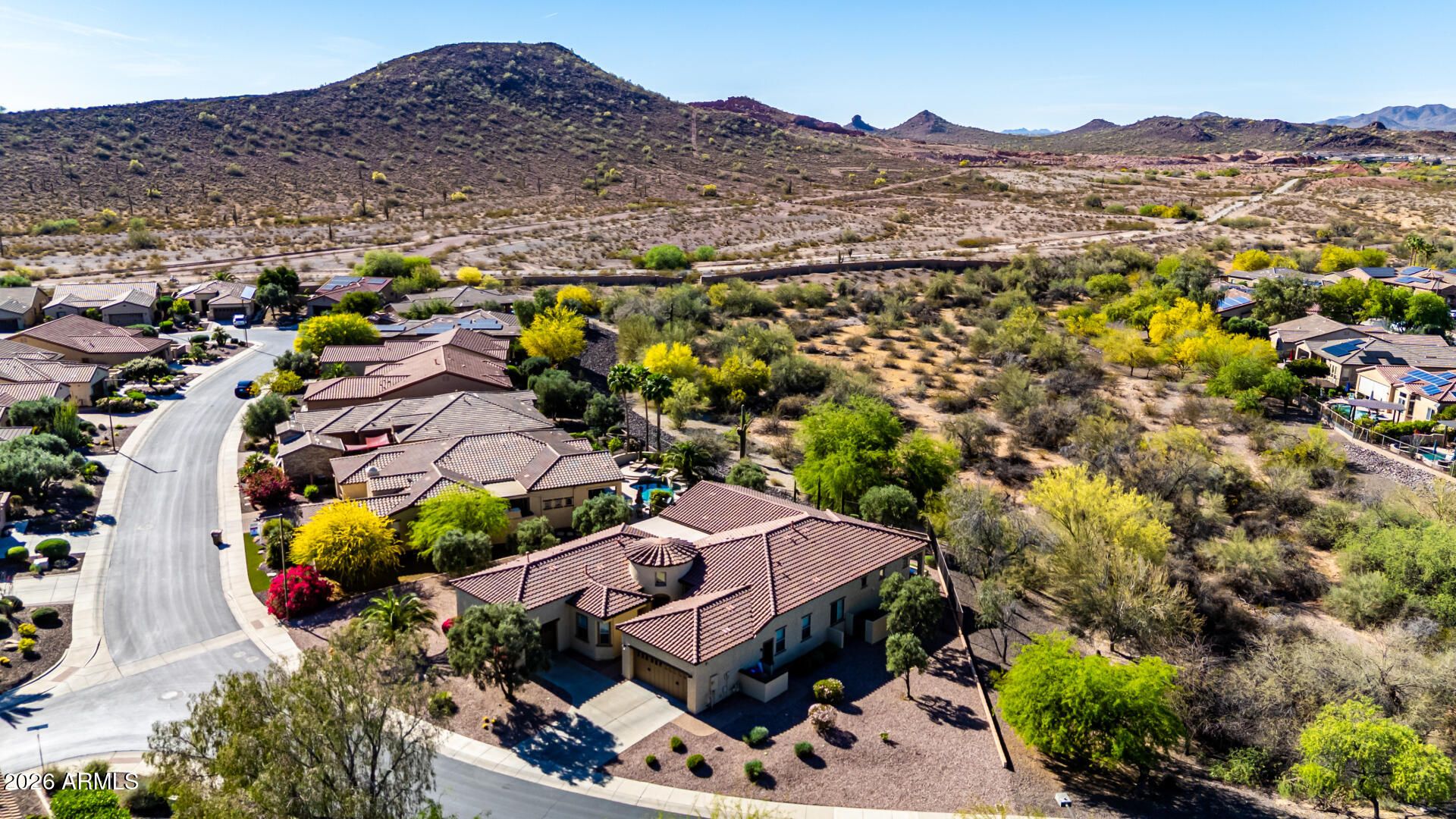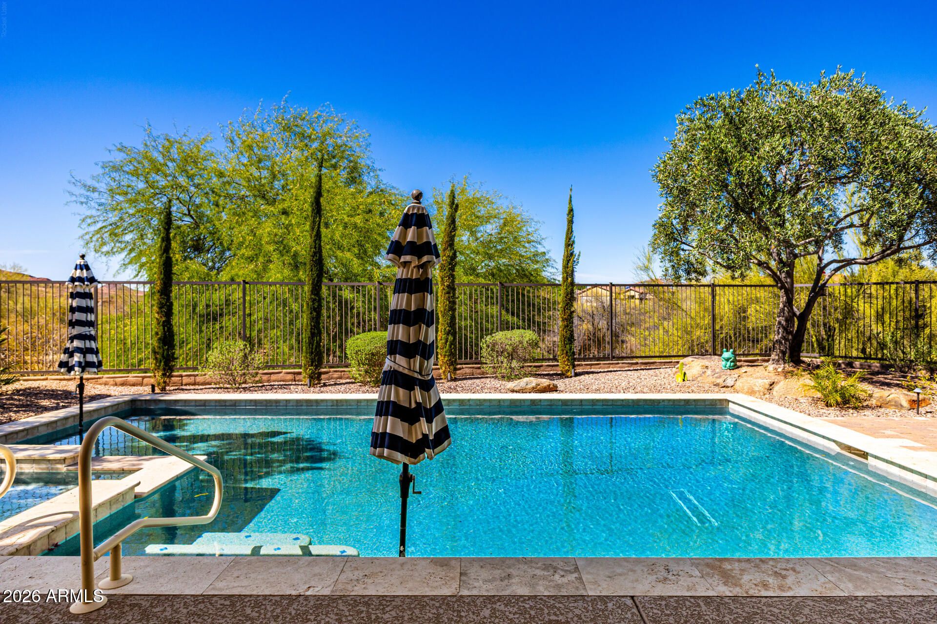 Experience refined desert living in this exceptional home in the prestigious Trilogy at Vistancia, a premier 55+ resort community. Situated on one of the largest lots (15,044 sq ft) bordering natural vegetation with stunning mountain views, this property offers rare privacy and space. Enjoy a sparkling heated pool and spa with Travertine tile in a beautifully designed backyard perfect for entertaining or relaxing Inside, a remodeled gourmet kitchen with a beautiful quartz slab island and luxurious primary bath elevate everyday living. This house is complemented by 12 feet ceilings, light-filled interiors and seamless indoor-outdoor flow. Resort-style community amenities, golf, dining and an active lifestyle complete this sought after retreat.