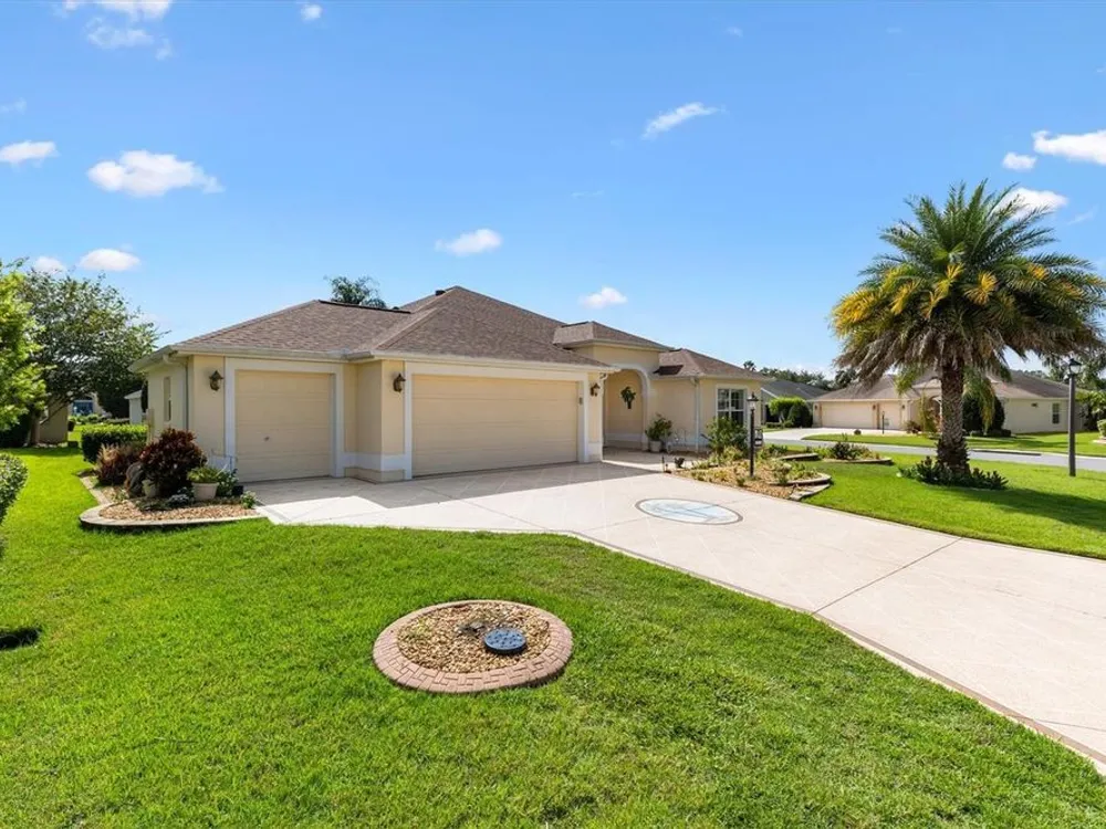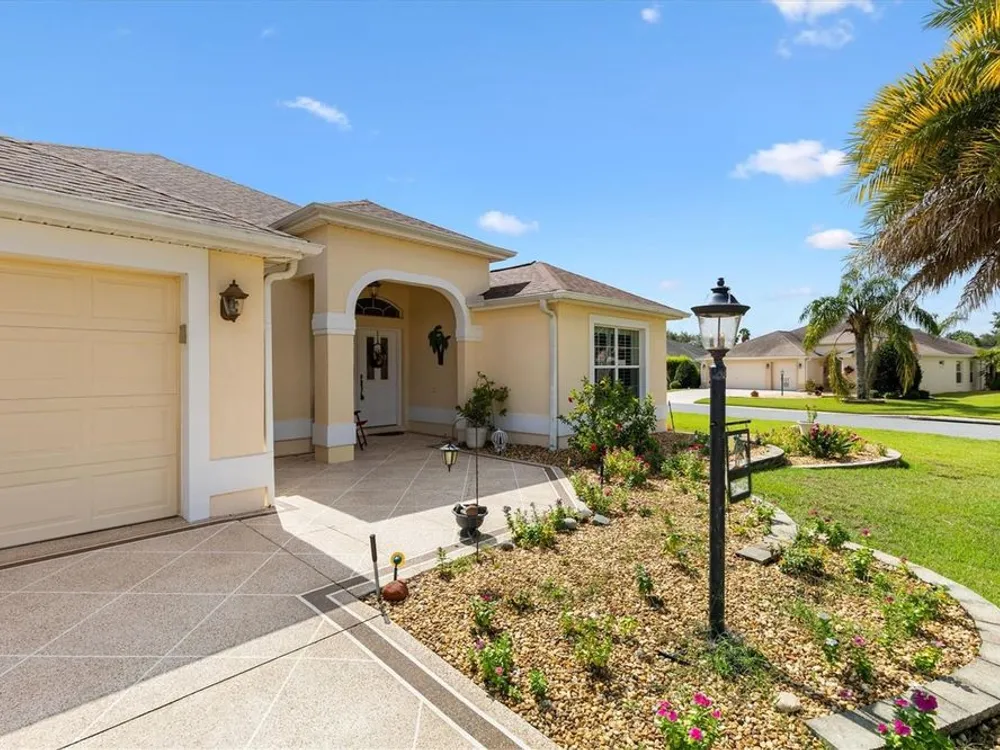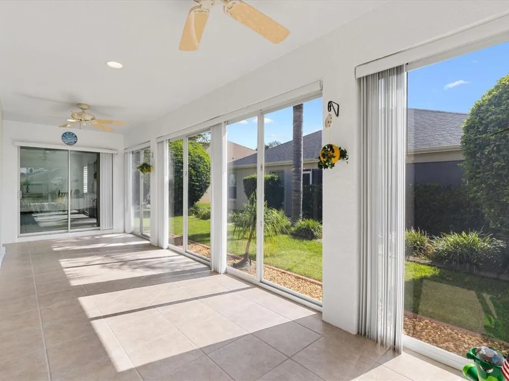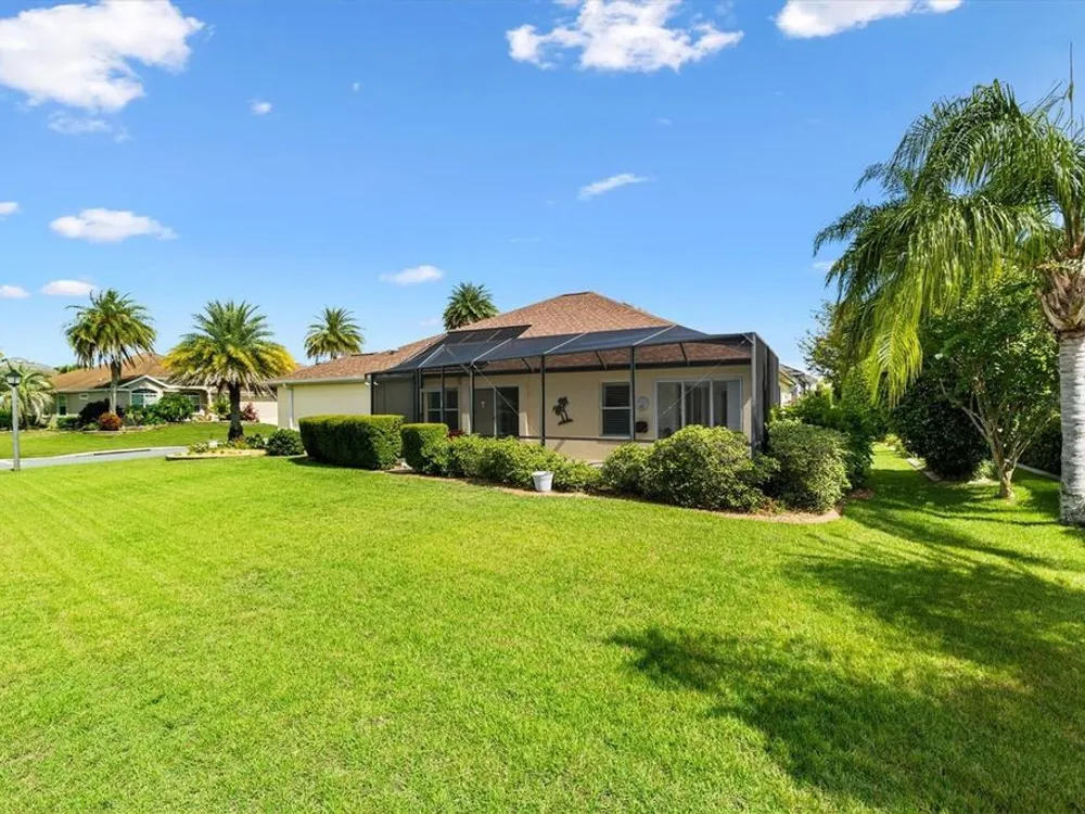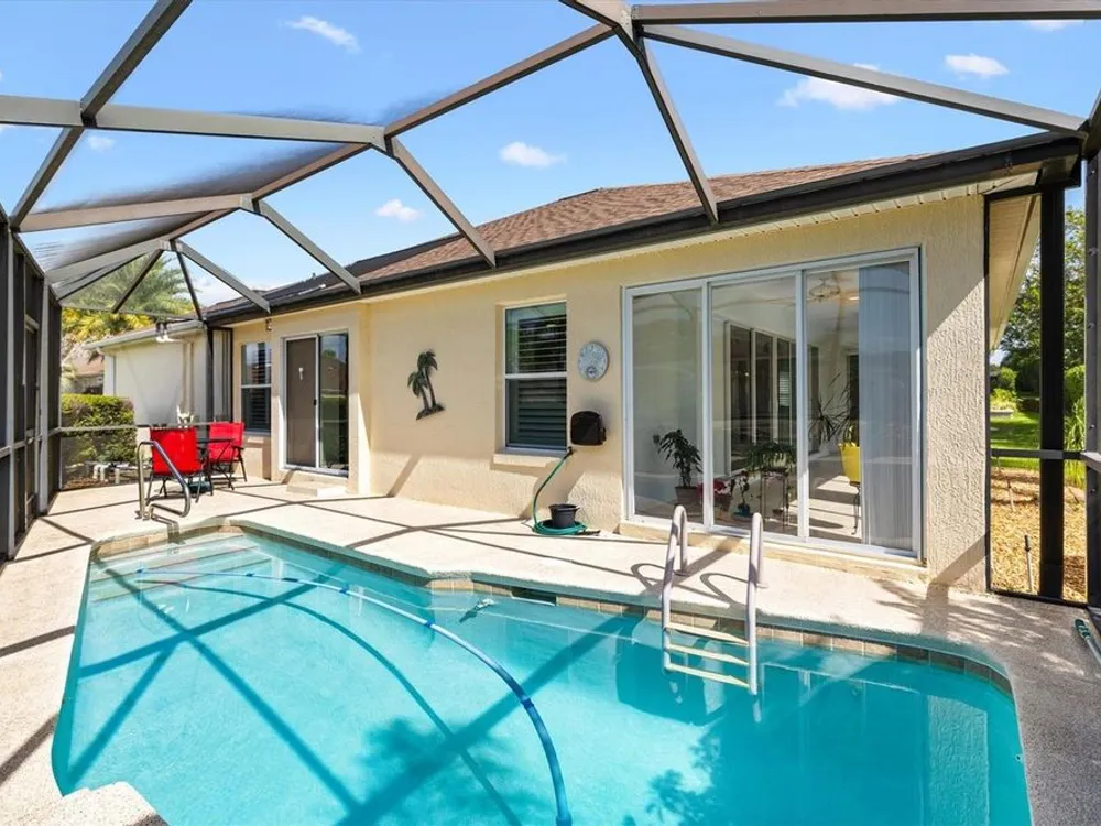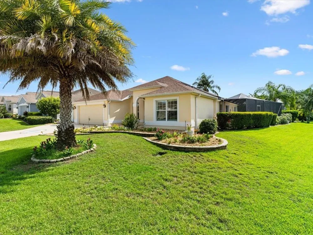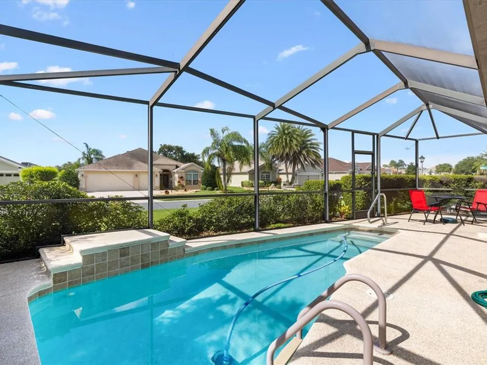 POOL & GOLF CART GARAGE ON CORNER LOT in the Village of Hemingway, this well kept 3 Bedroom 2 Bath Gardenia Pool Home with a golf cart garage is waiting for you to call home. Offered (WITH GOLF CART) partially furnished, it features plantation shutters, four solar tubes for abundant natural light, and thoughtful upgrades throughout. The kitchen is designed for both function and beauty, with light staggered cabinets, a glass-front display feature, pullout shelving in the lower cabinets, and Corian countertops. Enjoy casual meals in the breakfast nook, or entertain in the dining room, which is free of the column typical of the Gardenia model. The spacious Primary Suite boasts a tray ceiling, two walk-in closets, and a luxurious en-suite with a Roman shower and split vanities. The front bedroom includes a wall bed and built-in desk, making it ideal for extra guests and a home office. A guest bathroom separates the second and third bedrooms to complete the split floorplan guest suite and added privacy. The Living Room features a sliding door that lead to your private saltwater pool with screen enclosure. Double sliders open to enter the east-facing lanai in the rear of the home. Additional highlights include a 2024 roof, brand-new HVAC (July 2025), and proximity to Havana Country Club with championship golf and a popular restaurant. This home offers a sought-after blend of indoor and outdoor living in one of The Villages’ most convenient locations. Enjoy The Villages, FL, lifestyle with abundant amenities for you to attend golfing, shopping, dining, and enjoy many entertainment choices, club meetings, medical services, and more, all accessible by a golf cart.