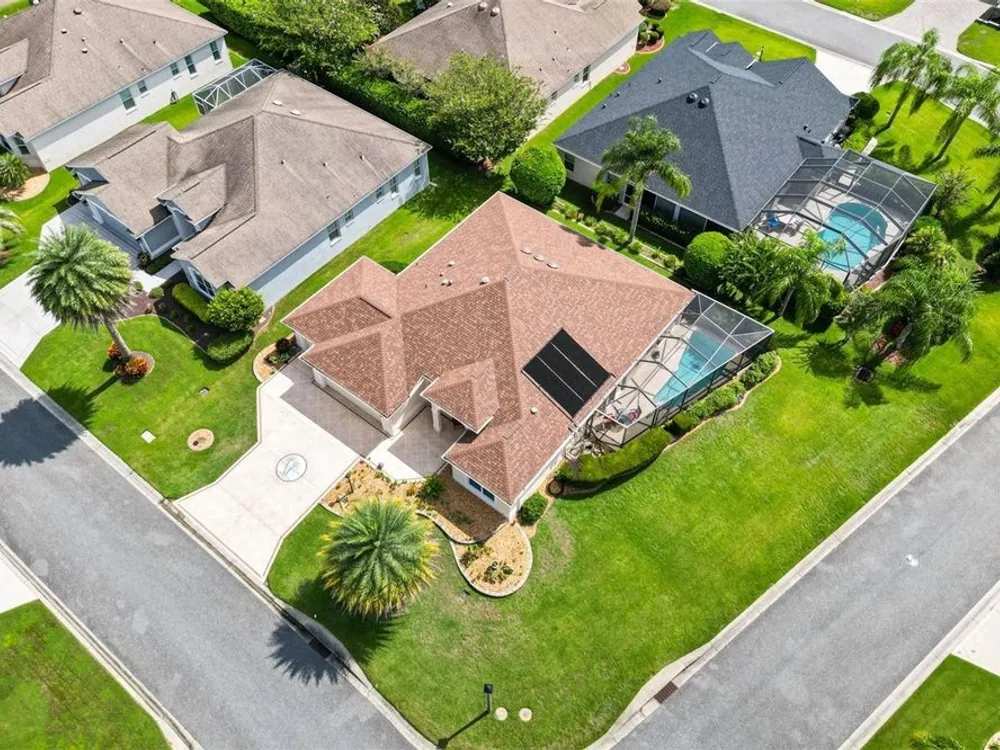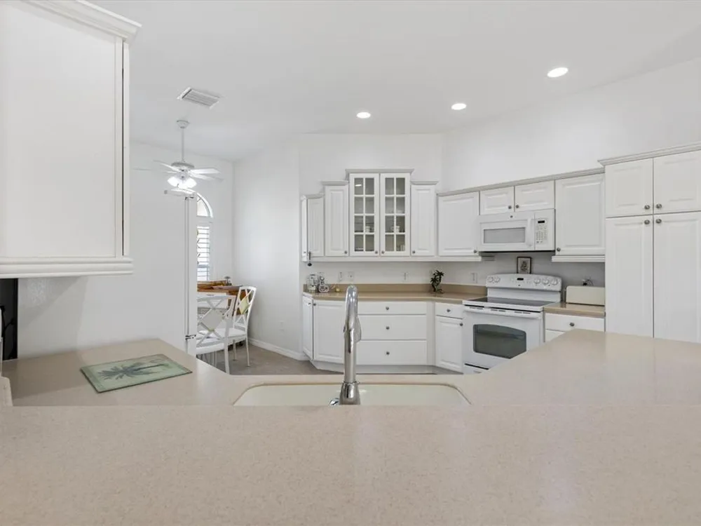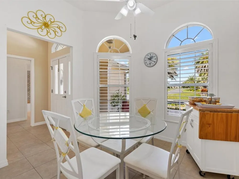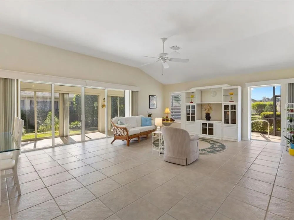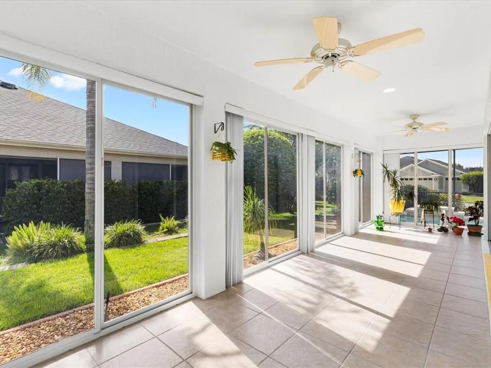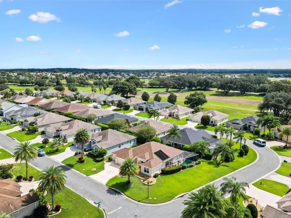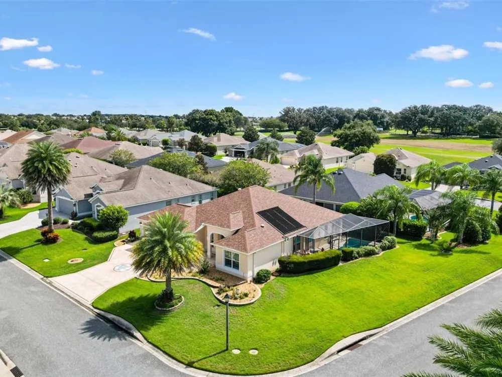 POOL & GOLF CART GARAGE ON CORNER LOT in the Village of Hemingway, this well kept 3 Bedroom 2 Bath Gardenia Pool Home with a golf cart garage is waiting for you to call home. Offered (WITH GOLF CART) partially furnished, it features plantation shutters, four solar tubes for abundant natural light, and thoughtful upgrades throughout. The kitchen is designed for both function and beauty, with light staggered cabinets, a glass-front display feature, pullout shelving in the lower cabinets, and Corian countertops. Enjoy casual meals in the breakfast nook, or entertain in the dining room, which is free of the column typical of the Gardenia model. The spacious Primary Suite boasts a tray ceiling, two walk-in closets, and a luxurious en-suite with a Roman shower and split vanities. The front bedroom includes a wall bed and built-in desk, making it ideal for extra guests and a home office. A guest bathroom separates the second and third bedrooms to complete the split floorplan guest suite and added privacy. The Living Room features a sliding door that lead to your private saltwater pool with screen enclosure. Double sliders open to enter the east-facing lanai in the rear of the home. Additional highlights include a 2024 roof, brand-new HVAC (July 2025), and proximity to Havana Country Club with championship golf and a popular restaurant. This home offers a sought-after blend of indoor and outdoor living in one of The Villages’ most convenient locations. Enjoy The Villages, FL, lifestyle with abundant amenities for you to attend golfing, shopping, dining, and enjoy many entertainment choices, club meetings, medical services, and more, all accessible by a golf cart.