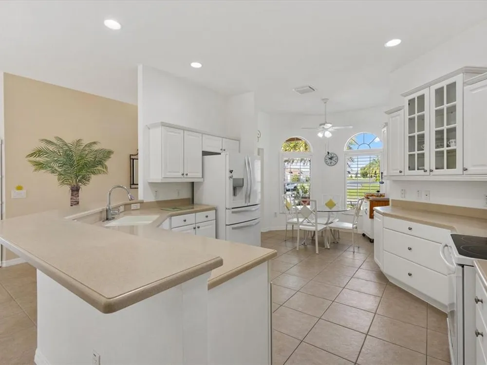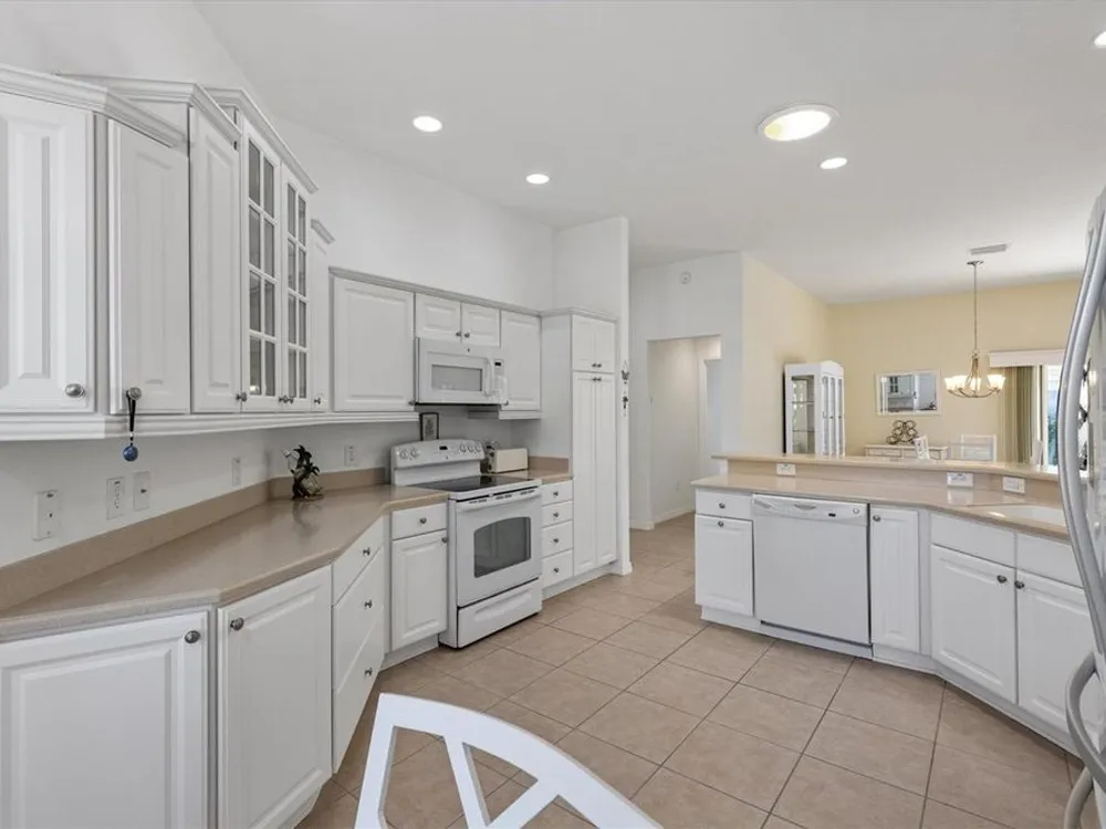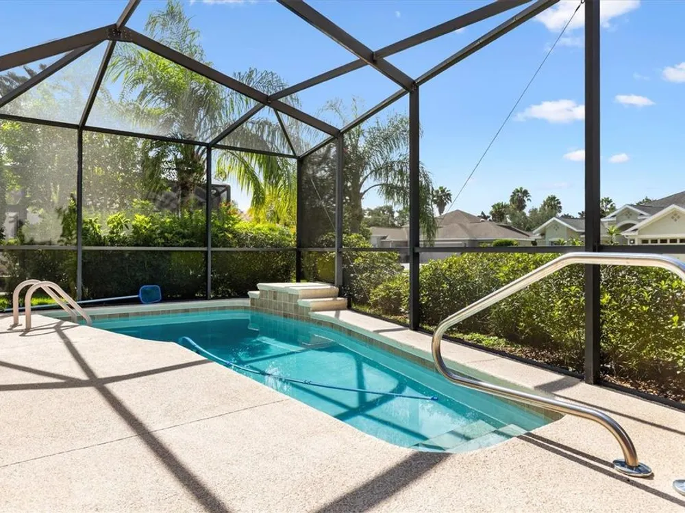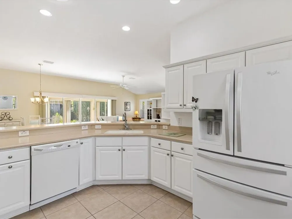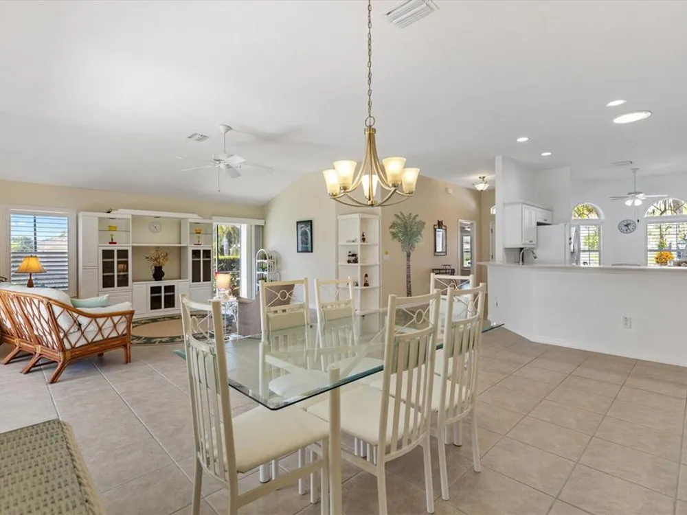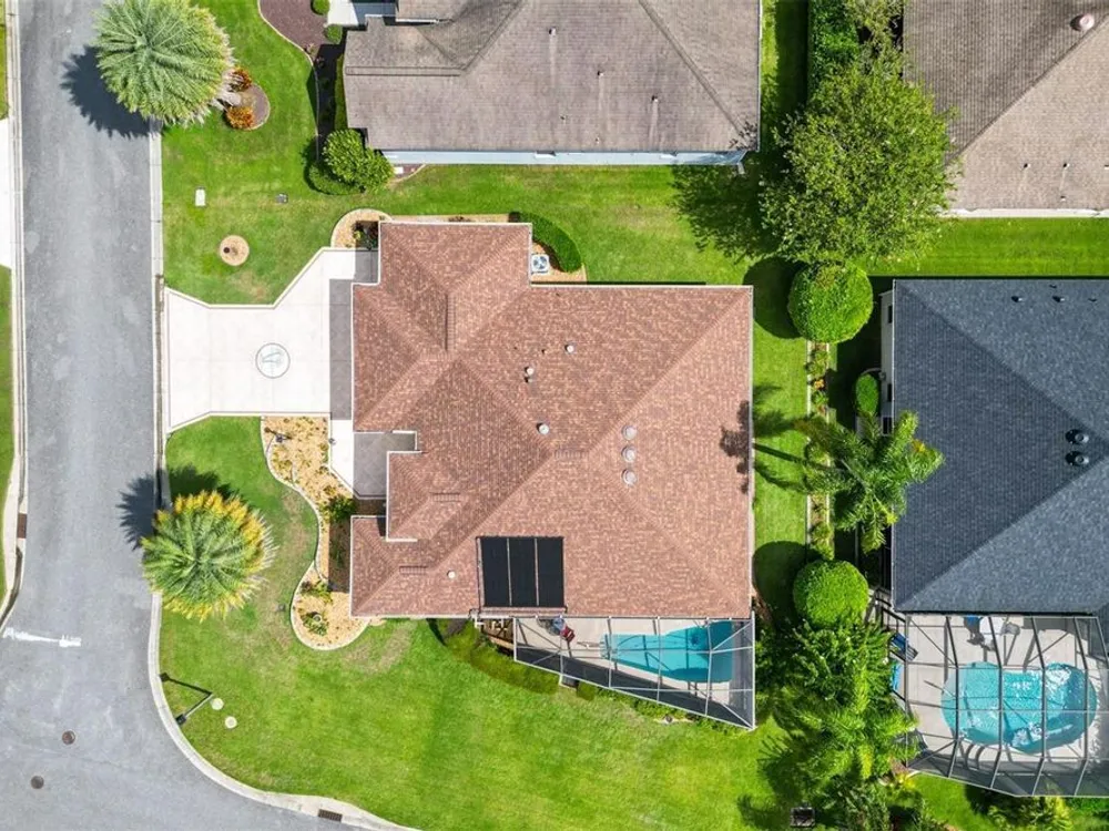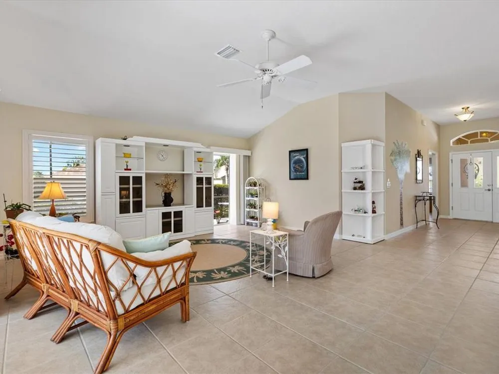POOL & GOLF CART GARAGE ON CORNER LOT in the Village of Hemingway, this well kept 3 Bedroom 2 Bath Gardenia Pool Home with a golf cart garage is waiting for you to call home. Offered (WITH GOLF CART) partially furnished, it features plantation shutters, four solar tubes for abundant natural light, and thoughtful upgrades throughout. The kitchen is designed for both function and beauty, with light staggered cabinets, a glass-front display feature, pullout shelving in the lower cabinets, and Corian countertops. Enjoy casual meals in the breakfast nook, or entertain in the dining room, which is free of the column typical of the Gardenia model. The spacious Primary Suite boasts a tray ceiling, two walk-in closets, and a luxurious en-suite with a Roman shower and split vanities. The front bedroom includes a wall bed and built-in desk, making it ideal for extra guests and a home office. A guest bathroom separates the second and third bedrooms to complete the split floorplan guest suite and added privacy. The Living Room features a sliding door that lead to your private saltwater pool with screen enclosure. Double sliders open to enter the east-facing lanai in the rear of the home. Additional highlights include a 2024 roof, brand-new HVAC (July 2025), and proximity to Havana Country Club with championship golf and a popular restaurant. This home offers a sought-after blend of indoor and outdoor living in one of The Villages’ most convenient locations. Enjoy The Villages, FL, lifestyle with abundant amenities for you to attend golfing, shopping, dining, and enjoy many entertainment choices, club meetings, medical services, and more, all accessible by a golf cart.